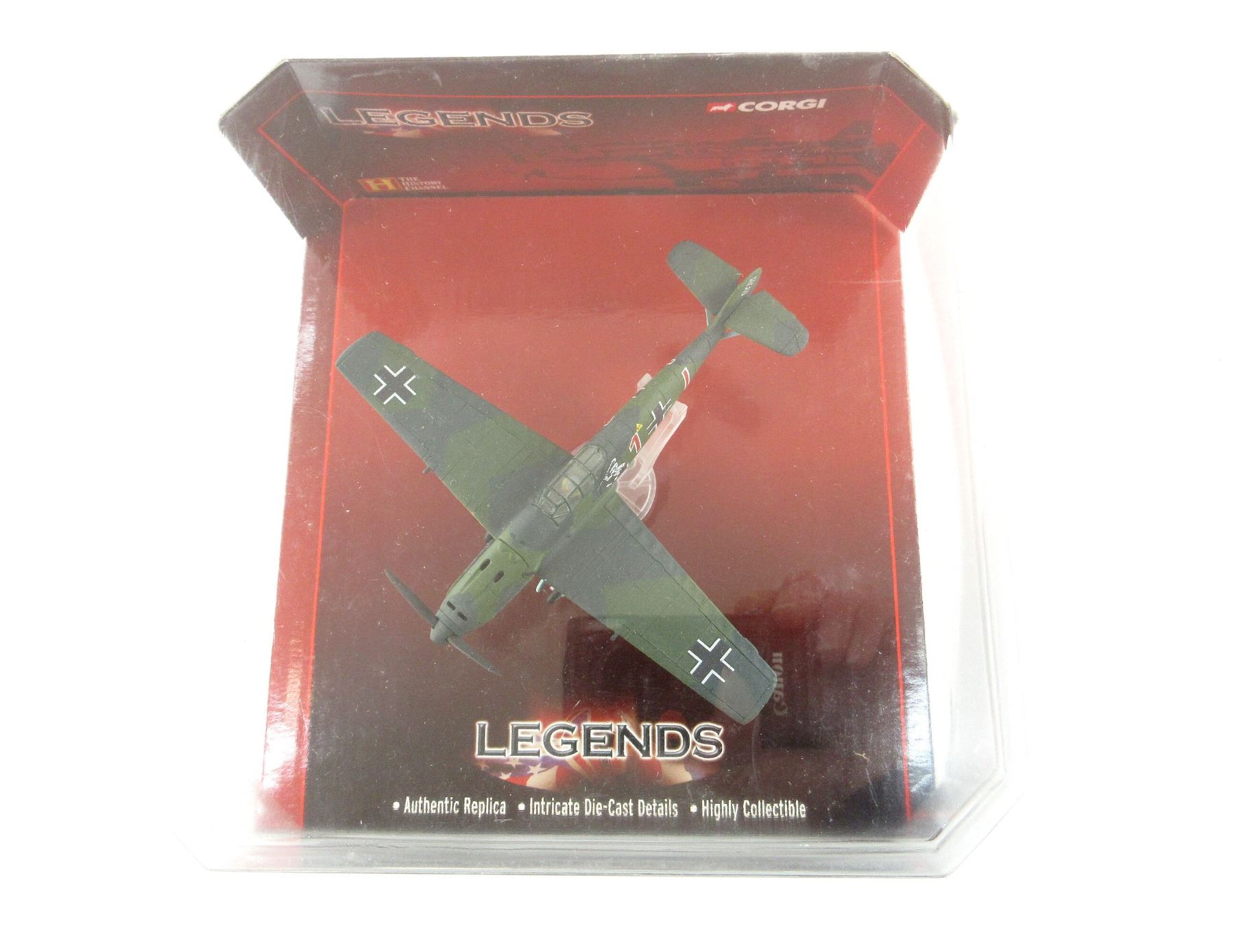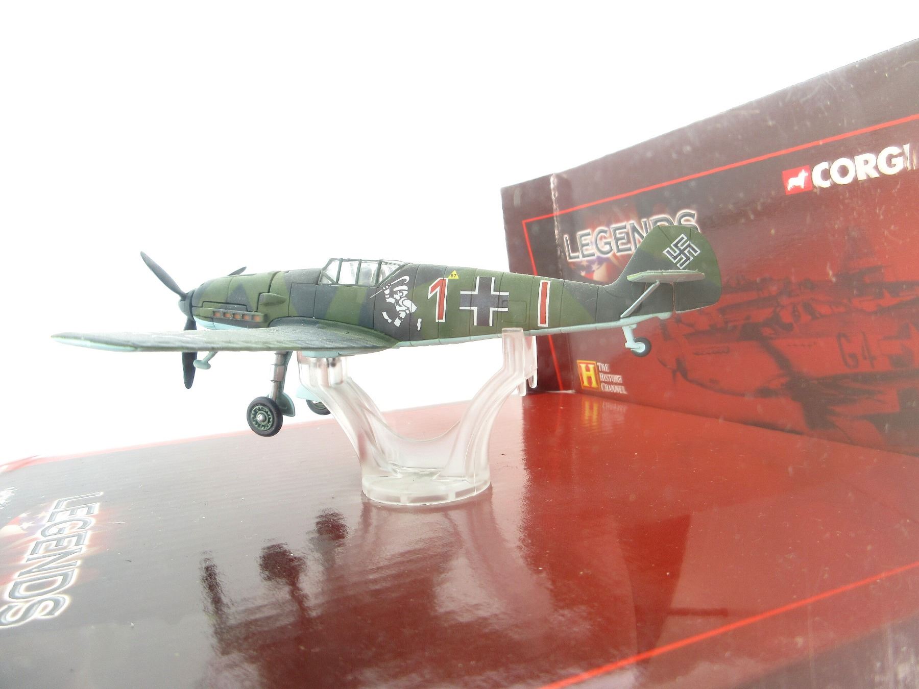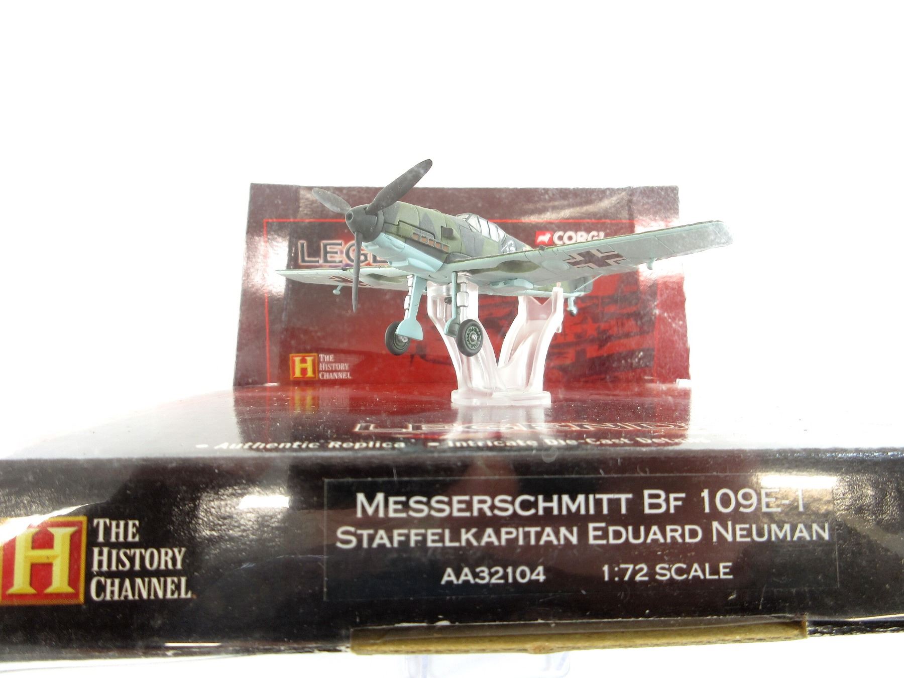 (1) CORGI LEGENDS OF FLIGHT: WWII ACES MESSERSCHMITT BF 109E-1 STAFFELKAPITAN EDUARD NEUMAN MODEL PLANE, MADE BY CORGI / THE HISTORY CHANNEL, 1:72 SCALE, APPEARS NEW OLD STOCK. SEE PHOTOS.