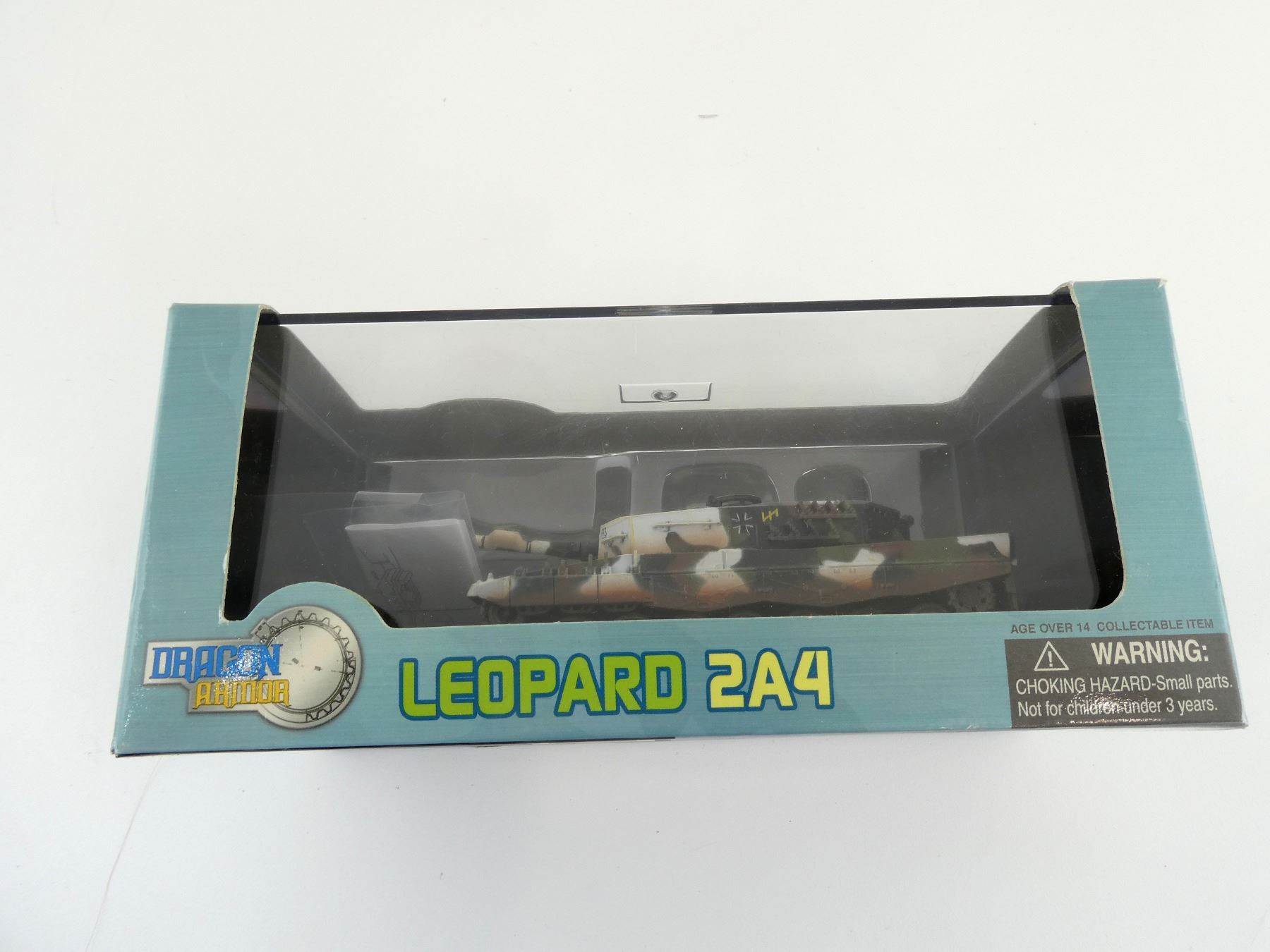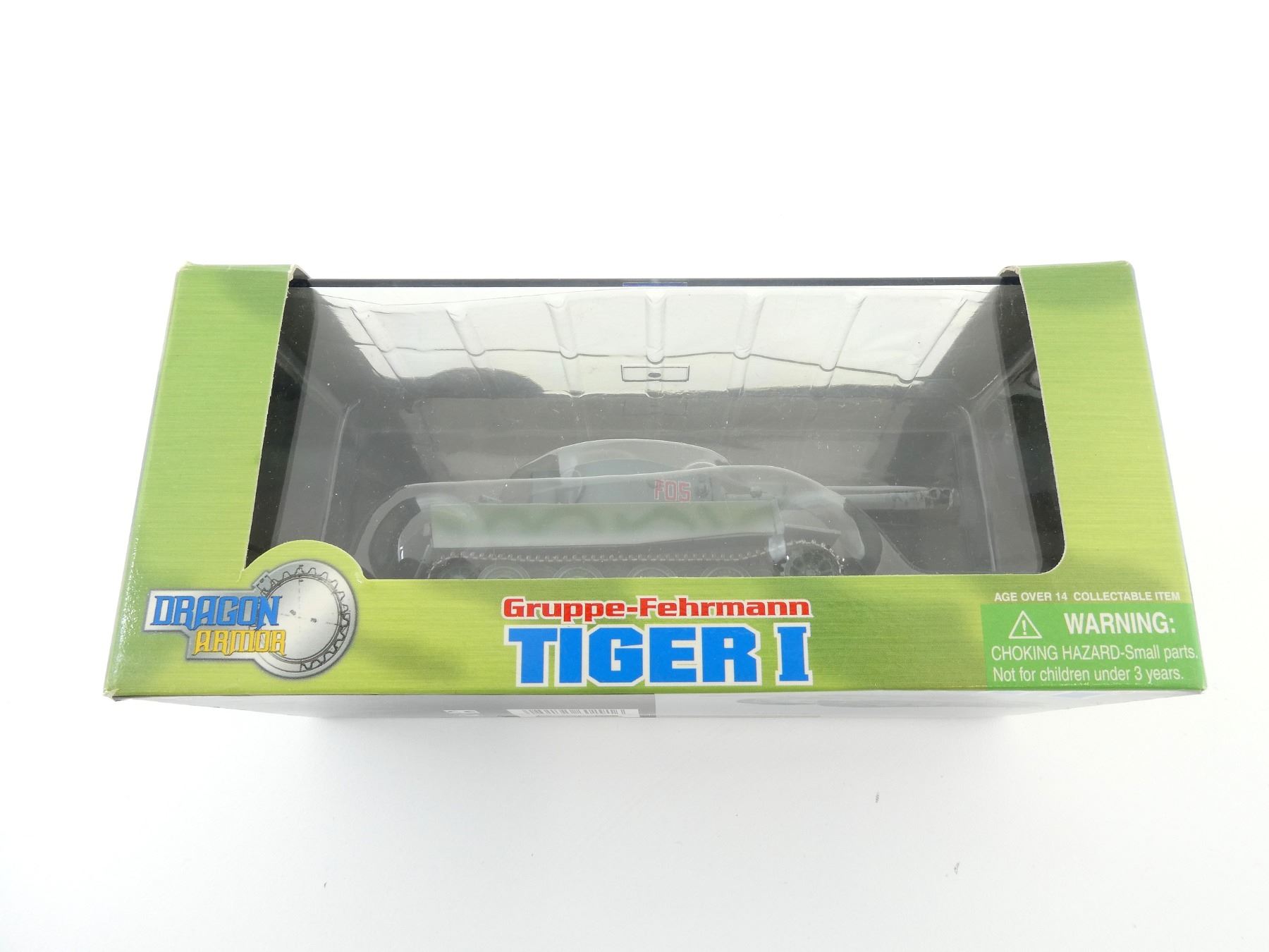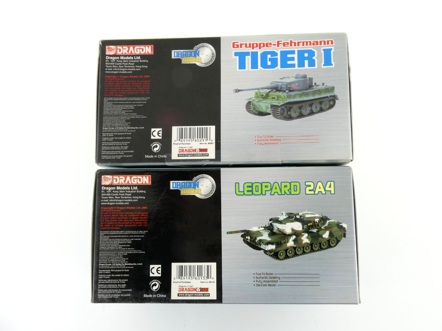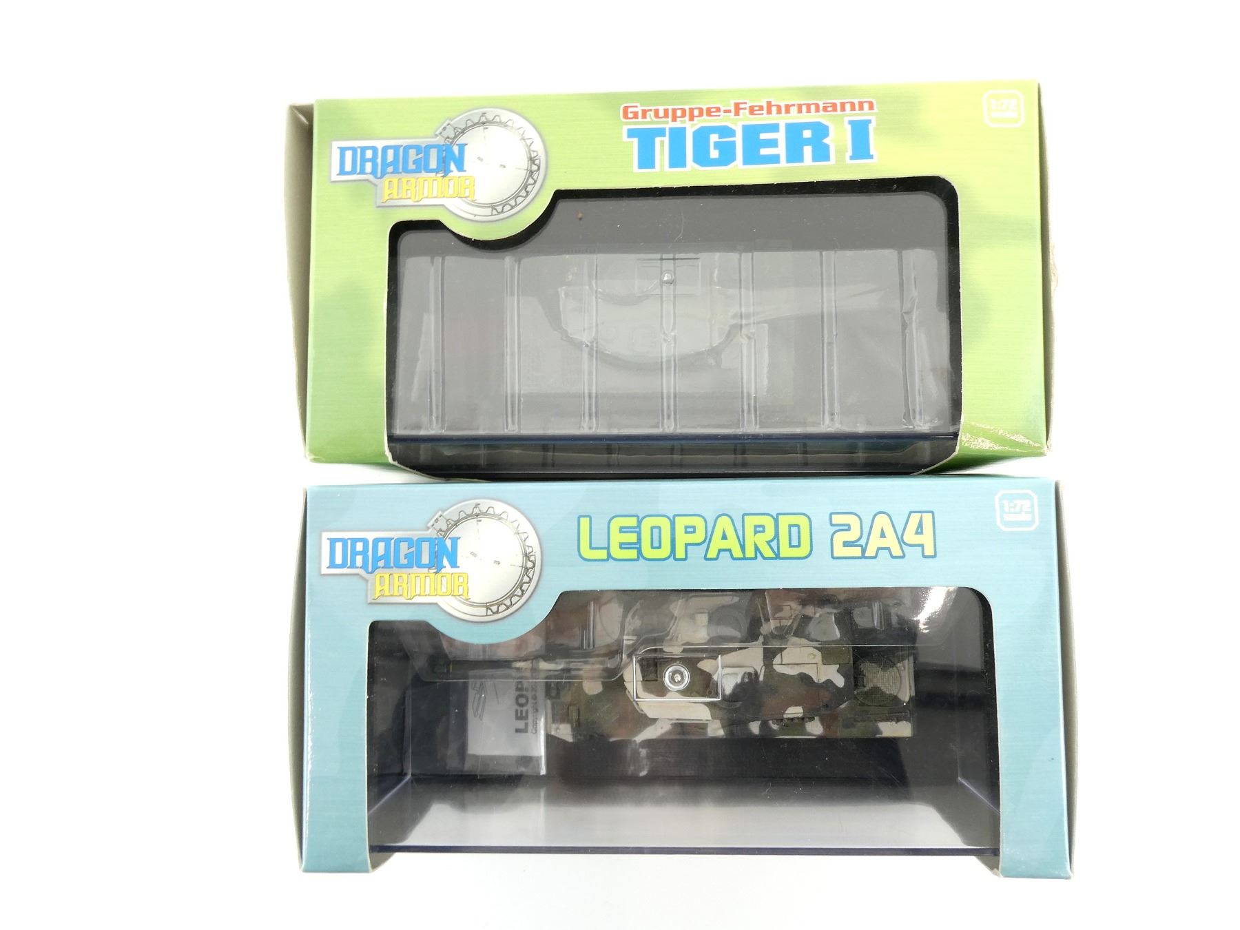 LOT INCLUDES; (1) DRAGON ARMOR GERMAN GRUPPE-FEHRMANN TIGER I MODEL TANK, 1:72 SCALE, APPEARS NEW OLD STOCK & (1) DRAGON ARMOR GERMAN LEOPARD 2A4 MODEL TANK, 1:72 SCALE, APPEARS NEW OLD STOCK. SEE PHOTOS.