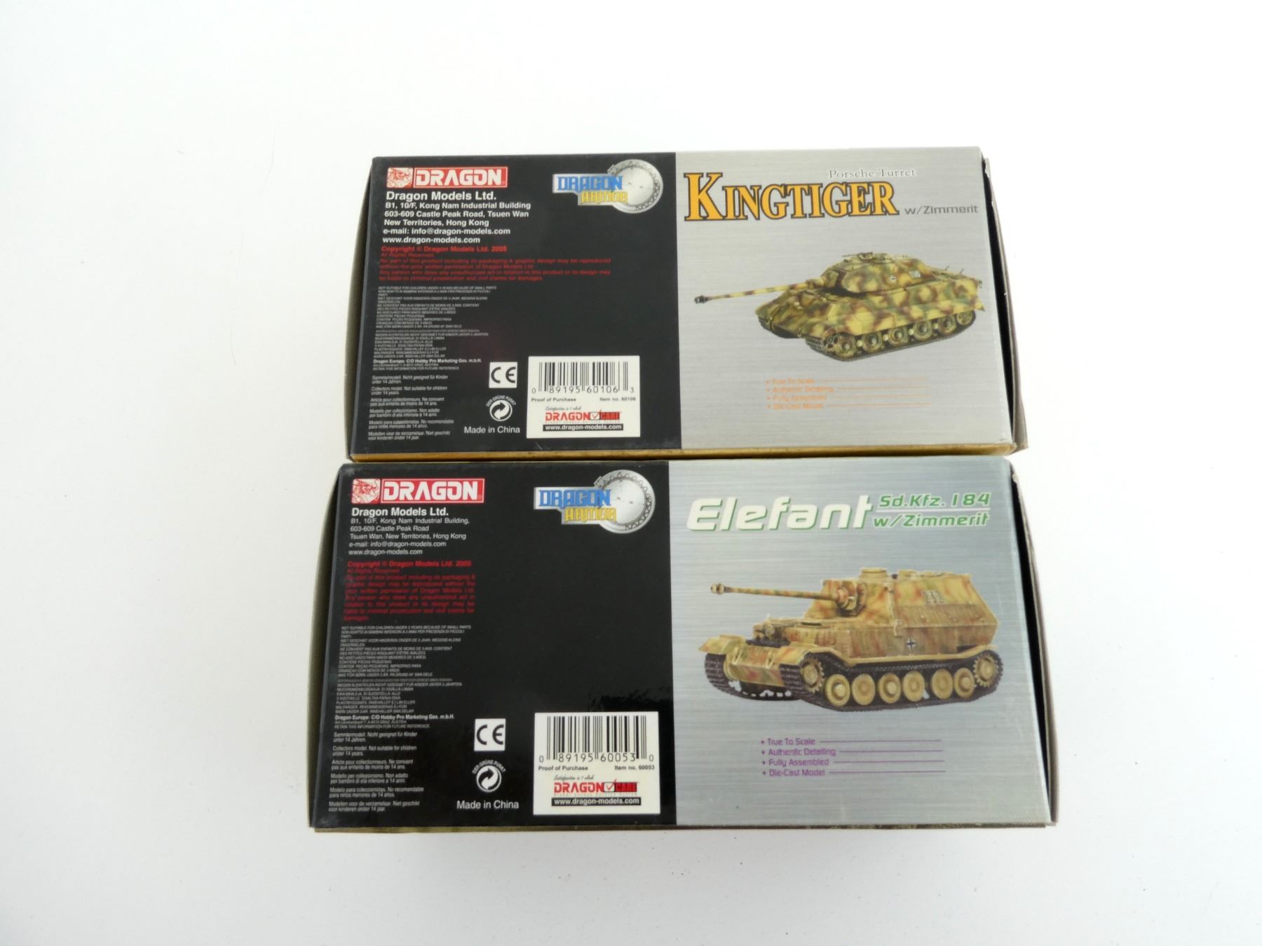 LOT INCLUDES; (1) DRAGON ARMOR GERMAN KINGTIGER PORSCHE TURRET SPZABT 501 NORMANDY 1944 MODEL TANK, 1:72 SCALE, APPEARS NEW OLD STOCK & (1) DRAGON ARMOR GERMAN ELEFANT SD.KFZ. 184 SPZJGABT 653 RUSSIA / POLAND 1944, MODEL TANK, 1:72 SCALE, APPEARS NEW OLD STOCK. SEE PHOTOS.