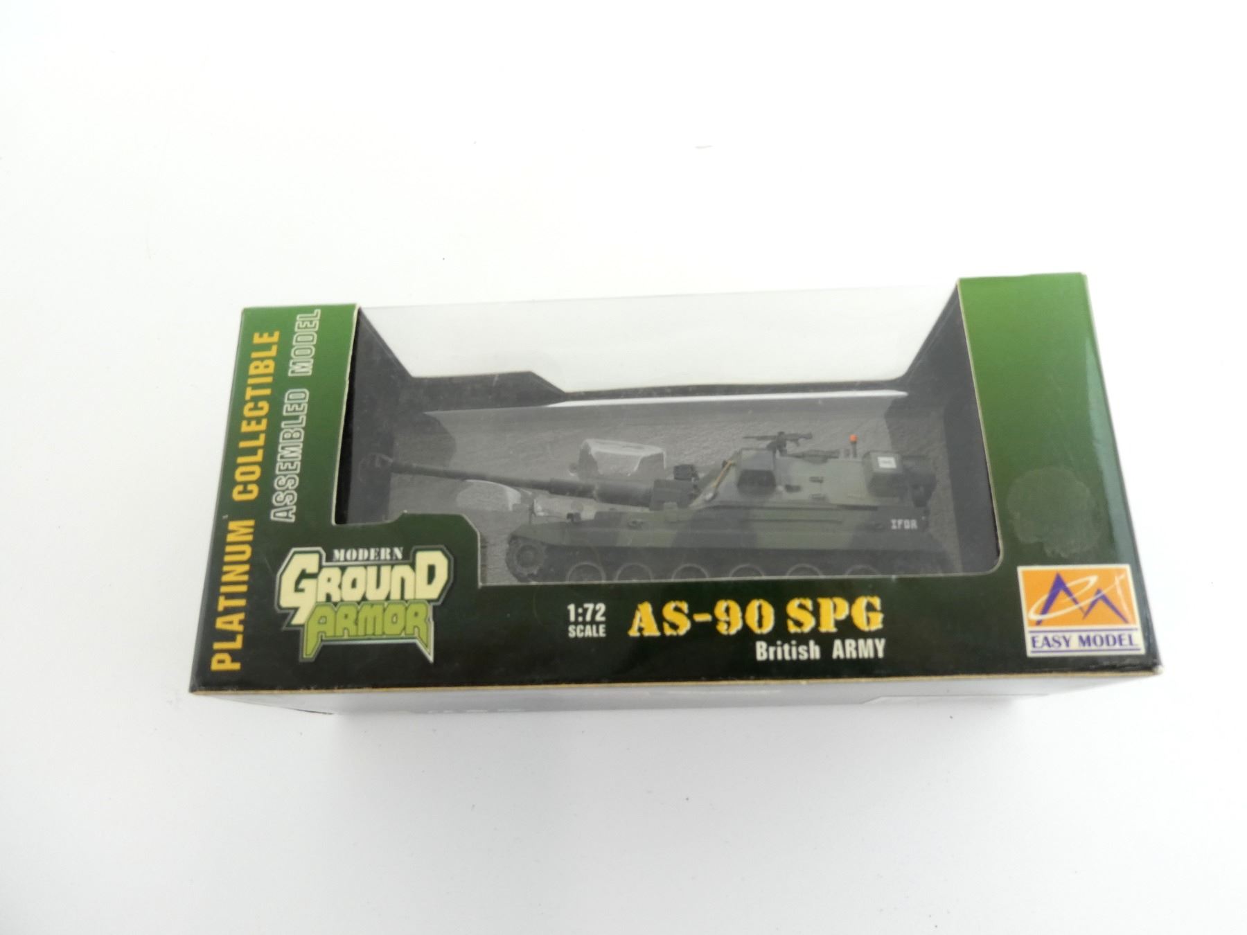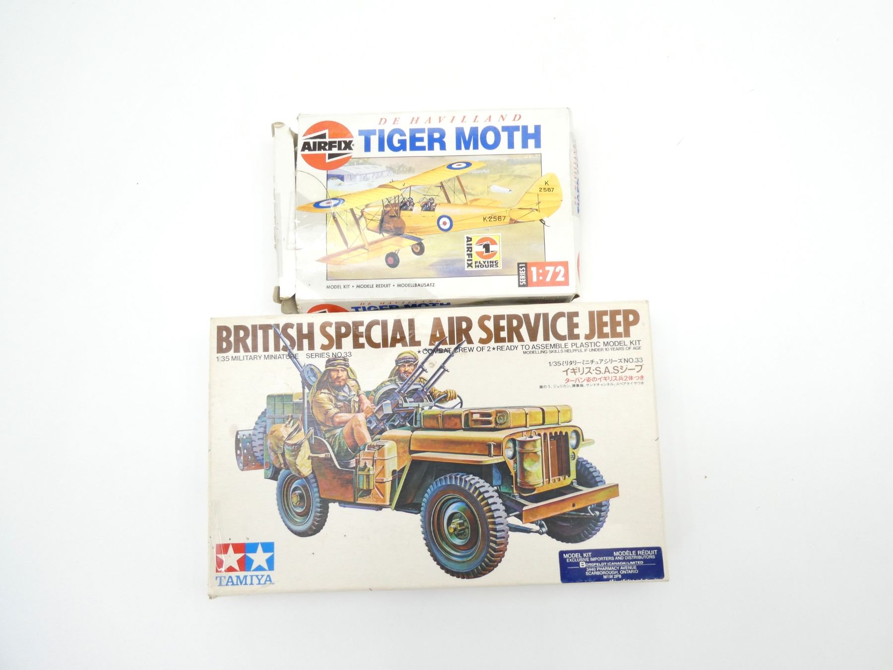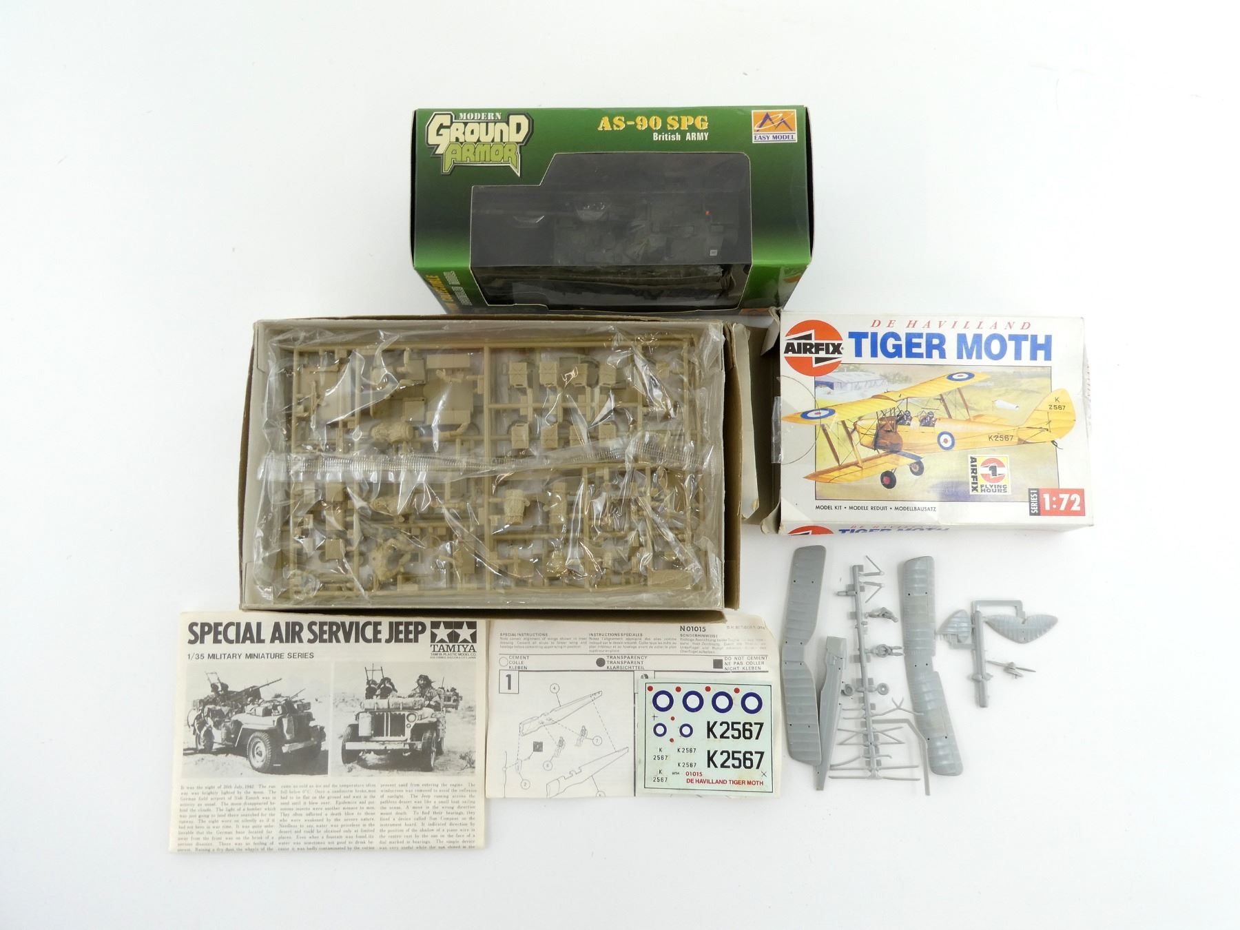LOT INCLUDES; (1) MODERN GROUND ARMOR BRITISH AS-90 SPG MODEL KIT, MADE BY EASY MODEL, 1:72 SCALE, APPEARS NEW OLD STOCK, (1) TAMIYA MILITARY MINIATURES BRITISH SPECIAL AIR SERVICE JEEP, MADE BY TAMIYA, 1:35 SCALE, IN ORIGINAL PACKAGING WITH INSTRUCTIONS, APPEARS NEW OLD STOCK, PIECES SEALED IN UN-OPENED PLASTIC PACKAGING, KIT MAY NOT BE COMPLETE / PIECES MAY BE MISSING & (1) AIRFIX DE HAVILLAND TIGER MOTH MODEL KIT, MADE BY AIRFIX, 1:72 SCALE, IN ORIGINAL PACKAGING WITH INSTRUCTIONS, PLASTIC FOR PIECES IS OPENED, KIT MAY NOT BE COMPLETE / PIECES MAY BE MISSING. SEE PHOTOS.