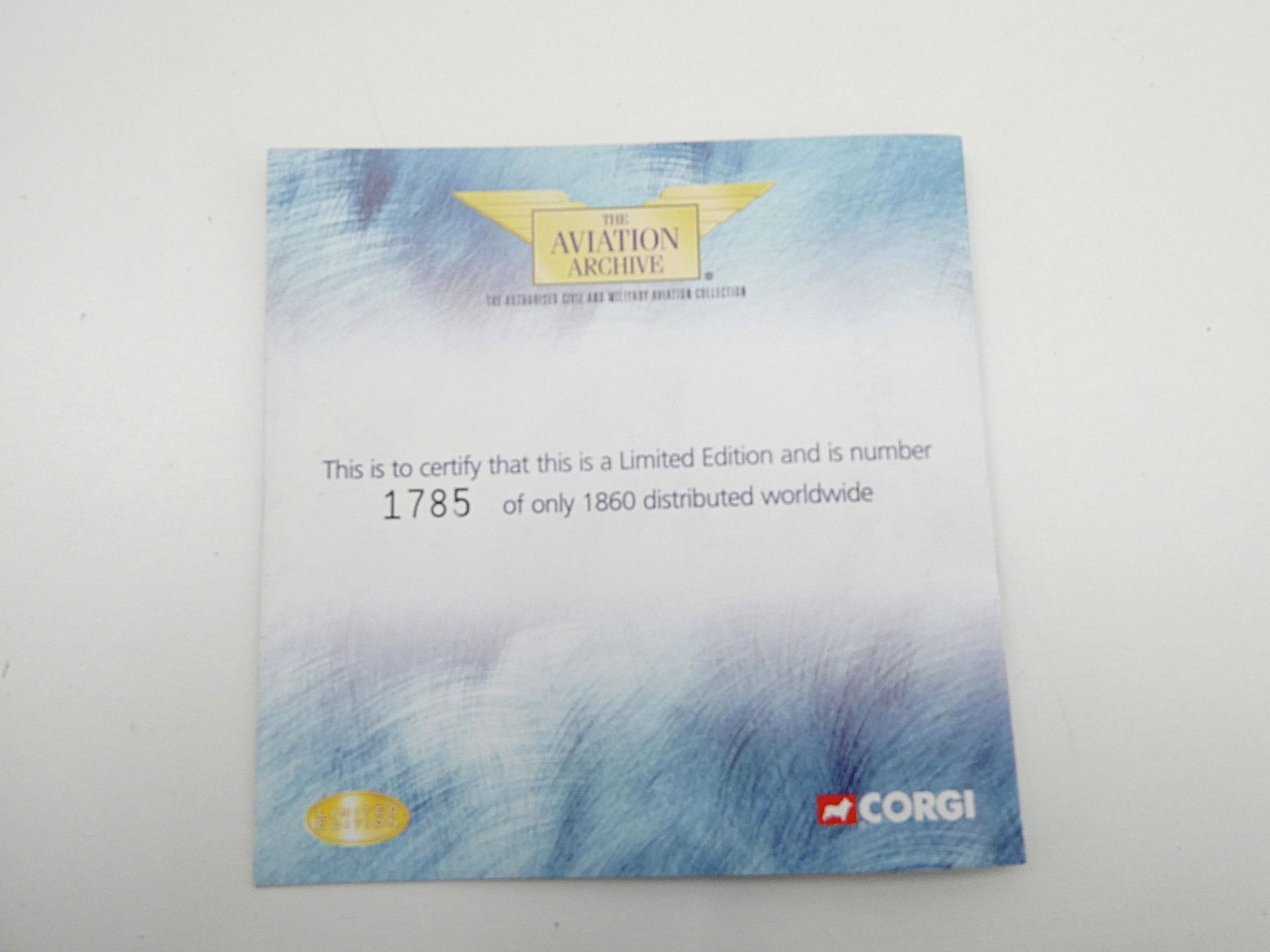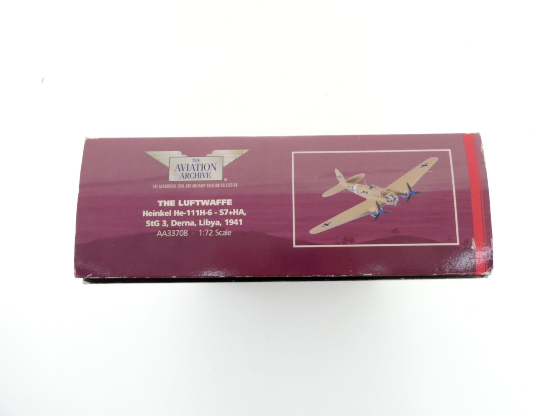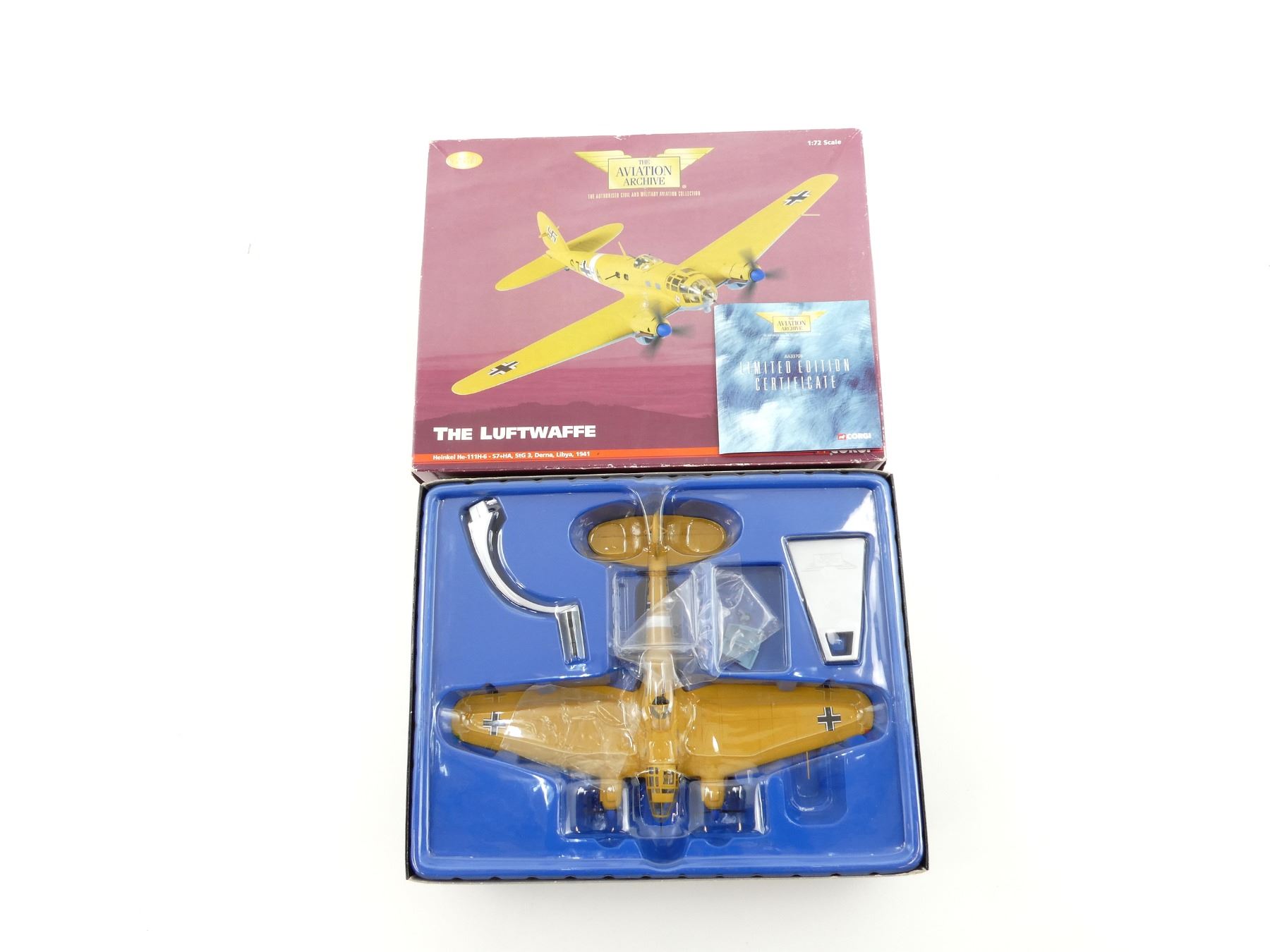 (1) CORGI THE LUFTWAFFE HEINKEL HE-111H-6-S7+HA, STG 3, DERNA, LIBYA, 1941 MODEL PLANE KIT, LIMITED EDITION, NO. 1785 OF ONLY 1860 DISTRIBUTED WORLDWIDE, MADE BY CORGI / THE AVIATION ARCHIVE, 1:72 SCALE, APPEARS NEW OLD STOCK. SEE PHOTOS.