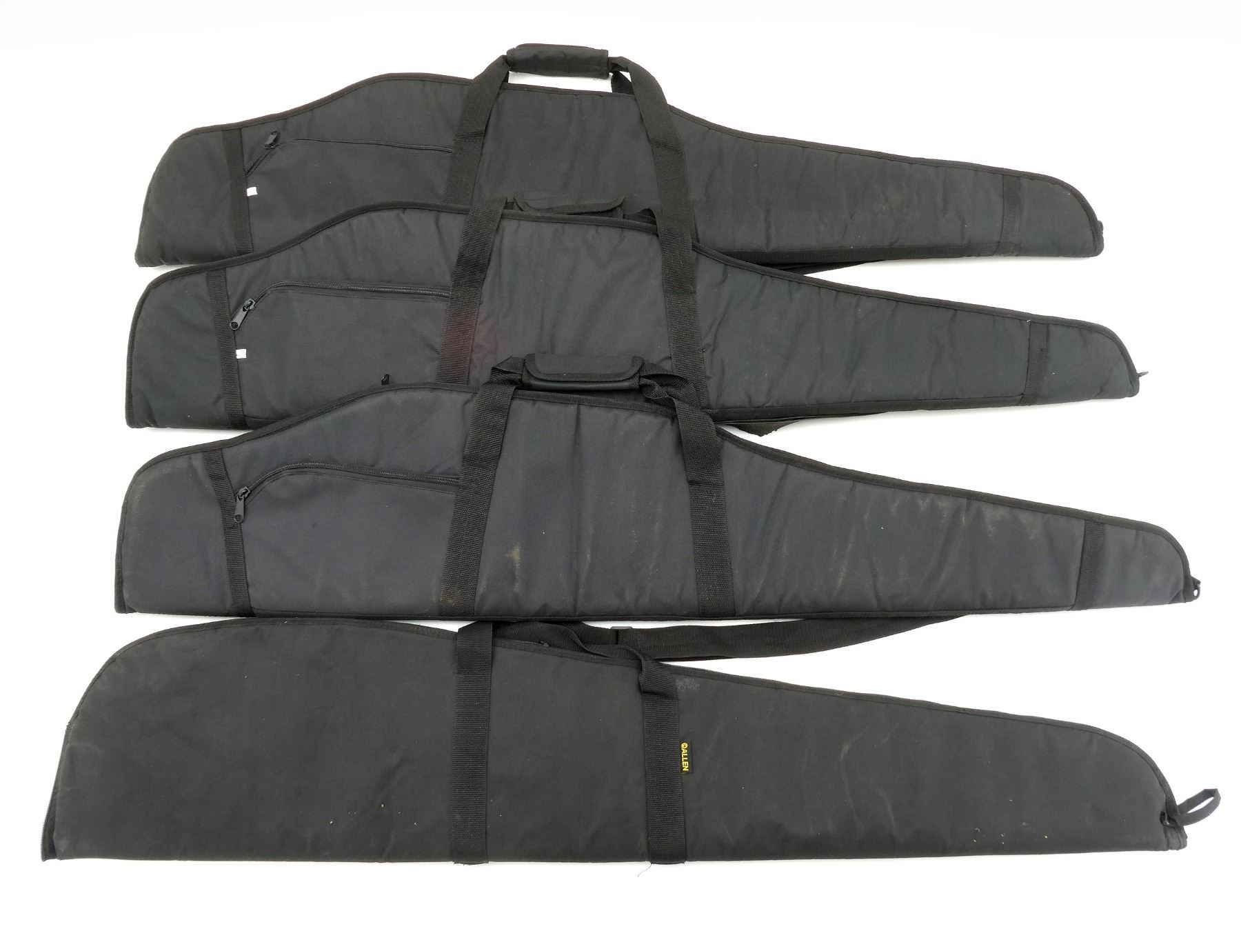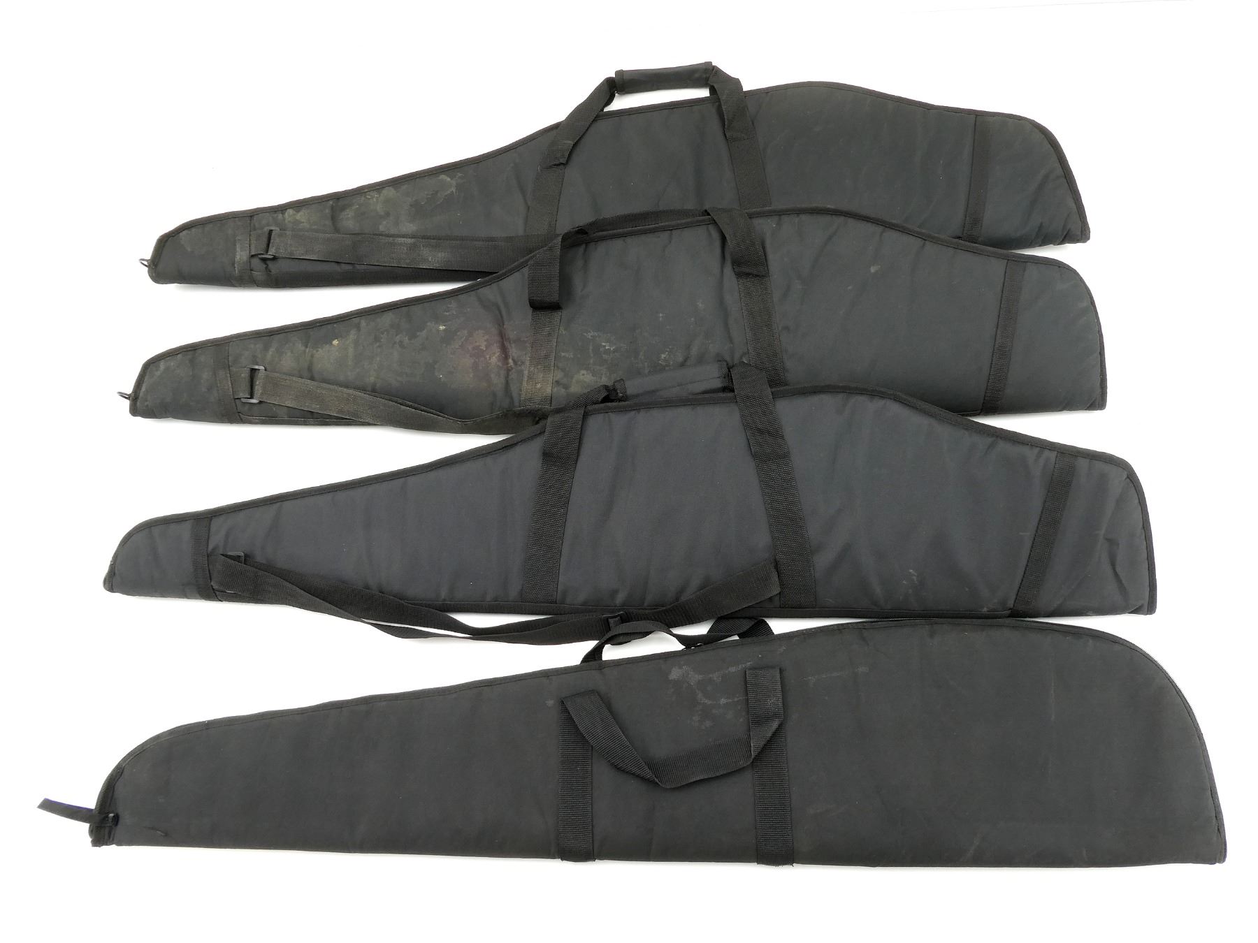 LOT INCLUDES; (4) BLACK SOFT PADDED GUN CASES, CARRY HANDLES, ZIPPERED, (3) WITH SHOULDER STRAP & OUTSIDE ZIPPERED POCKET, APPROX. OVERALL LENGTH 47", SHOWS WEAR AND TEAR FROM USAGE, SEE PHOTOS.