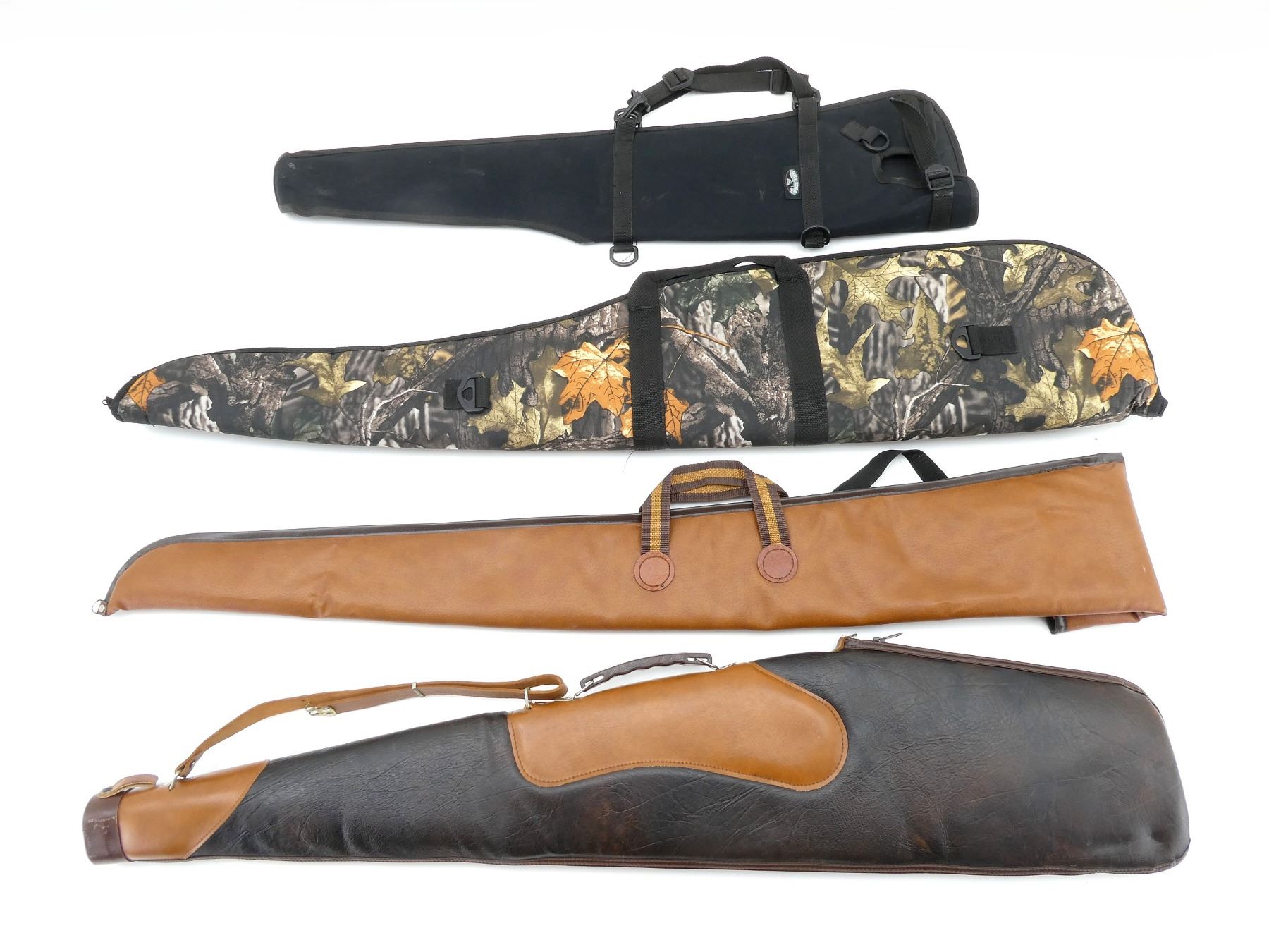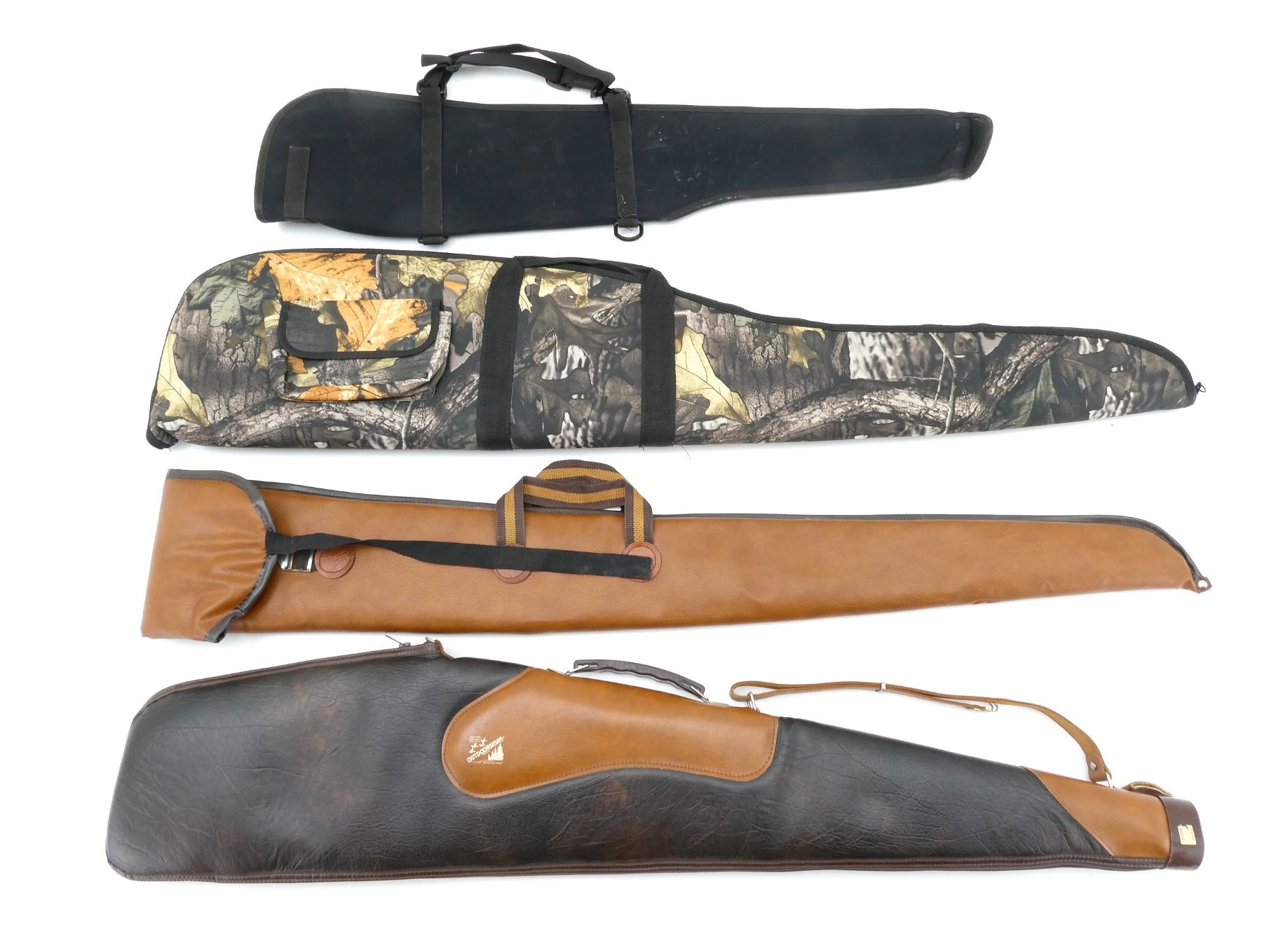 LOT INCLUDES; (2) SOFT PADDED GUN CASES, CARRY HANDLES, ZIPPERED, (1) WITH SHOULDER STRAP, (1) WITH VELCRO OUTSIDE POCKET, (1) SLIDE IN GUN CASE, CARRY HANDLES, STRAP & BUCKEL, (1) BLACK NYLON SCABBARD, APPROX. OVERALL LENGTH 35"-50", SHOWS WEAR AND TEAR FROM USAGE, SEE PHOTOS.