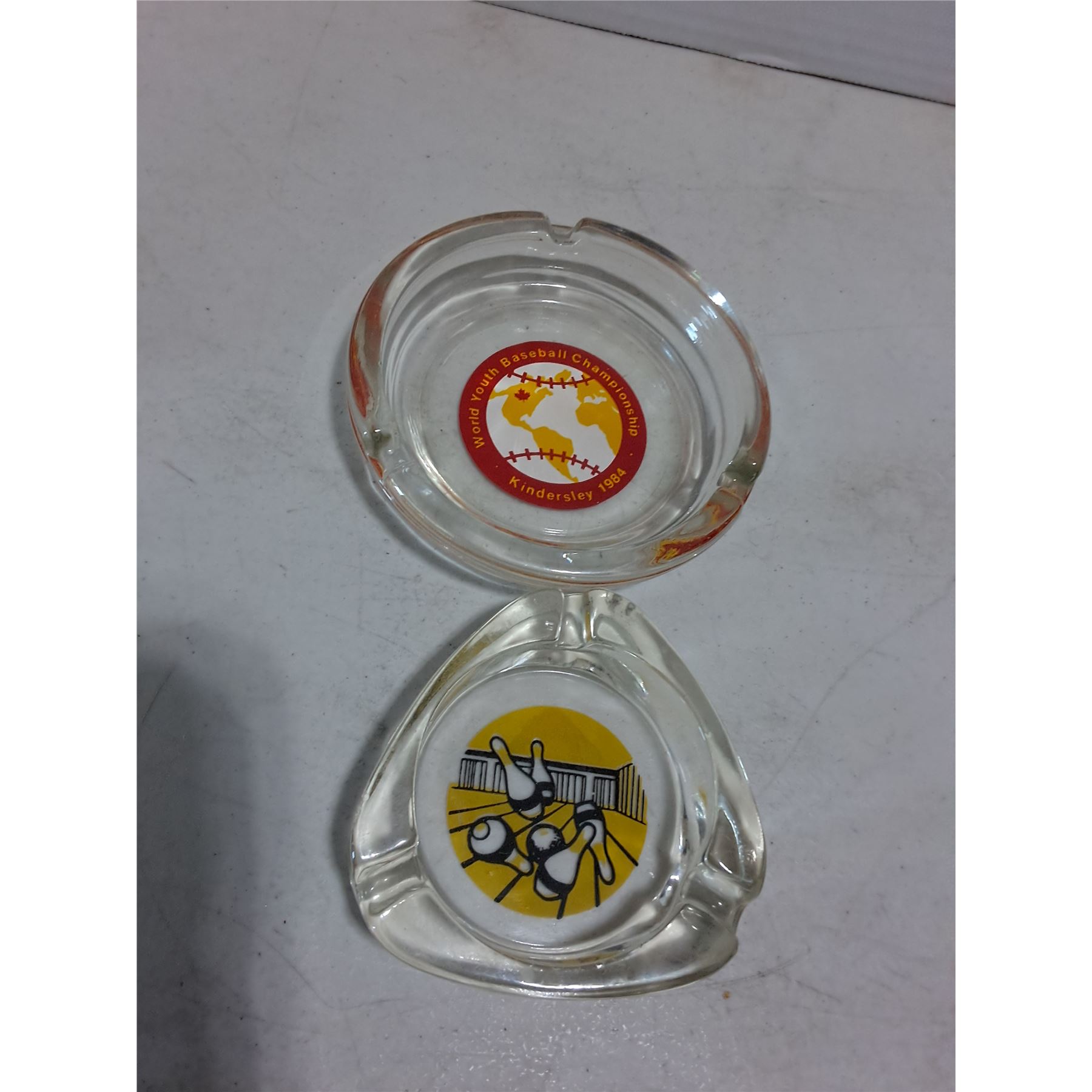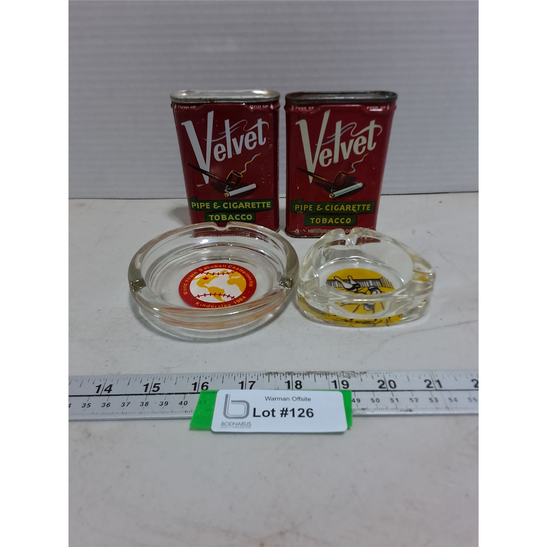 Lot 126 (2) Sport Themed Glass Ash Trays, (2) Vintage Velvet Pipe Tobacco Tins