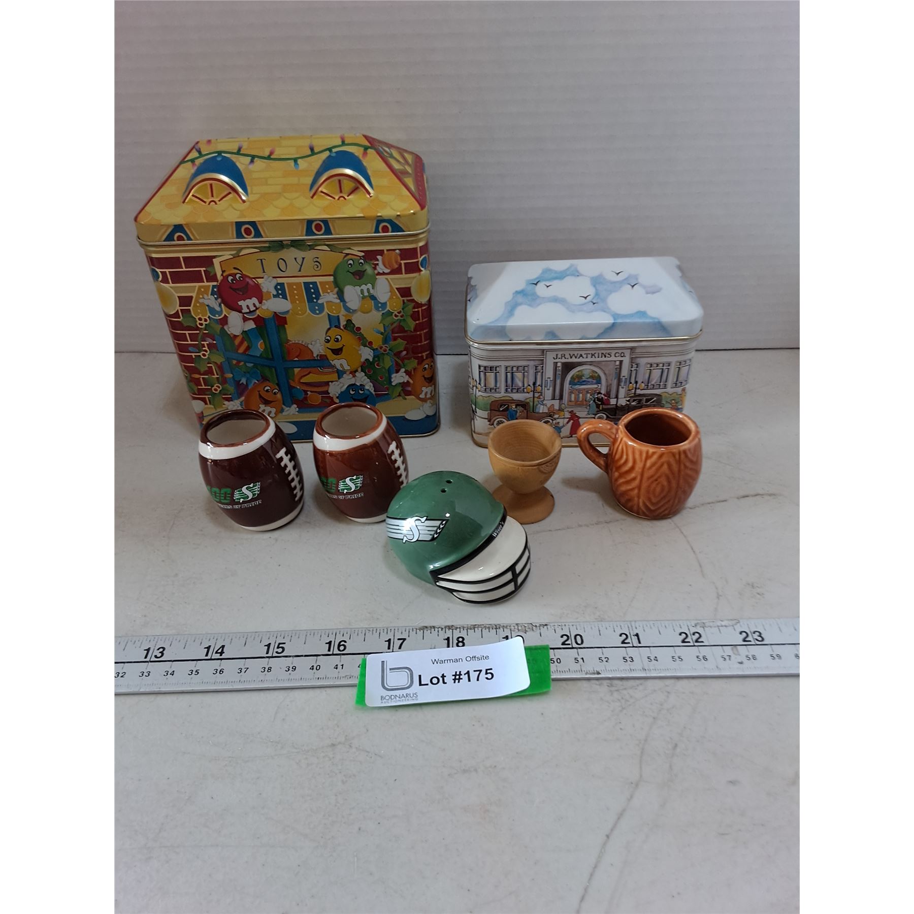 Lot 175 Tins, Toothpick Holders & Shaker, Mini Wooden Goblet
