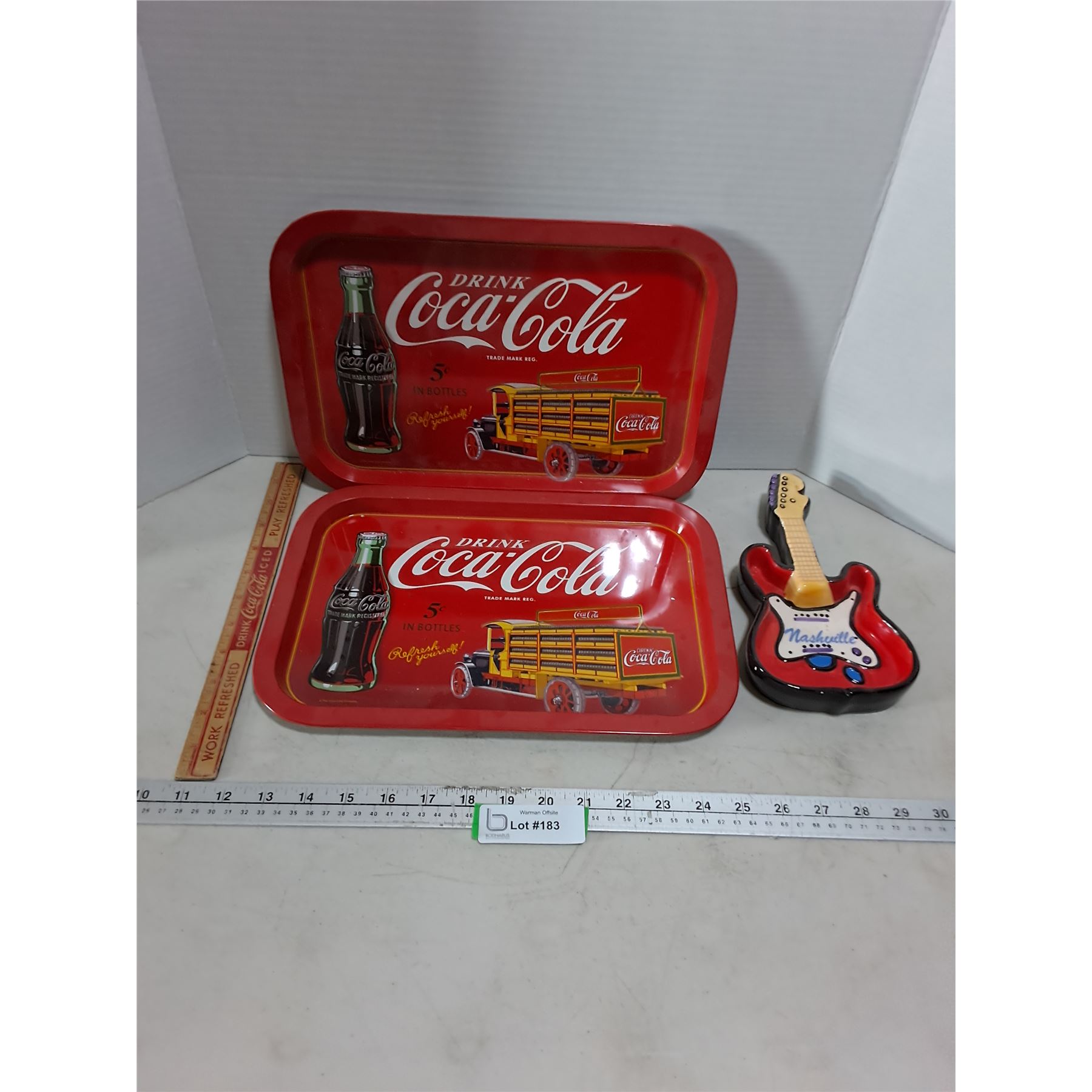 Lot 183 (2) Metal Coca-Cola Serving Trays, Ruler, Nashville "Guitar" Trinket Dish