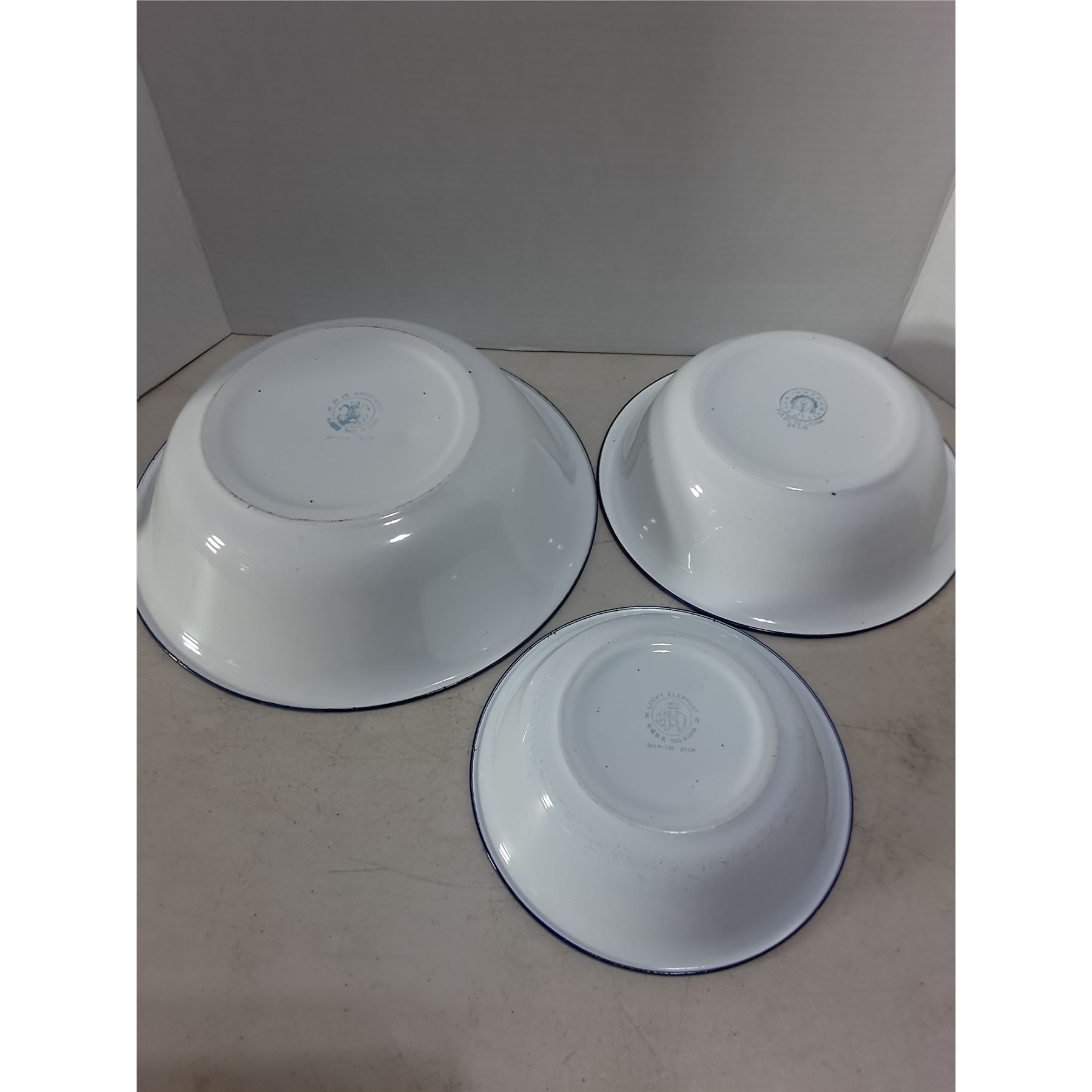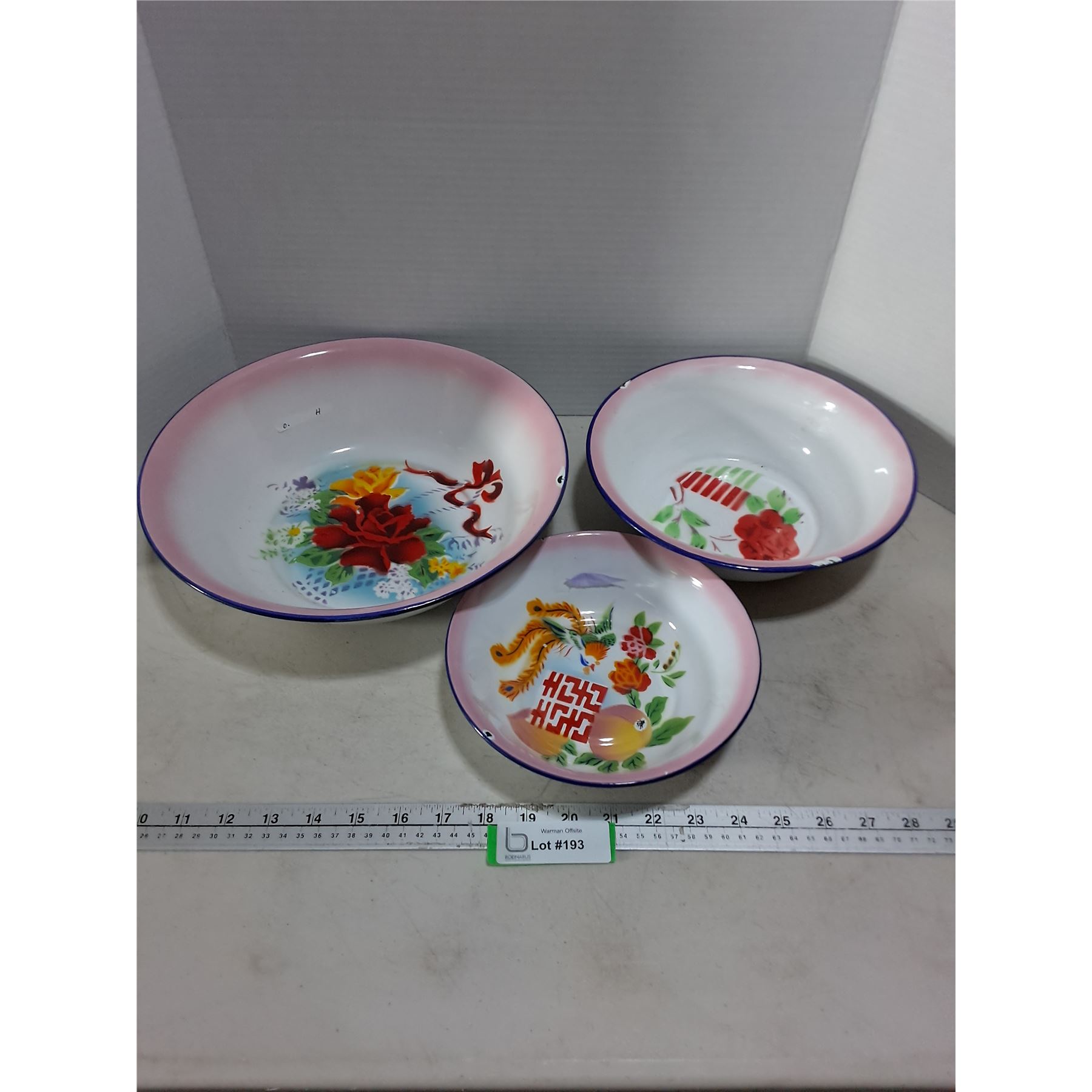 Lot 193 (3) Assorted Enameled Bowls (12", 9.5", 8" Diameters)