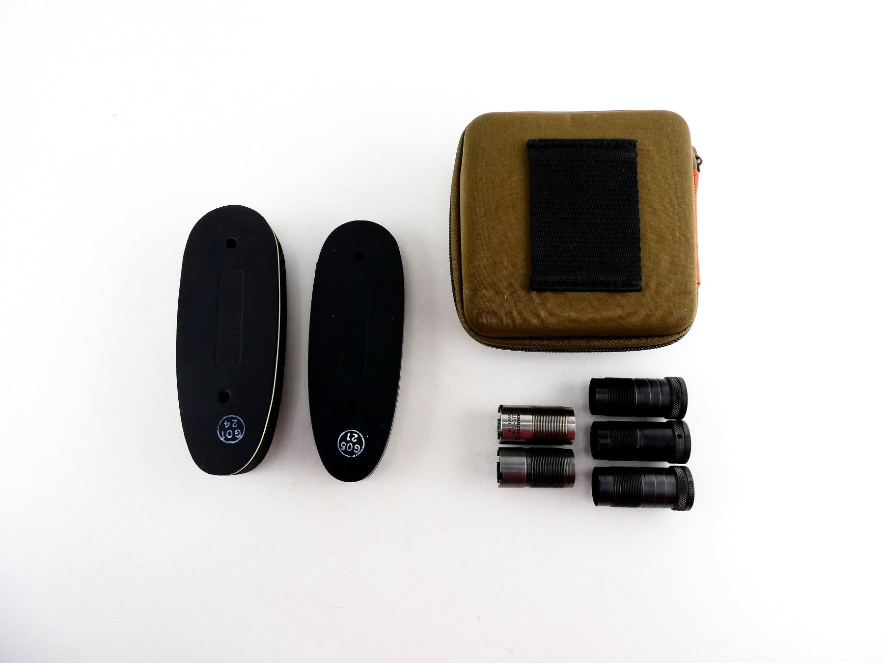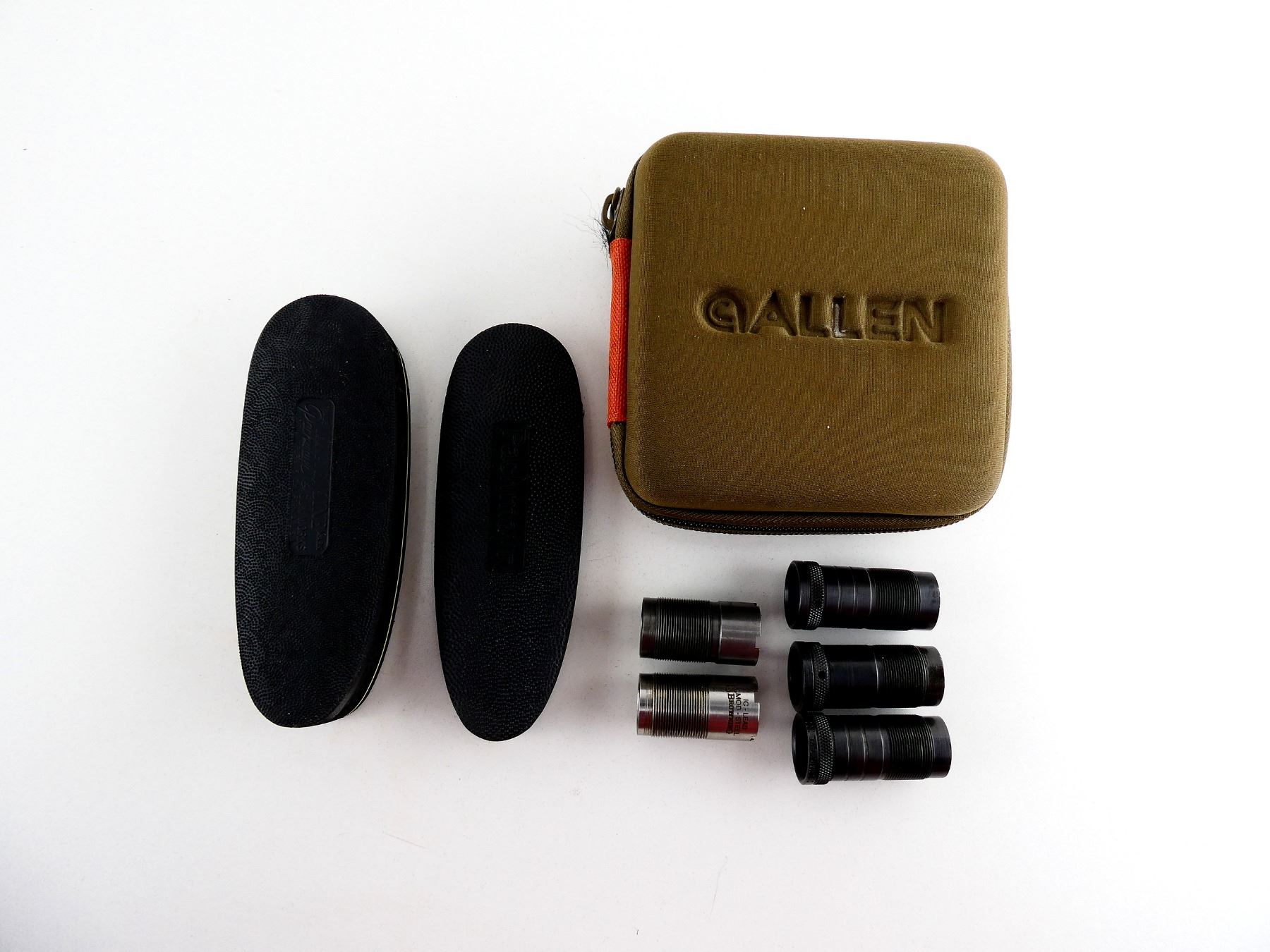 LOT INCLUDES; (1) INVECTOR I.C. CHOKE, (1) UNKNOWN FULL CHOKE, (2) WINCHESTER I.C. CHOKES, (1) WINCHESTER FULL CHOKE, (2) ASSORTED RECOIL PADS, APPROX. 2" X 5.5". MAY REQUIRE FITTING. SEE PHOTOS.