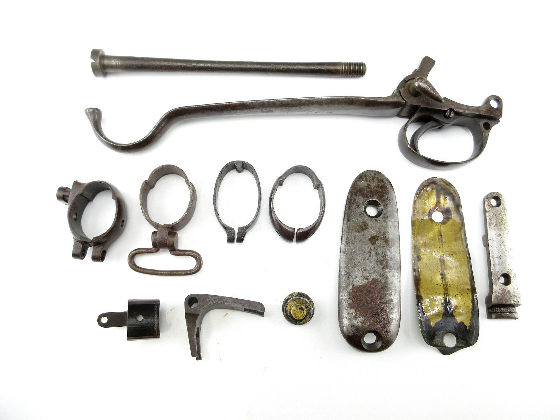 LOT INCLUDES; TRIGGER MECH., APPEARS COMPLETE WITH LONG LEVER, BARREL BANDS, EXTRACTOR, NOSE CAP, BUTT PLATE WITH BRASS SPACER, STOCK BOLT, FOREND TANG, ETC. MAY REQUIRE FITTING. SEE PHOTOS.