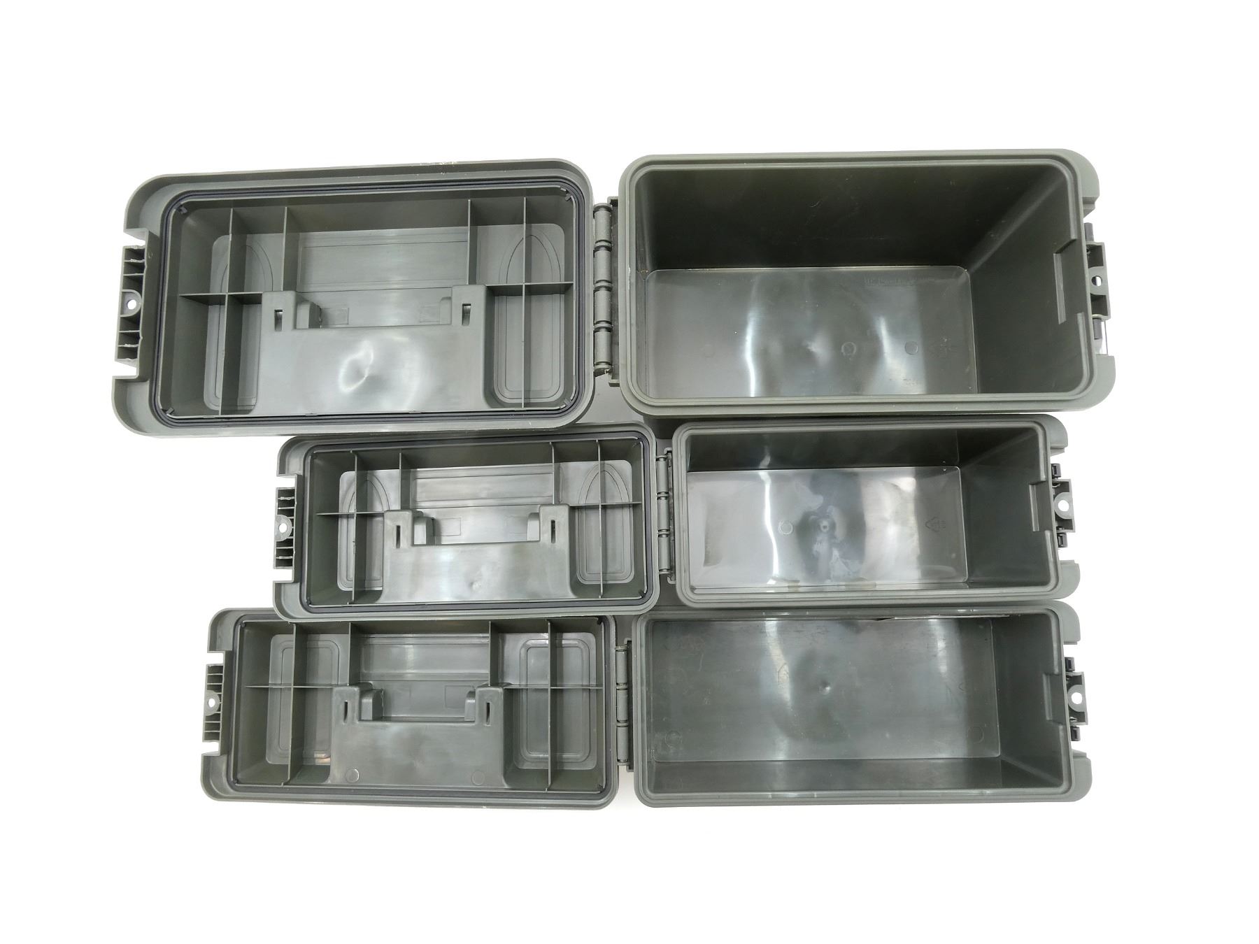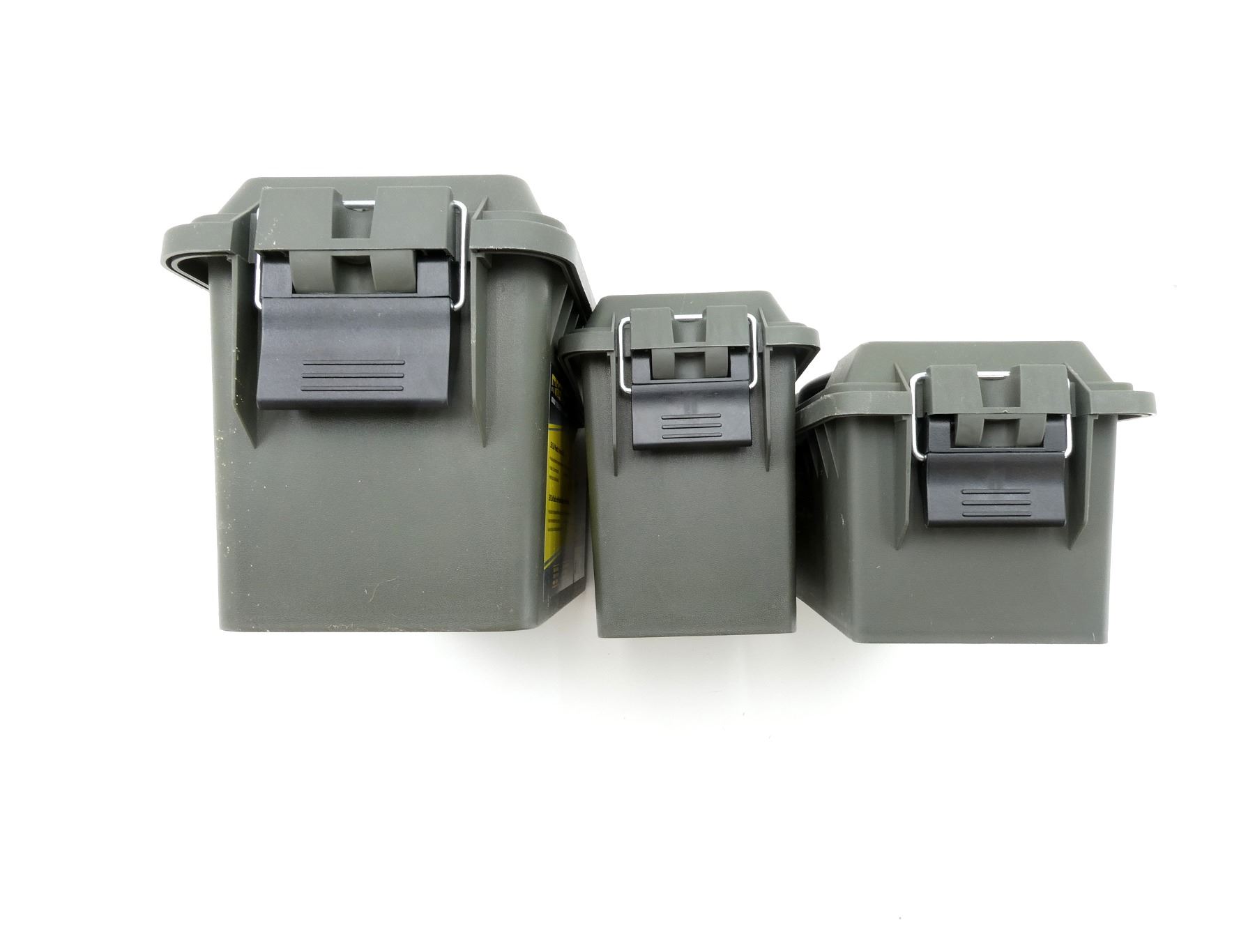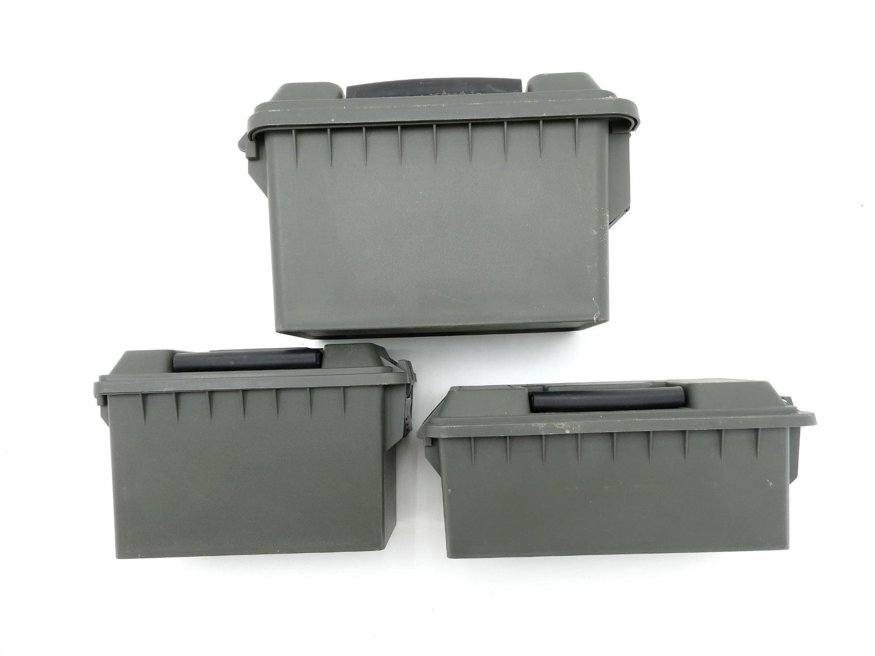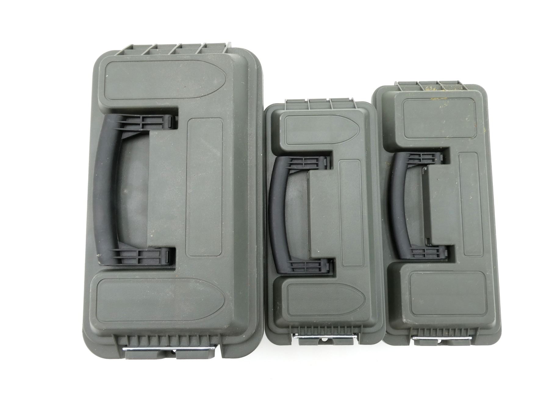 LOT INCLUDES; (1) GREEN POLYMER DRY AMMO / STORAGE BOX, WITH CARRY HANDLE & LATCH, FITS .50 CAL., ETC. OVERALL LENGTH APPROX. 13.75" X 7.5" X 9", (1) GREEN POLYMER DRY AMMO / STORAGE BOX, WITH CARRY HANDLE & LATCH, FITS .30 CAL., ETC. OVERALL LENGTH APPROX. 11.5" X 5" X 7.25" & (1) GREEN POLYMER DRY AMMO / STORAGE BOX, WITH CARRY HANDLE & LATCH, FITS SHOTGUN SHELLS, ETC. OVERALL LENGTH APPROX. 13.5" X 5.5" X 5.5". SEE PHOTOS.