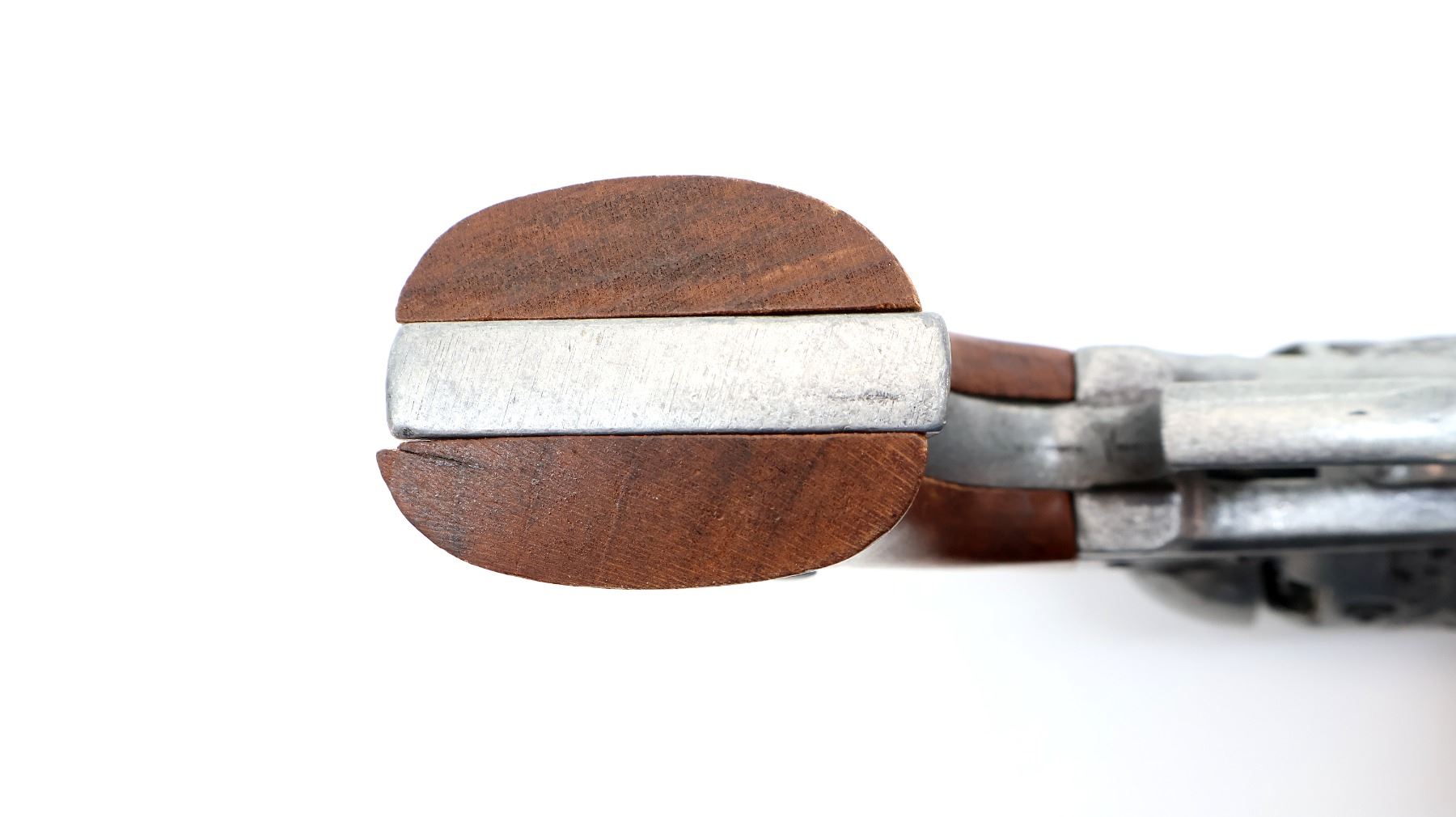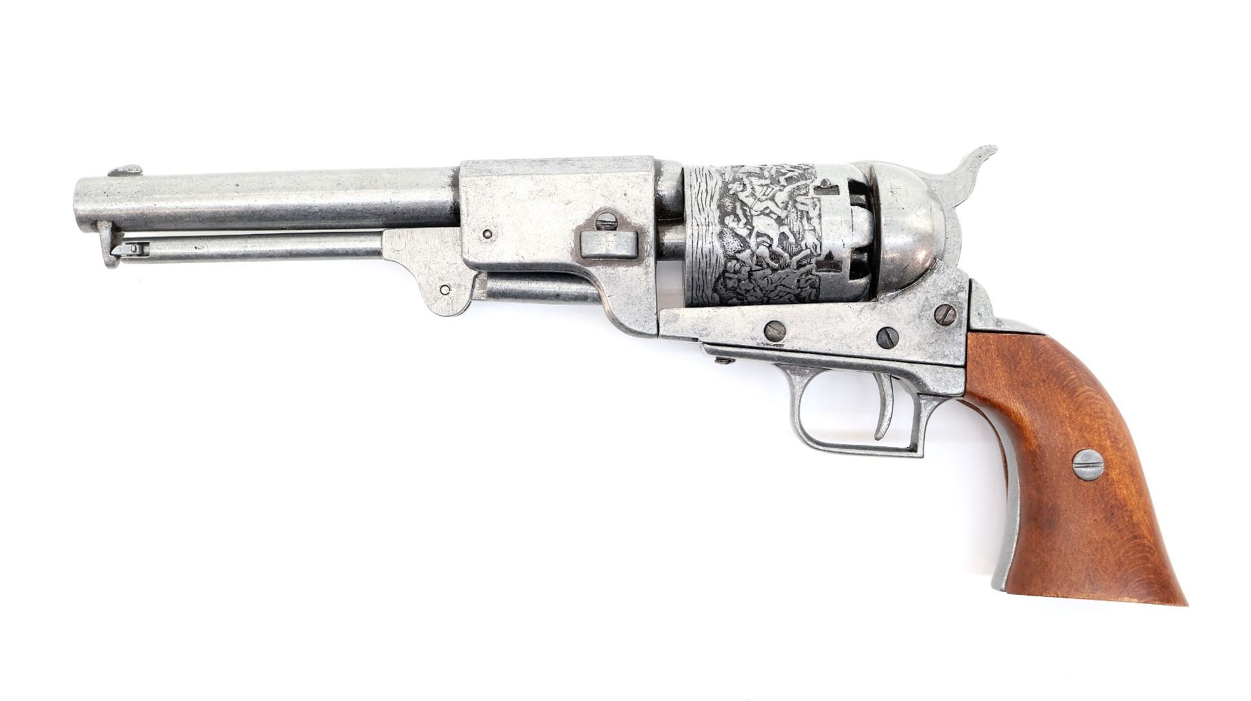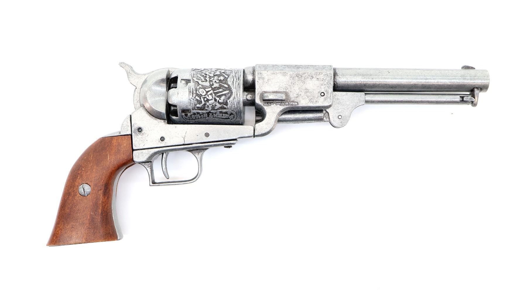 (1) ANTIQUE STYLE BALL & CAP REVOLVER, ALLOY / WOOD CONSTRUCTION, OVERALL LENGTH APPROX. 13.75". SEE PHOTOS.