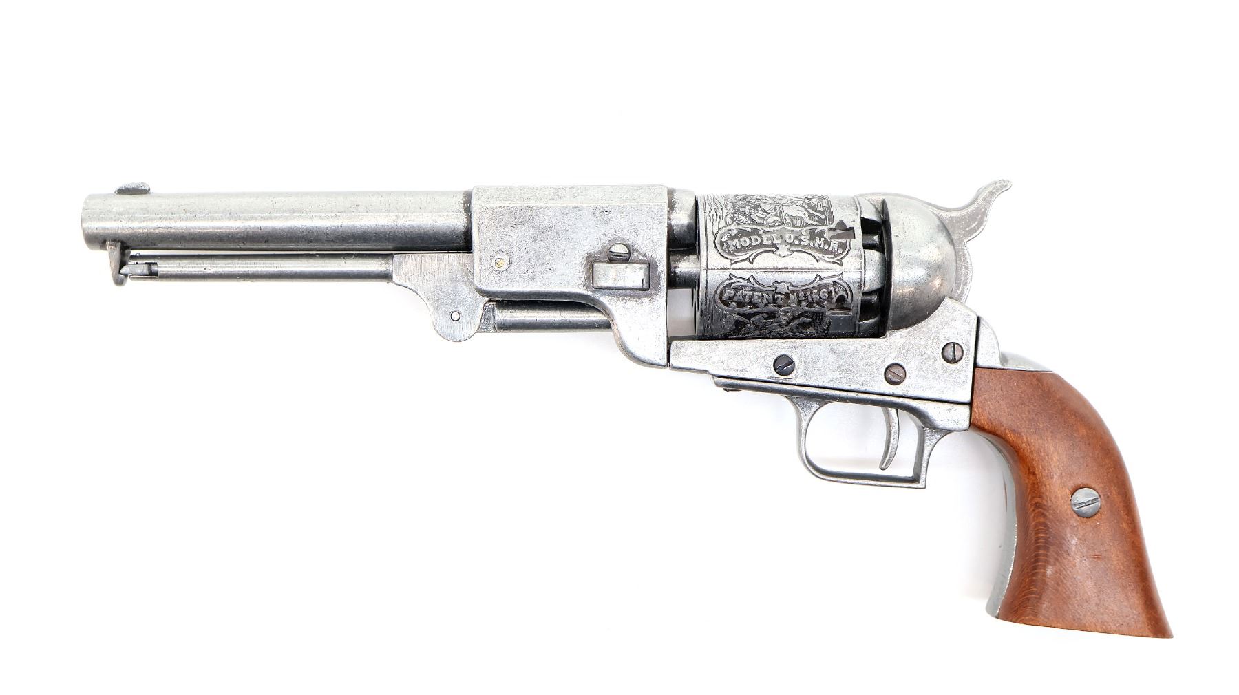 (1) ANTIQUE STYLE BALL & CAP REVOLVER, ALLOY / WOOD CONSTRUCTION, OVERALL LENGTH APPROX. 13.75". SEE PHOTOS.