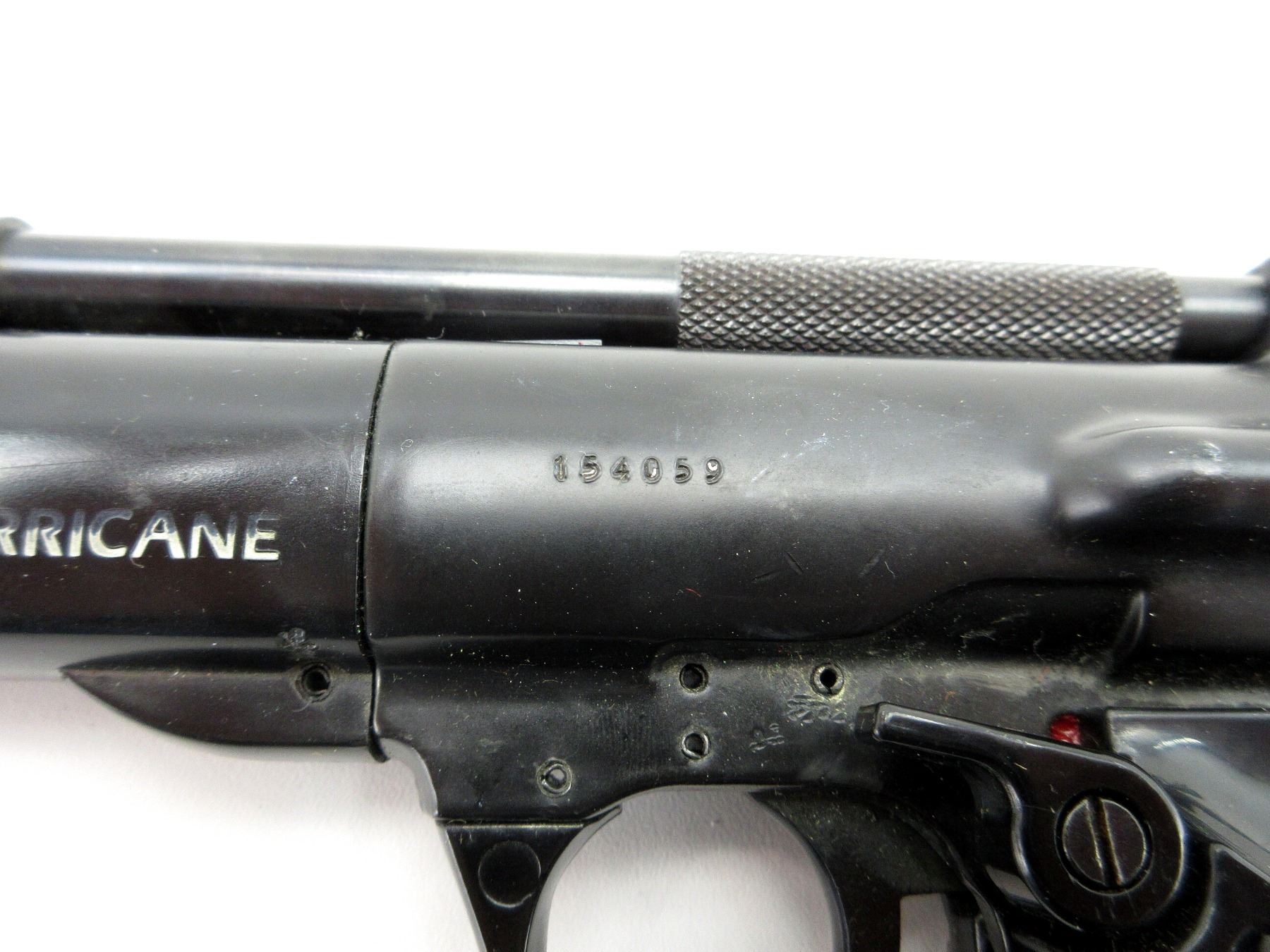 (1) .22 CAL. (5.5MM) PELLET, SPRING / AIR POWERED, SINGLE SHOT, STEEL & ALLOY CONSTRUCTION, BLACK POLYMER GRIPS, MARKED: "WEBLEY HURRICANE", "154059", ETC., NO COCKING ISSUES, NOT FULLY TESTED, WITH ORIGINAL PACKAGING, SHOWS WEAR & TEAR / USE MARKINGS, MAY NOT BE COMPLETE / PIECES MAY BE MISSING. SEE PHOTOS.