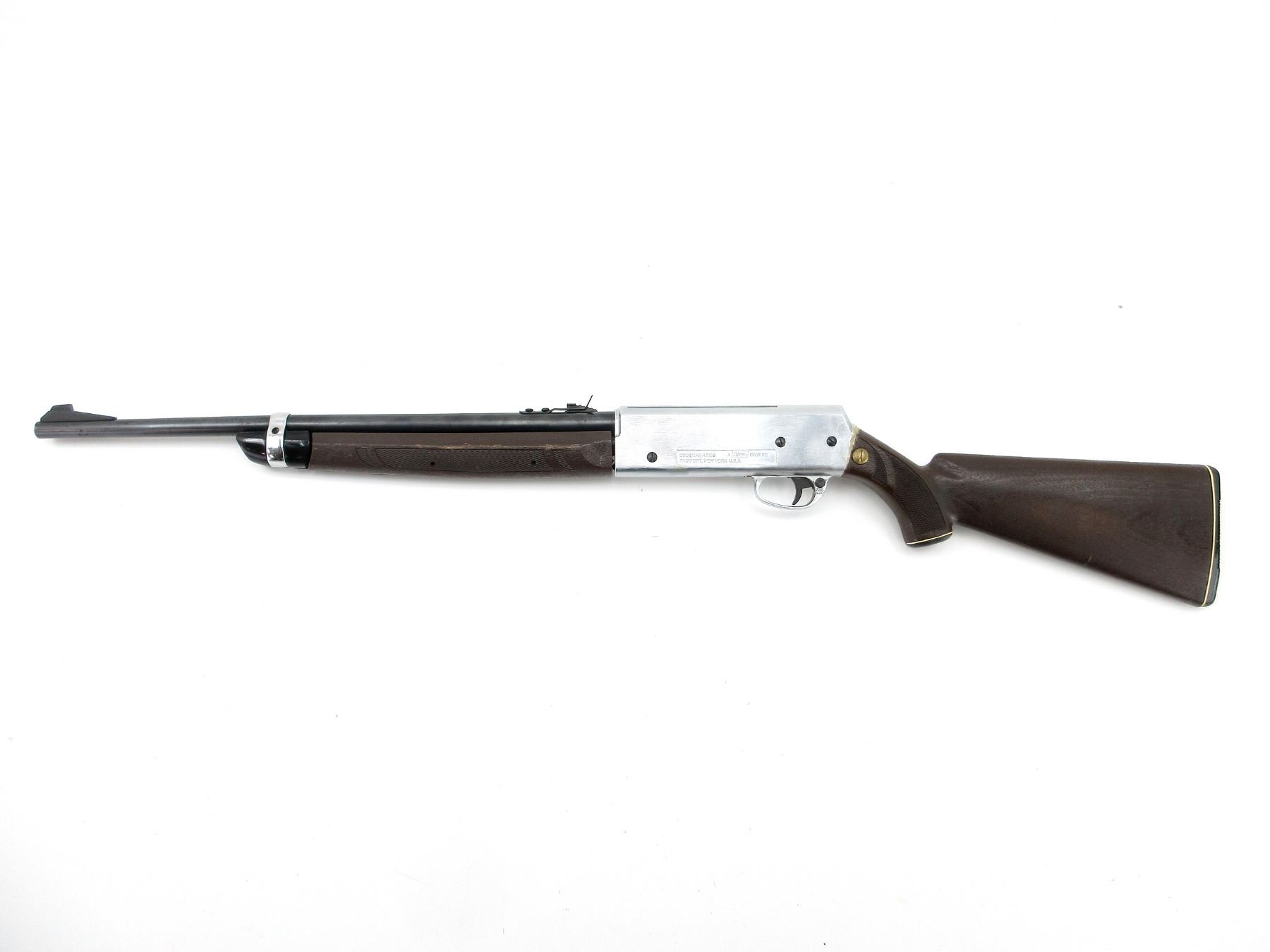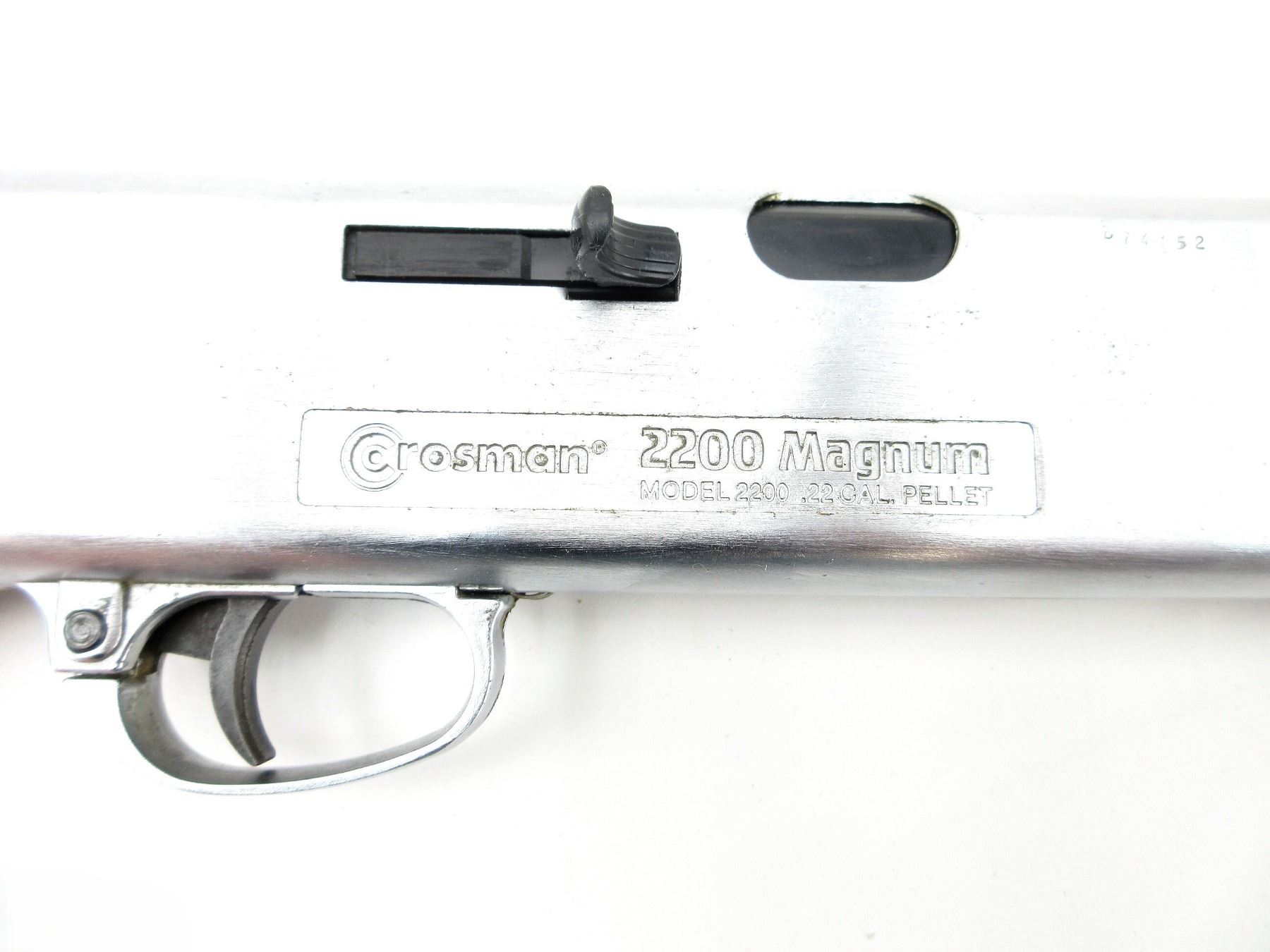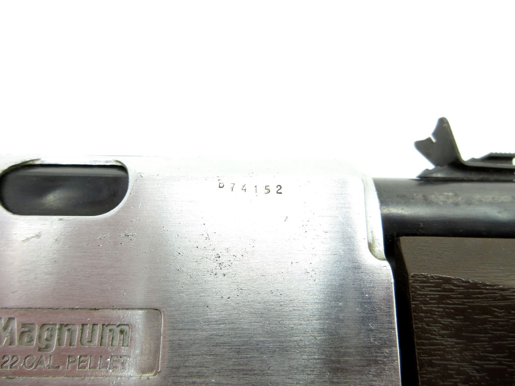 (1) .22 CAL. (5.5MM) PELLET, PUMP ACTION, SPRING / AIR POWERED, SINGLE SHOT, STEEL / ALUMINIUM & POLYMER CONSTRUCTION - STOCK HAS BEEN REPAIRED, MARKED: "CROSMAN", "2200 MAGNUM", "B74152", ETC., REQUIRES NEW SEALS - DOES NOT HOLD AIR, NOT FULLY TESTED, SHOWS WEAR & TEAR / USE MARKINGS, MAY NOT BE COMPLETE / PIECES MAY BE MISSING. SEE PHOTOS.