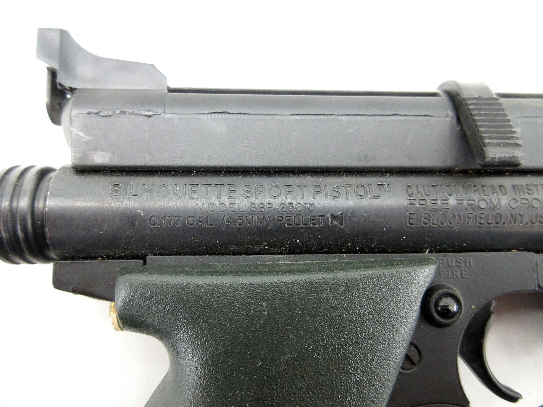 (1) .177 CAL. (4.5MM) PELLET, CO2 SINGLE SHOT, STEEL & POLYMER CONSTRUCTION, MARKED: "SILHOUETTE", "SSP-250", "177 CAL", ETC., NOT FULLY TESTED, SHOWS WEAR & TEAR / USE MARKINGS. SEE PHOTOS.