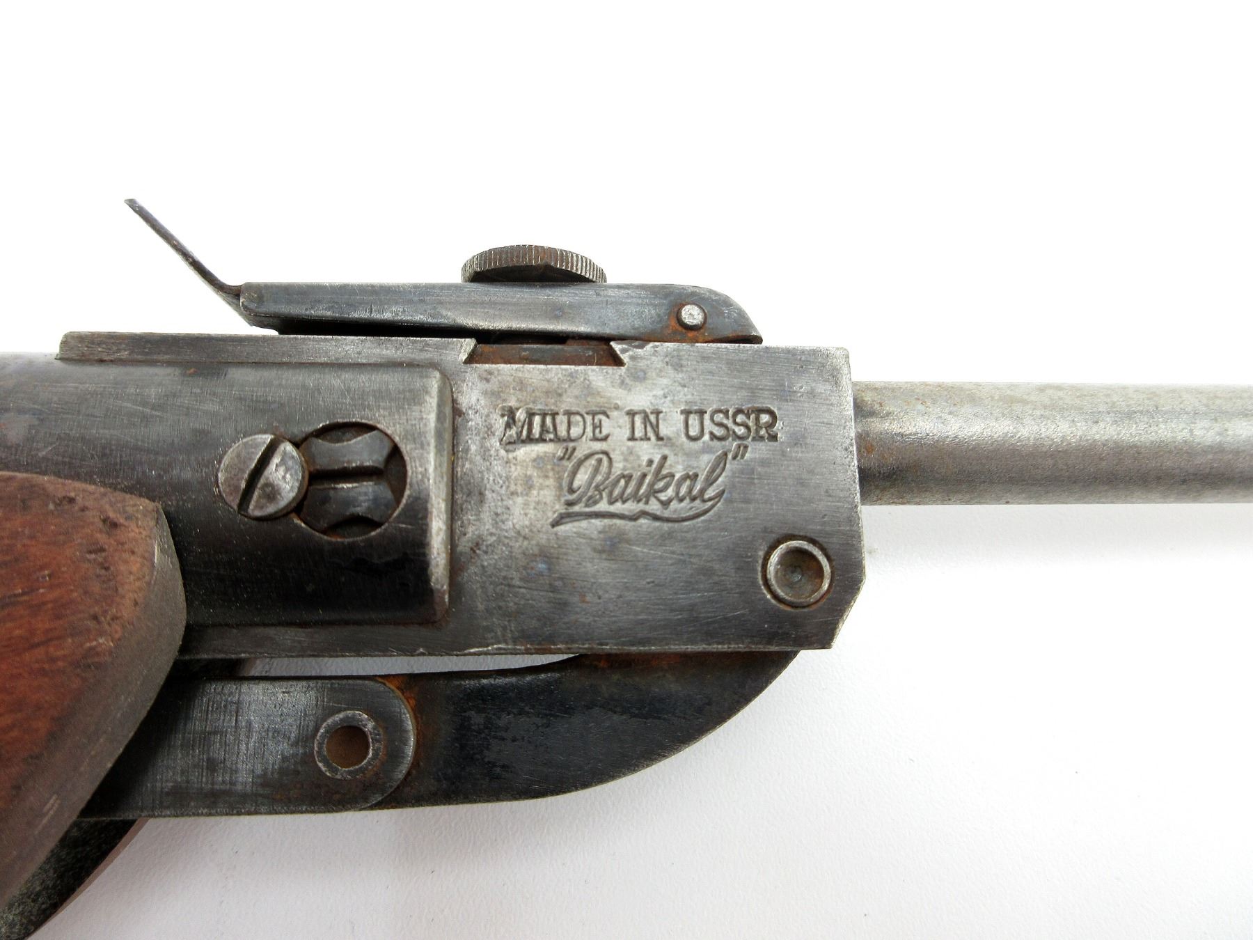 (1) .177 CAL. (4.5MM) PELLET, BREAK ACTION, SPRING / AIR POWERED, STEEL & WOOD CONSTRUCTION, MARKED: "???-38", "BAIKAL", "MADE IN USSR", ETC., COCKING ISSUES - WILL NOT HOLD, NOT FULLY TESTED, SHOWS WEAR & TEAR / USE MARKINGS. SEE PHOTOS.