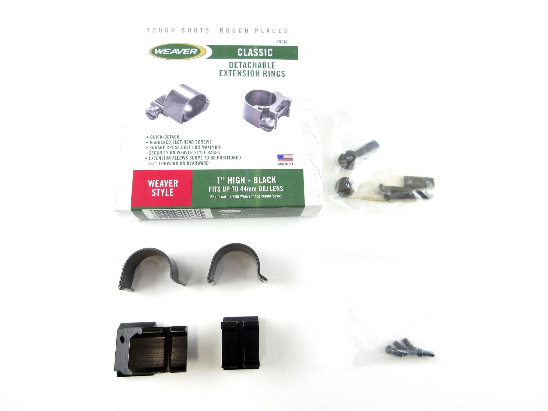 (1) SET OF 1" EXTENSION SCOPE RINGS, FITS UP TO 44MM OBJ LENS, BLACK, HIGH, PART #: 49060, APPEARS NEW OLD STOCK IN ORIGINAL PACKAGING. MAY REQUIRE FITTING. SEE PHOTOS.