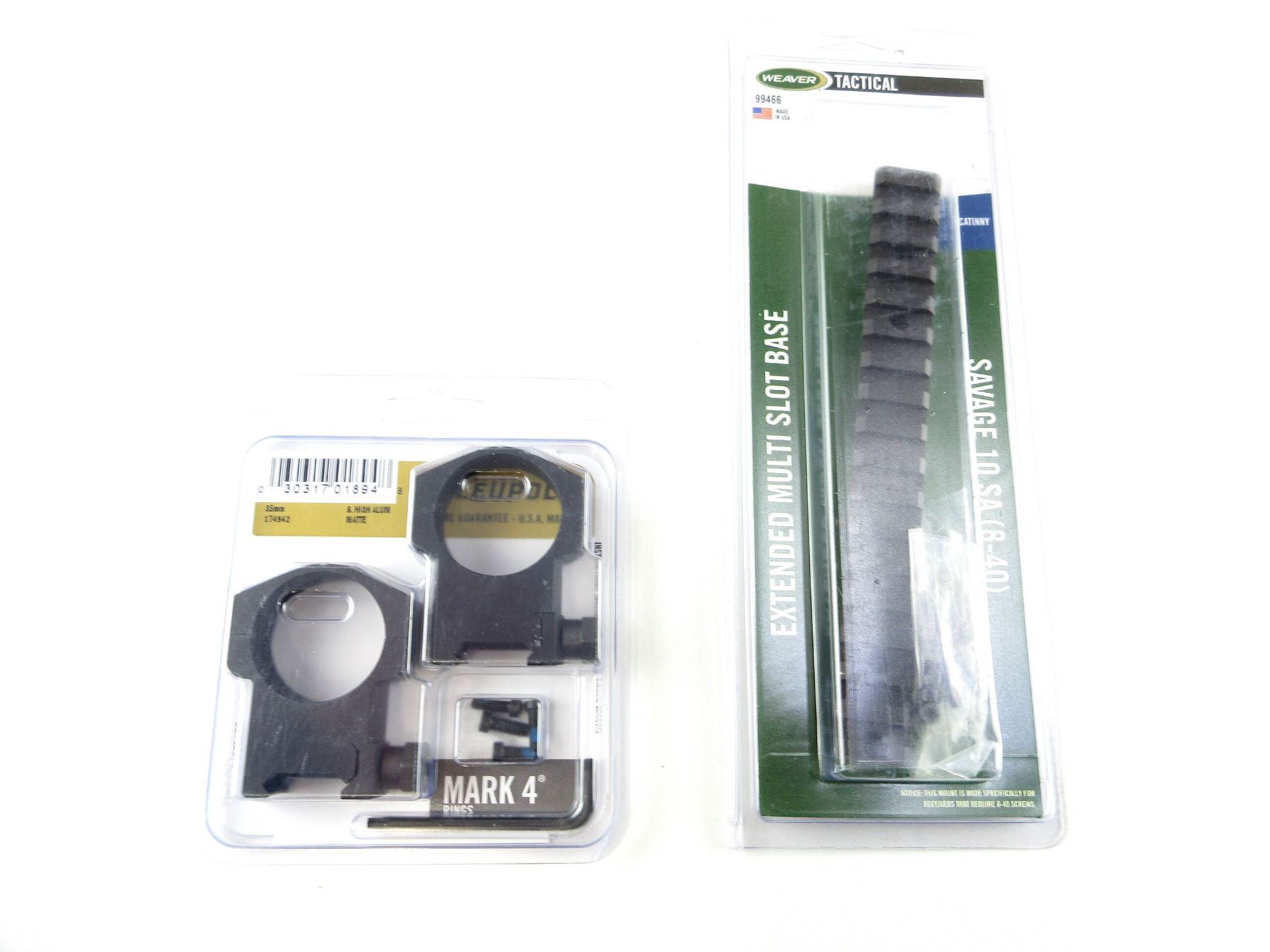 LOT INCLUDES; (1) SET OF 35MM MARK 4 SCOPE RINGS, BLACK MATTE ALUMINIUM, HIGH, PART #: 174942, APPEARS NEW OLD STOCK IN ORIGINAL PACKAGING & (1) SAVAGE 10 SHORT ACTION (8-40) EXTENDED MULTI SLOT BASE, BLACK ALUMINIUM CONSTRUCTION, PART #: 99466, APPEARS NEW OLD STOCK IN ORIGINAL PACKAGING. MAY REQUIRE FITTING. SEE PHOTOS.