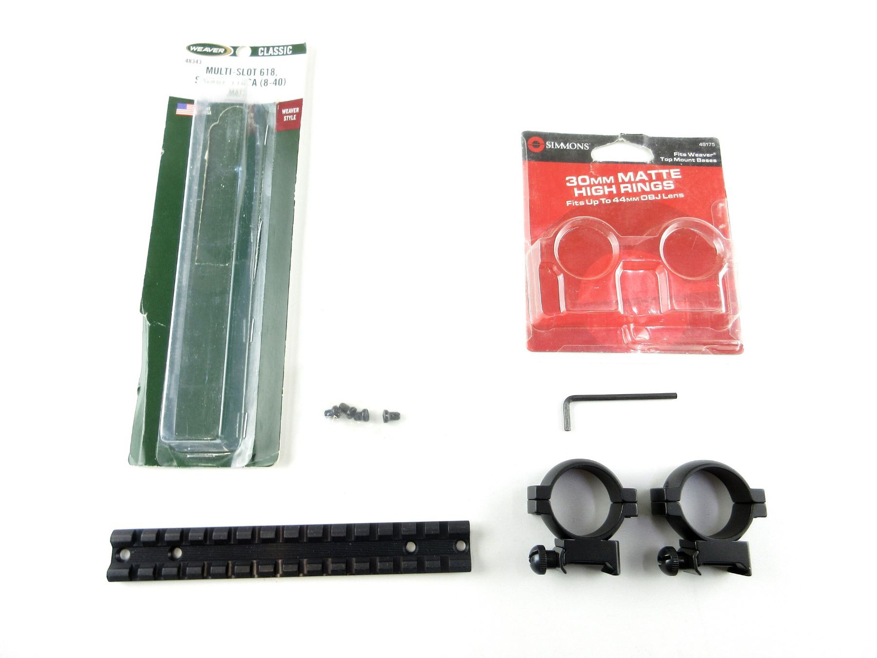 LOT INCLUDES; (1) SET OF 30MM SCOPE RINGS, BLACK MATTE, HIGH, PART #: 49175, APPEARS NEW OLD STOCK IN ORIGINAL PACKAGING & (1) SAVAGE 110 SHORT ACTION (8-40) MULTI SLOT 618 BASE, MATTE BLACK ALUMINIUM CONSTRUCTION, PART #: 48343, APPEARS NEW OLD STOCK IN ORIGINAL PACKAGING. MAY REQUIRE FITTING. SEE PHOTOS.