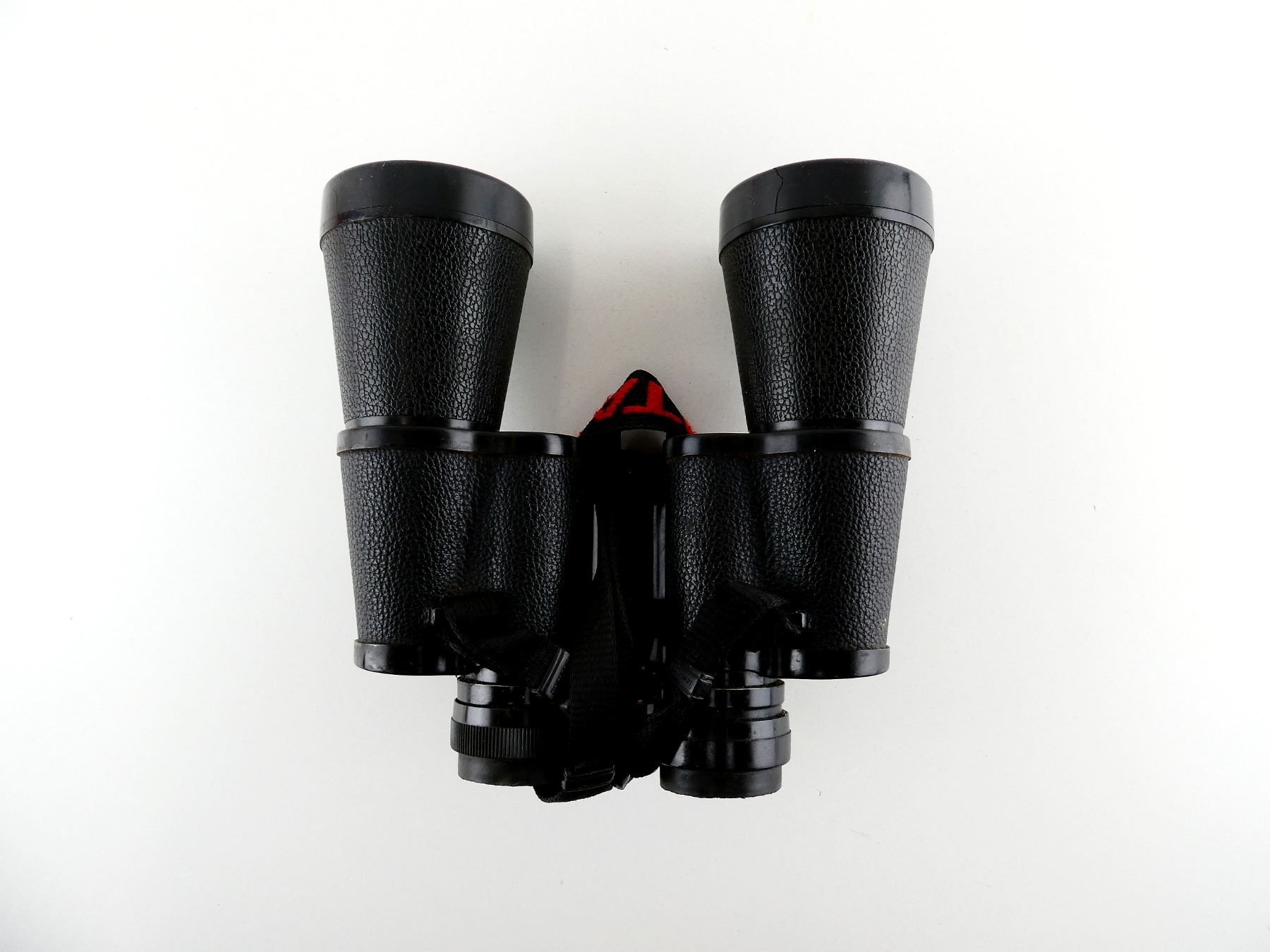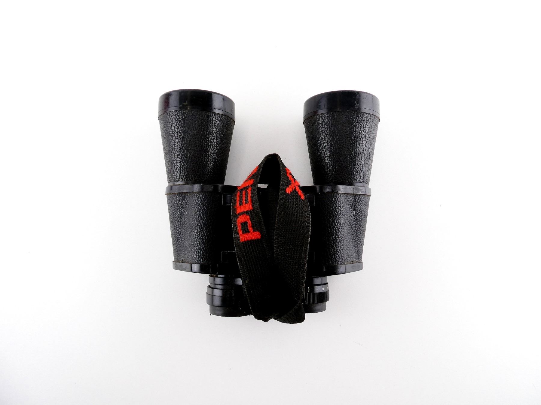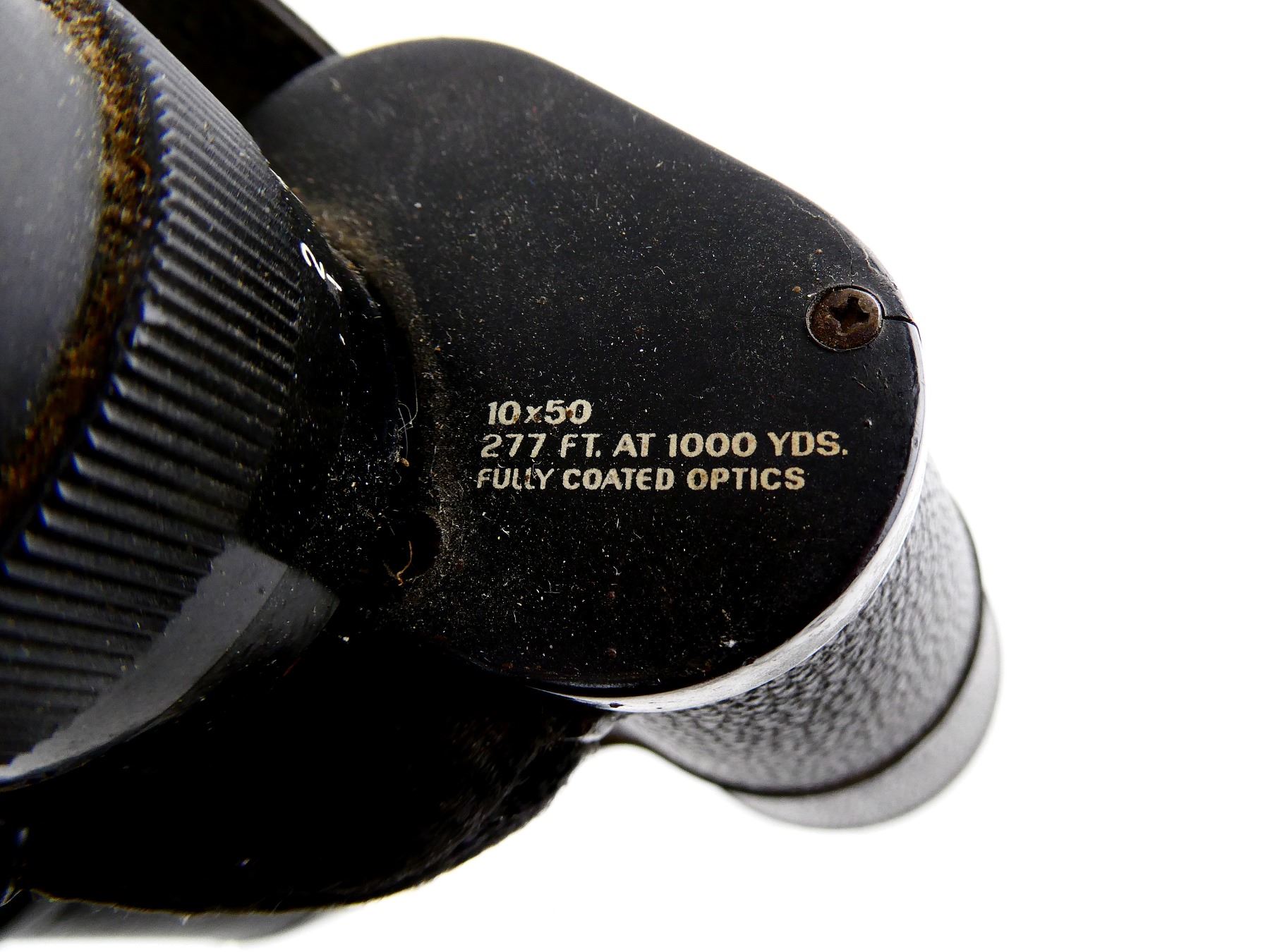 (1) CLEAR OPTICS, WORKING FOCUS DIAL, MARKED "277FT AT 1000YDS", ETC., WITH NECK LANYARD, SHOWS WEAR & TEAR / USE MARKINGS. SEE PHOTOS.