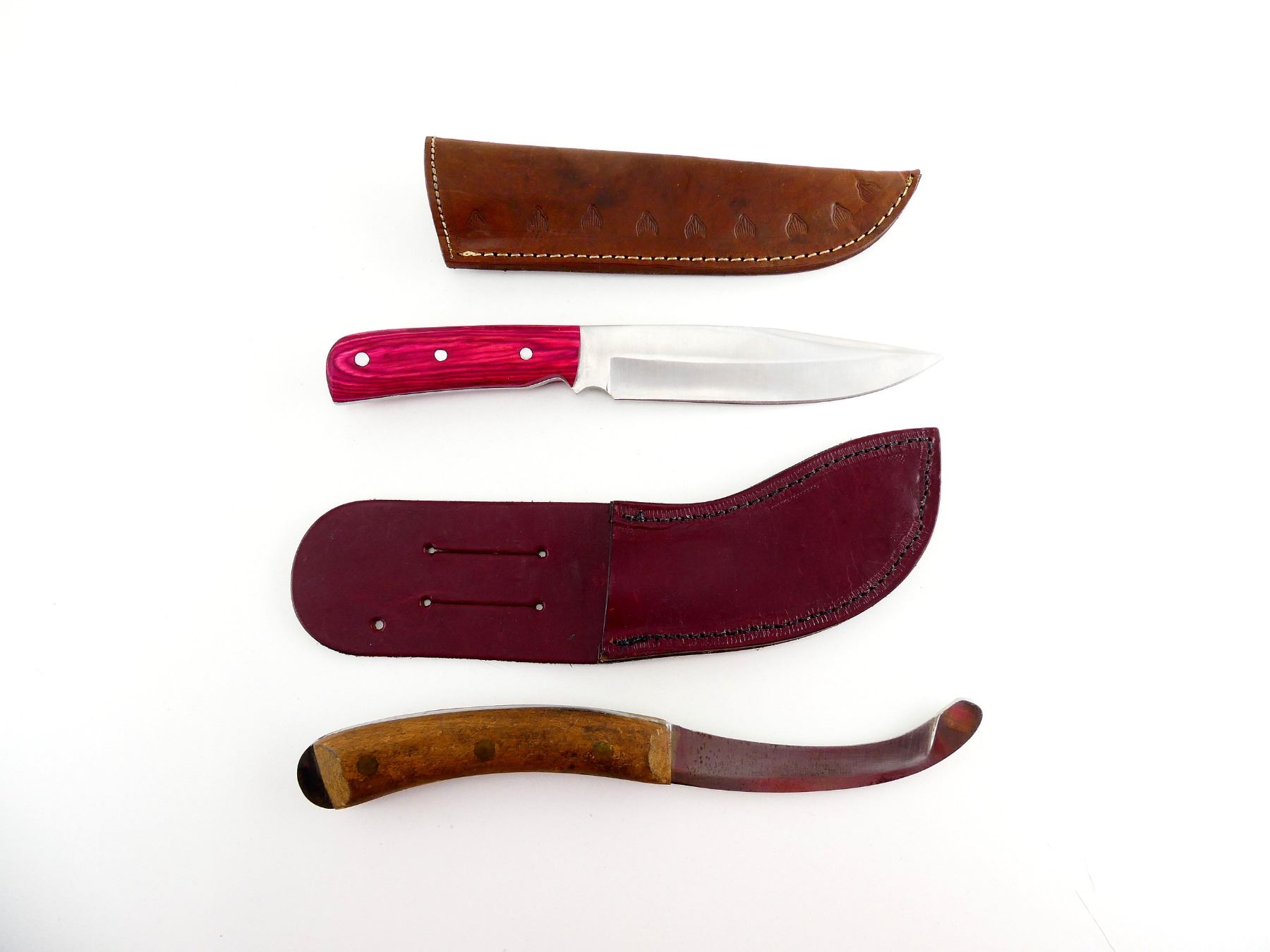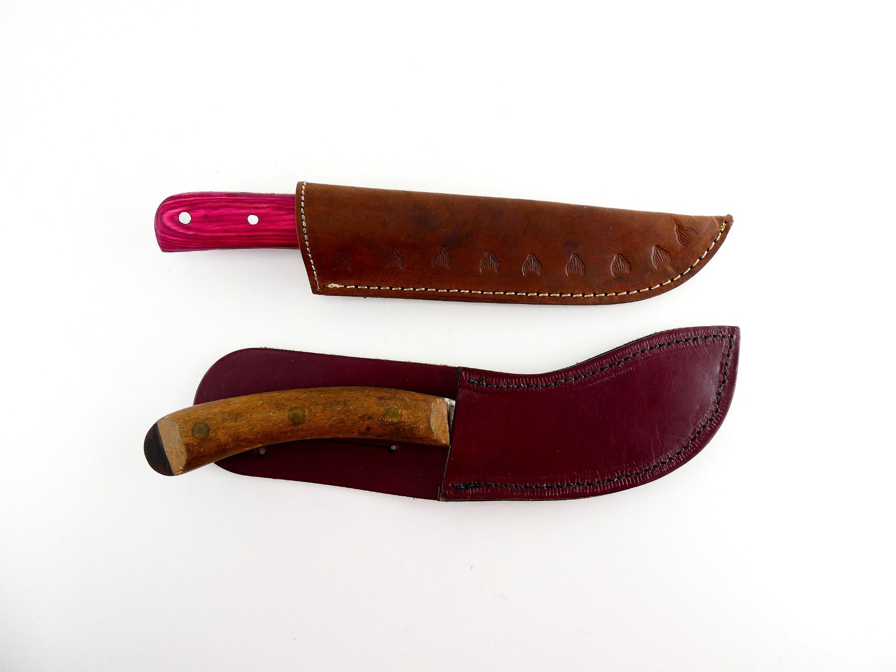 LOT INCLUDES; (1) PARACHUTE RELEASE KNIFE, STEEL BLADE, UNMARKED, WOODEN HANDLE, UNMARKED, SHOWS WEAR & TEAR / USE MARKS, BLADE OVERALL LENGTH APPROX. 5 1/8", OVERALL LENGTH APPROX. 11 1/8", WITH RED LEATHER SHEATH, UNMARKED & (1) UNKNOWN KNIFE, STEEL BLADE, UNMARKED, WOODEN HANDLE, UNMARKED, SHOWS WEAR & TEAR / USE MARKS, BLADE OVERALL LENGTH APPROX. 6.75", OVERALL LENGTH APPROX. 11", WITH BROWN LEATHER SHEATH, EMBOSSED WITH DESIGN. SEE PHOTOS.