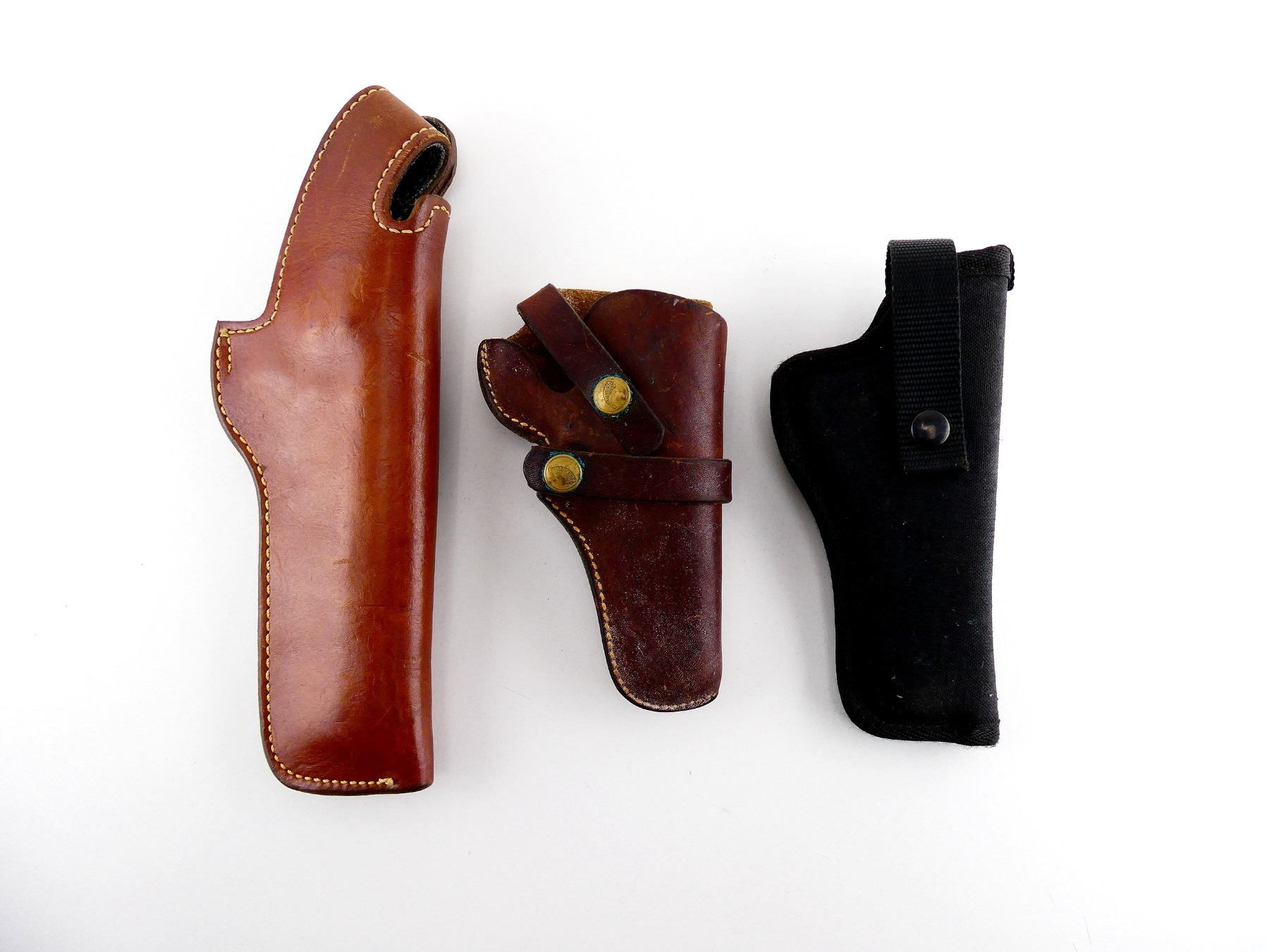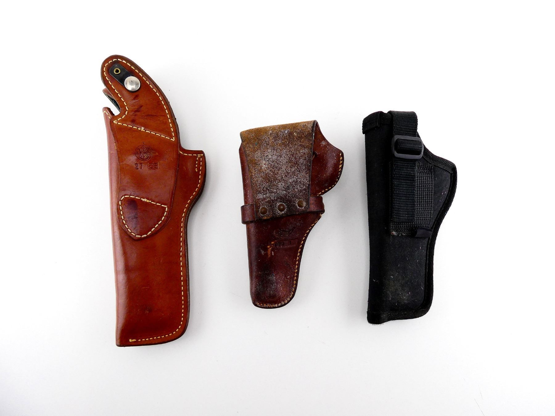 LOT INCLUDES; (1) SMITH & WESSON HOLSTER, BROWN LEATHER, MARKED WITH SMITH & WESSON LOGO, ETC., FITS RH, SHOWS WEAR & TEAR / USE MARKS, OVERALL LENGTH APPROX. 11.5", (1) HUNTER HOLSTER, BROWN LEATHER, MARKED WITH HUNTER LOGO, ETC., FITS RH, SHOWS WEAR & TEAR / USE MARKS, OVERALL LENGTH APPROX. 7.5" & (1) UNCLE MIKE'S HOLSTER, BLACK NYLON, SIZE 5, UNMARKED, FITS RH, SHOWS WEAR & TEAR / USE MARKS, OVERALL LENGTH APPROX. 8.25". SEE PHOTOS.