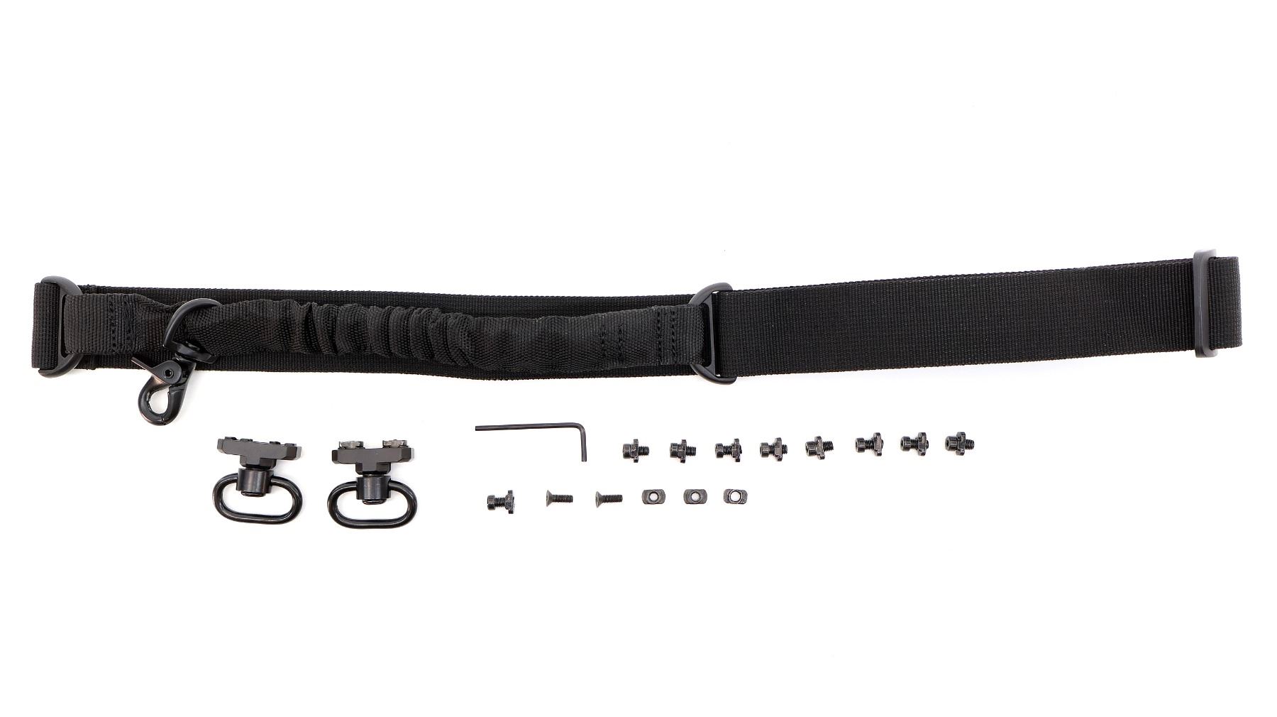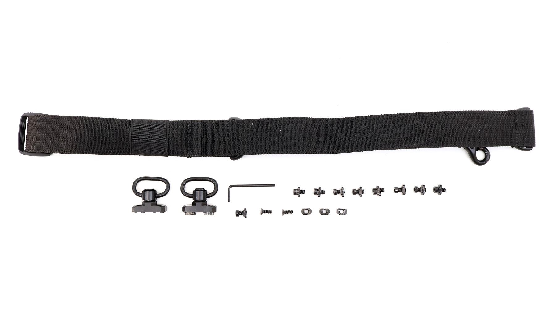 LOT INCLUDES; (1) BLACK NYLON SINGLE POINT ELASTICIZED SLING, OVERALL LENGTH APPROX. 26", ADJUSTABLE, (2) QD 1/5" SLING SWIVELS WITH M LOCK MOUNTS, M LOCK SCREWS WITH NUTS, ETC. MAY REQUIRE FITTING. SEE PHOTOS.