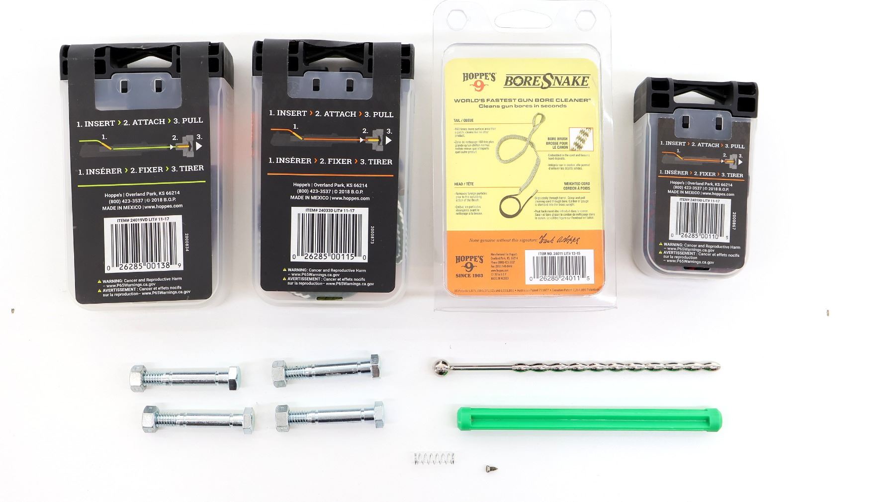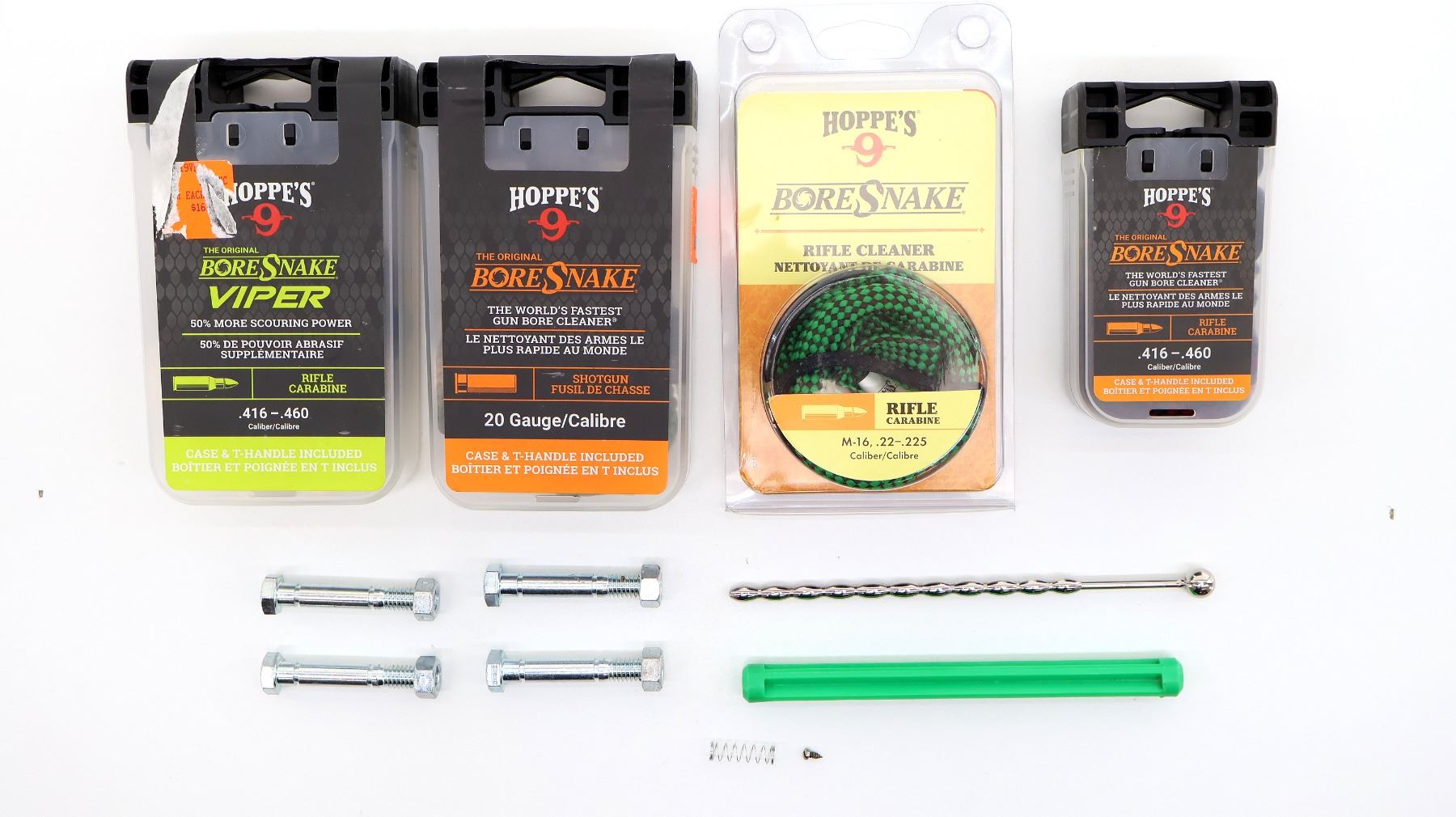 LOT INCLUDES; (1) HOPPE'S BORE SNAKE, .416-.460 CAL. RIFLE CARBINE, APPEARS NEW OLD STOCK, IN ORIGINAL PACKAGING, (1) HOPPE'S VIPER BORE SNAKE, .416-.460 CAL. RIFLE CARBINE, NEW OLD STOCK, SEALED IN ORIGINAL PACKAGING, (1) HOPPE'S BORE SNAKE, 20 GA. SHOTGUN, NEW OLD STOCK, SEALED IN ORIGINAL PACKAGING & (1) HOPPE'S BORE SNAKE, M-16 / .22-.225 CAL. RIFLE CARBINE, APPEARS NEW OLD STOCK, IN ORIGINAL PACKAGING, ETC. SEE PHOTOS.