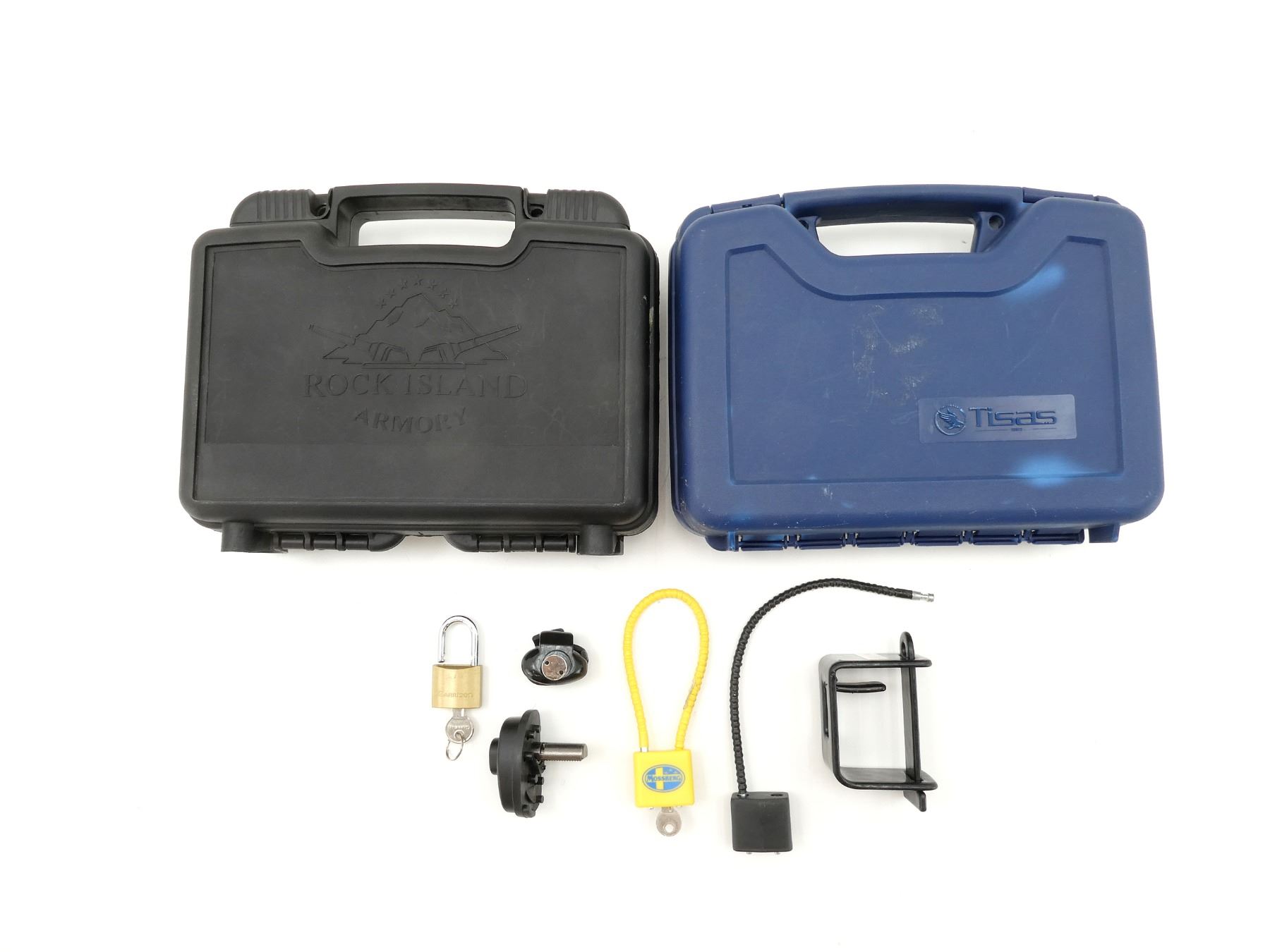LOT INCLUDES; (2) ASSORTED CABLE LOCKS, WITH ONE KEY, (1) POLYMER TRIGGER LOCK, (1) GARRISON PAD LOCK, WITH KEY, (1) METAL WALL GUN BRACKET, (2) ASSORTED HARD PADDED HANDGUN CASES, ONE MARKED: "TISAS" / ONE MARKED: "ROCK ISLAND", ETC. SEE PHOTOS.