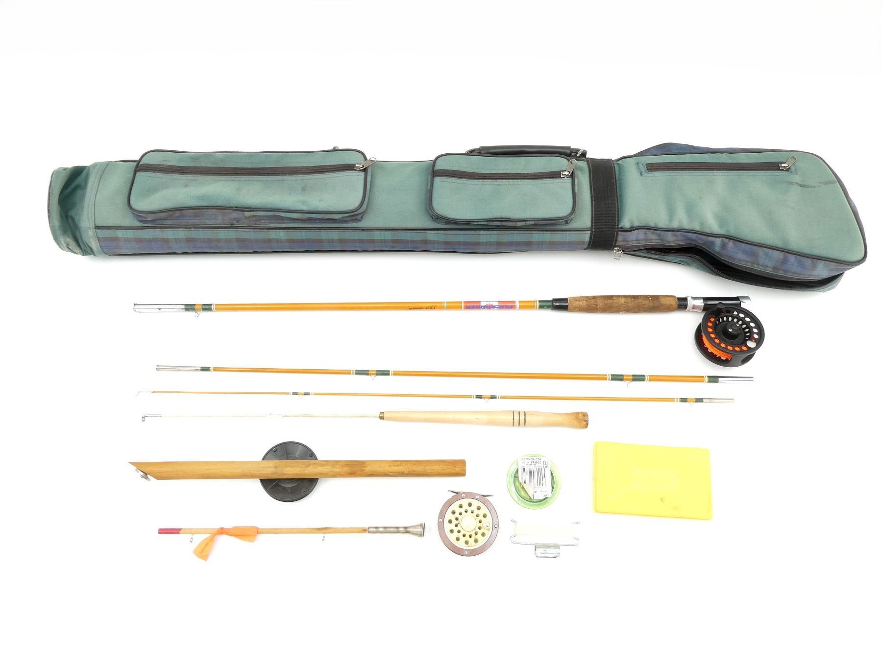 LOT INCLUDES; (1) 3-PIECE ROD, MARKED "NO. 77-4522", WITH FAIRPLAY REEL ATTACHED, IN PROTECTIVE CASE WITH ZIPPER CLOSURE & CARRY HANDLE, (1) COMPAC 25 REEL, (1) CABELA'S FRESHWATER TIPPET, SIZE 5X, 4.9LB (2.2KG) TEST, (1) COMPAC CASE WITH ASSORTED FLIES & (2) ICE FISHING RODS, VARIOUS MAKERS, UNTESTED, MAY BE INCOMPLETE OR MISSING PARTS, ETC. SEE PHOTOS.
