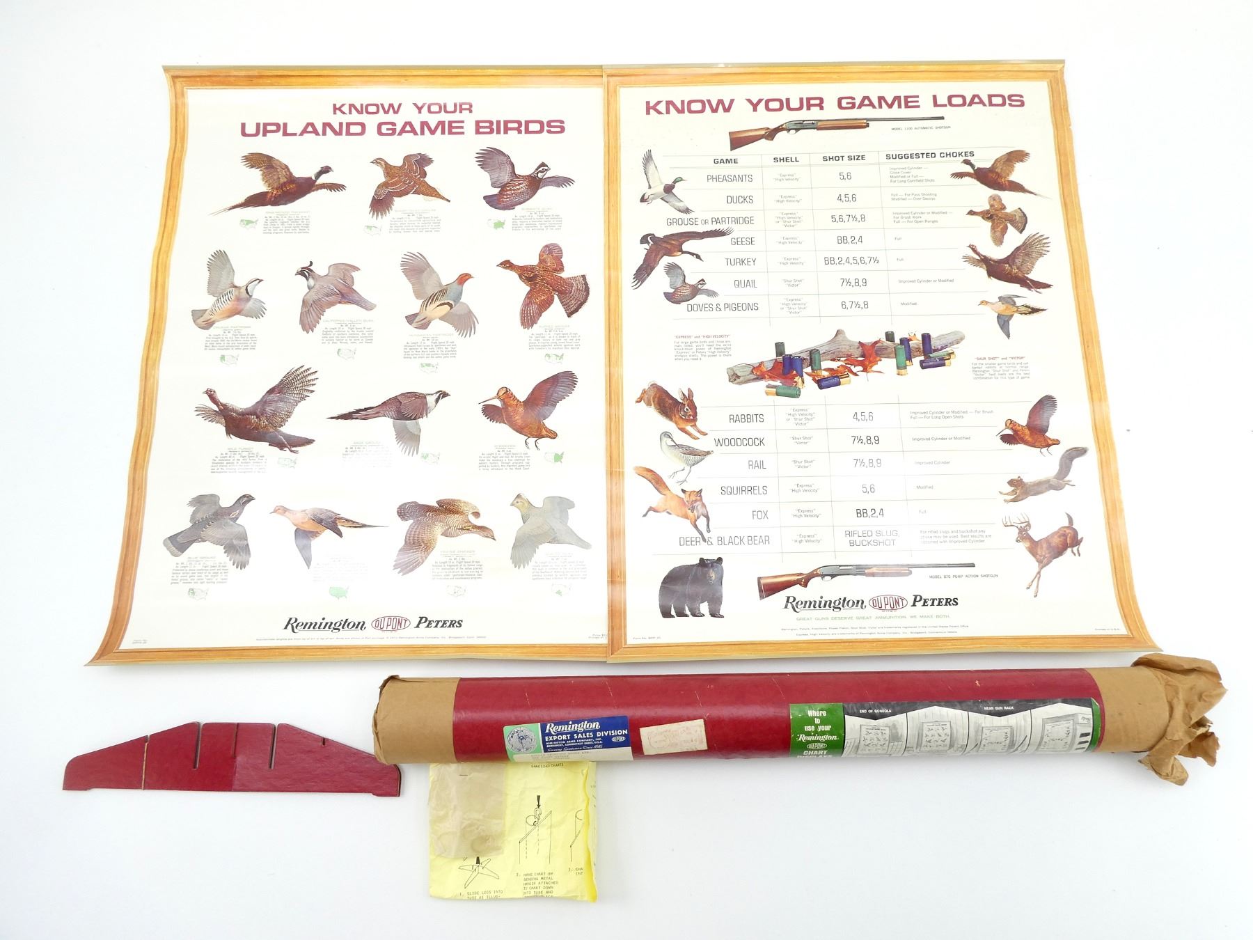 LOT INCLUDES; (1) "KNOW YOUR GAME LOADS" REMINGTON CHART DISPLAY, DATED 1952, SHOWS LIGHT WEAR & TEAR, OVERALL LENGTH APPROX. 29.5" X 23", (1) "KNOW YOUR UPLAND GAME BIRDS" REMINGTON CHART DISPLAY, DATED 1952, SHOWS LIGHT WEAR & TEAR, OVERALL LENGTH APPROX. 29.5" X 23" & (1) DISPLAY FOOTING WITH CLIP ACCESSORIES, WITH INSTRUCTIONS IN ORIGINAL PACKAGING, CONSIGNOR STATES: "NEW / UNUSED". SEE PHOTOS.