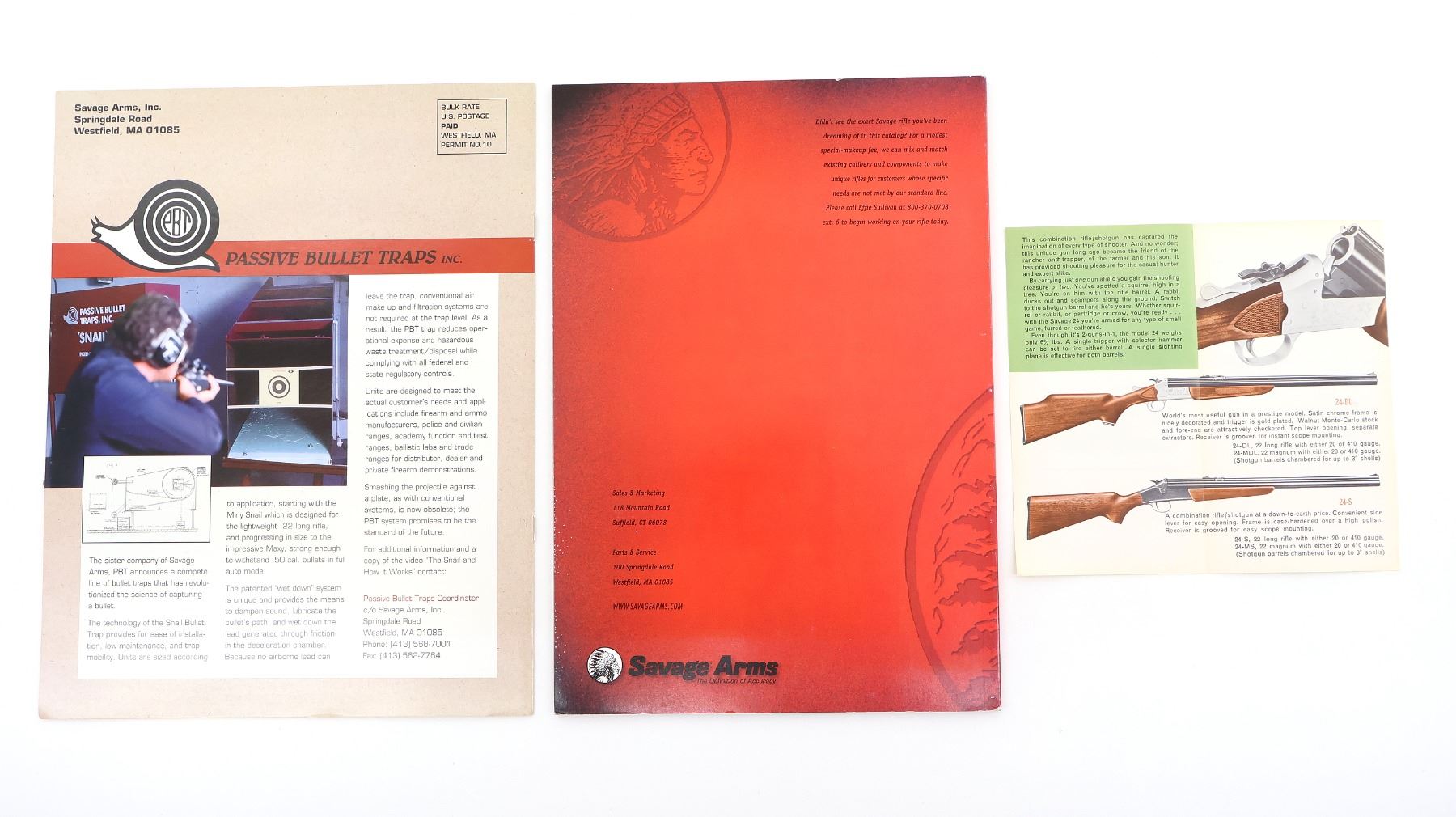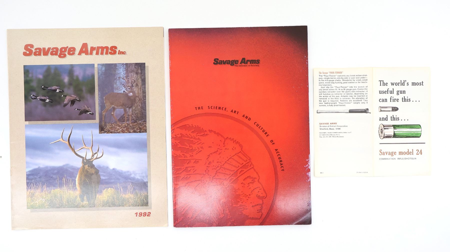 LOT INCLUDES; (2) SAVAGE ARMS CATALOGUES, SOFT COVER, 1 DATED 1992 & (1) SAVAGE MODEL 24 BROCHURE, SOFT COVER. SEE PHOTOS.