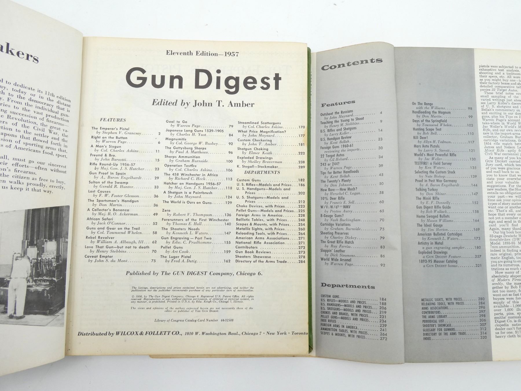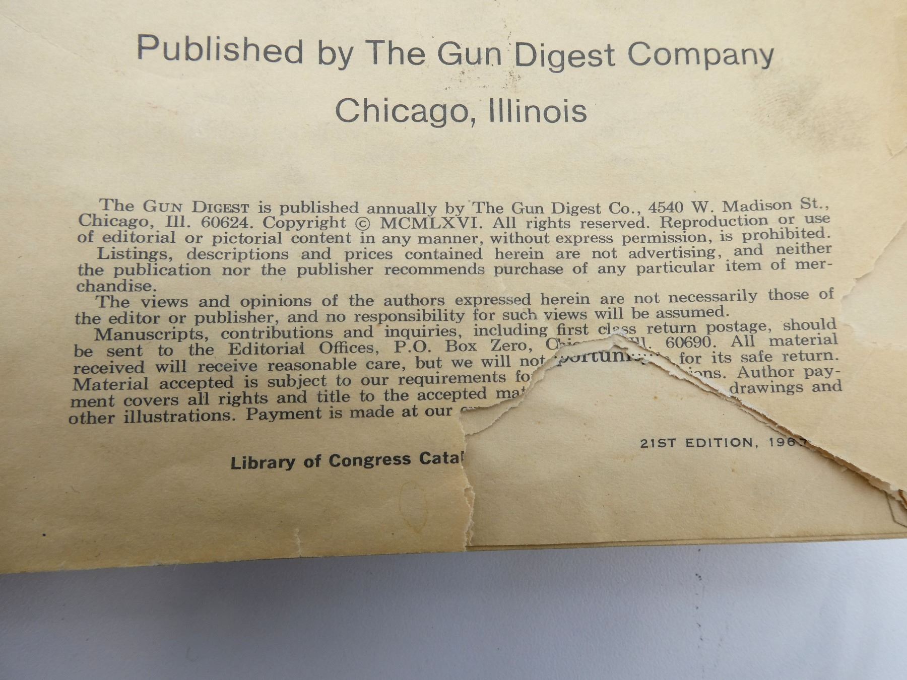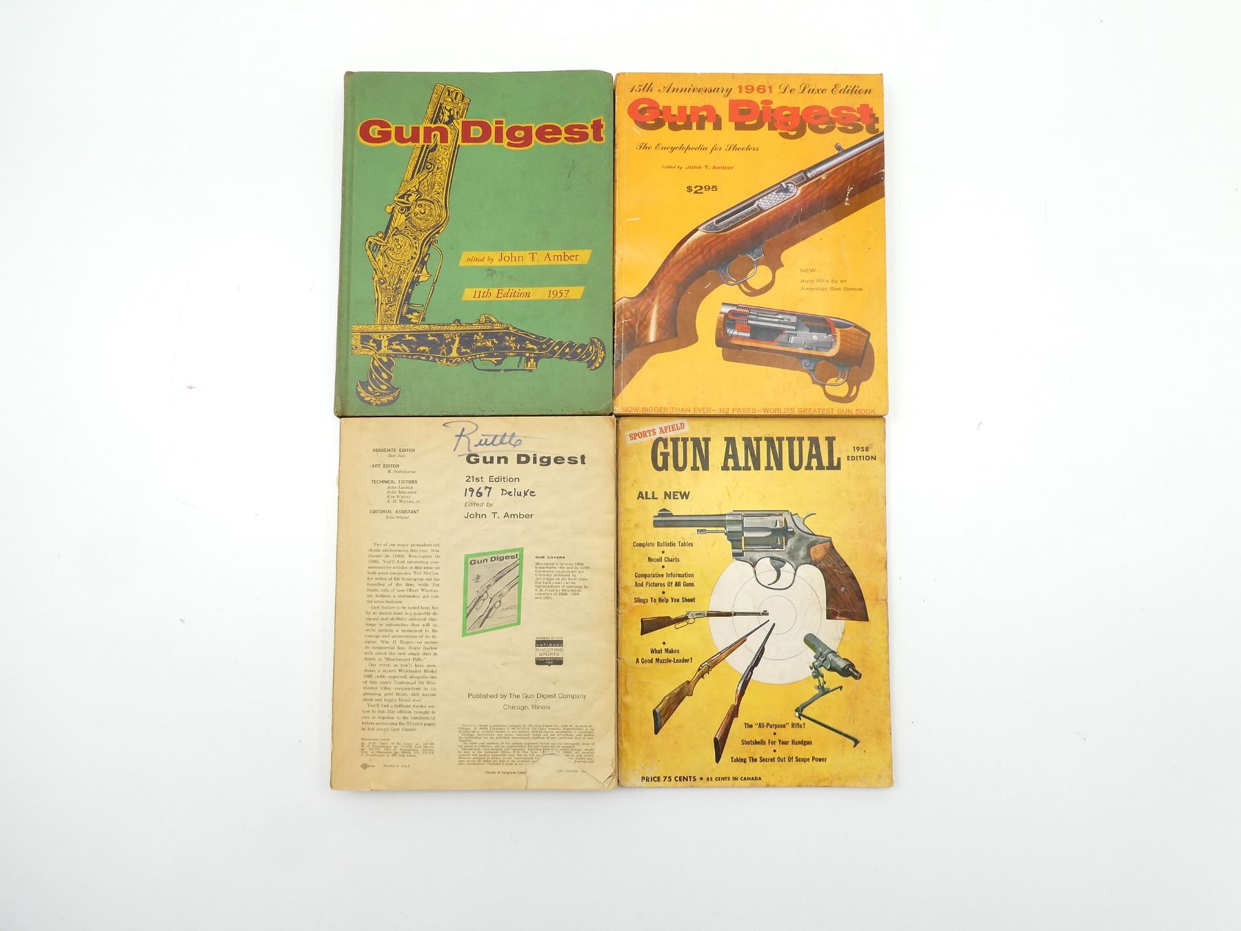 LOT INCLUDES; (3) "GUN DIGEST" CATALOGUES, 1957-1967, 2 SOFT COVERS / 1 HARD COVER, SERIES NOT COMPLETE / SOME ISSUES MISSING / MAY CONTAIN DUPLICATES & (1) "GUN ANNUAL", 1958 EDITION, SOFT COVER. SEE PHOTOS.