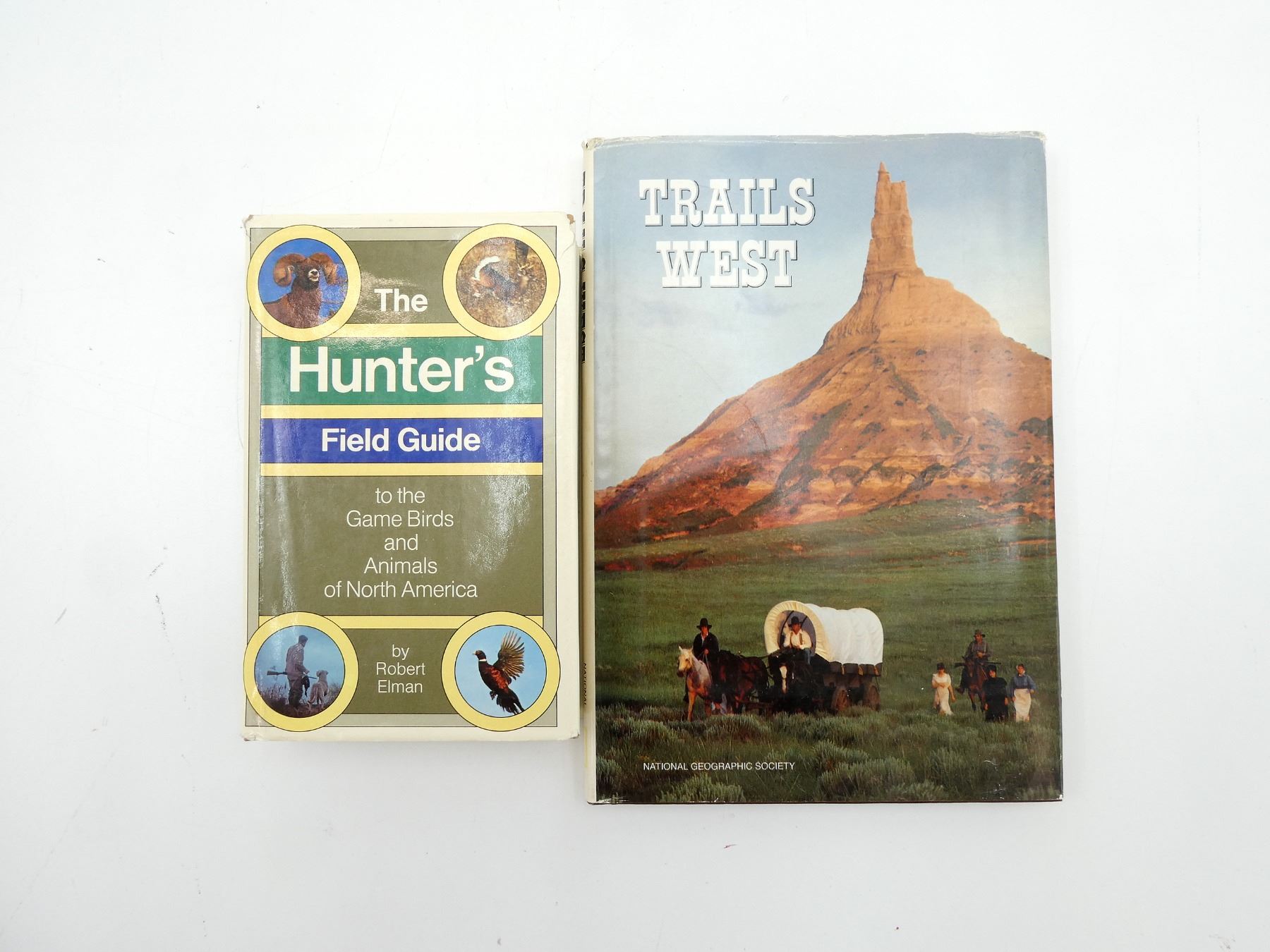 LOT INCLUDES; (1) "THE HUNTER'S FIELD GUIDE TO THE GAME BIRDS AND ANIMALS OF NORTH AMERICA", BY ROBERT ELMAN, HARD COVER WITH DUST COVER, ISBN: 0-394-47887-8 & (1) "TRAILS WEST", BY NATIONAL GEOGRAPHIC SOCIETY, HARD COVER WITH DUST COVER, ISBN: 0-87044-272-4. SEE PHOTOS.