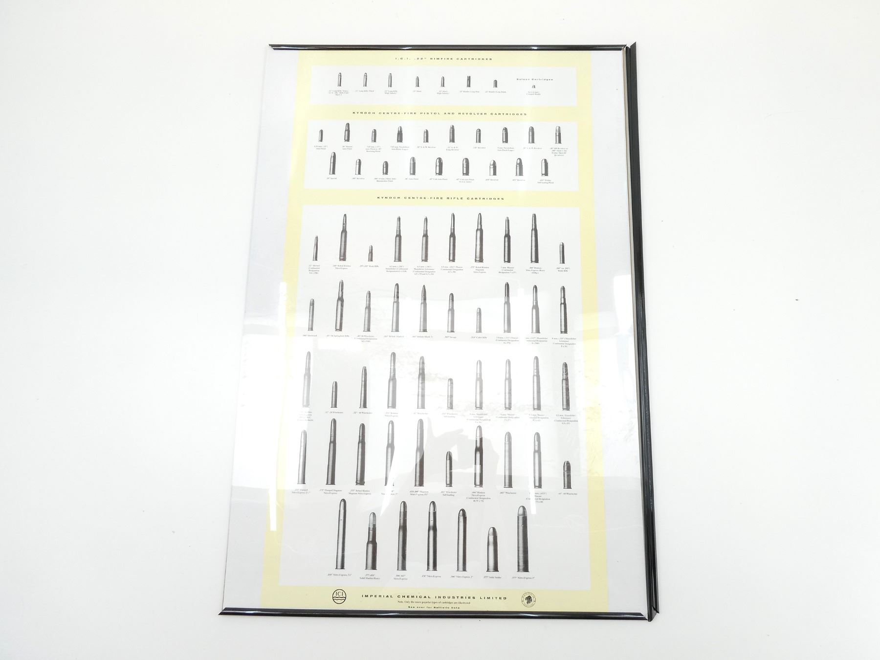 LOT INCLUDES; (1) I.C.I. POSTER, POPULAR CARTRIDGES ILLUSTRATED, POLYMER COVERED ON POSTER BOARD, OVERALL LENGTH APPROX. 3FT X 2FT & (2) POLYMER FRAME PIECES, BLACK, DETACHABLE / INTERCHANGEABLE. SEE PHOTOS.