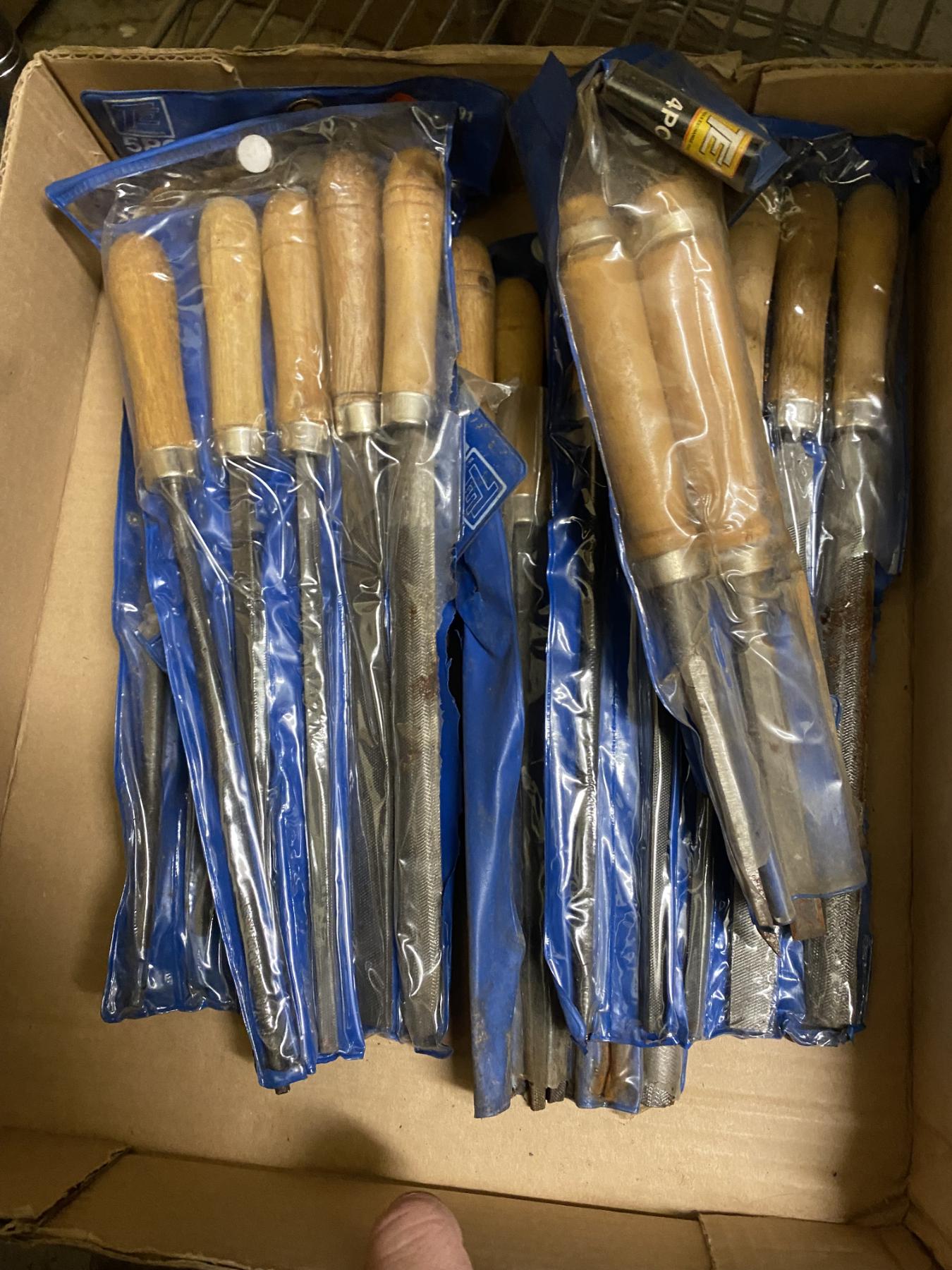 Lot 447 BOX OF ASSORTED WOOD CHISELS AND FILERS