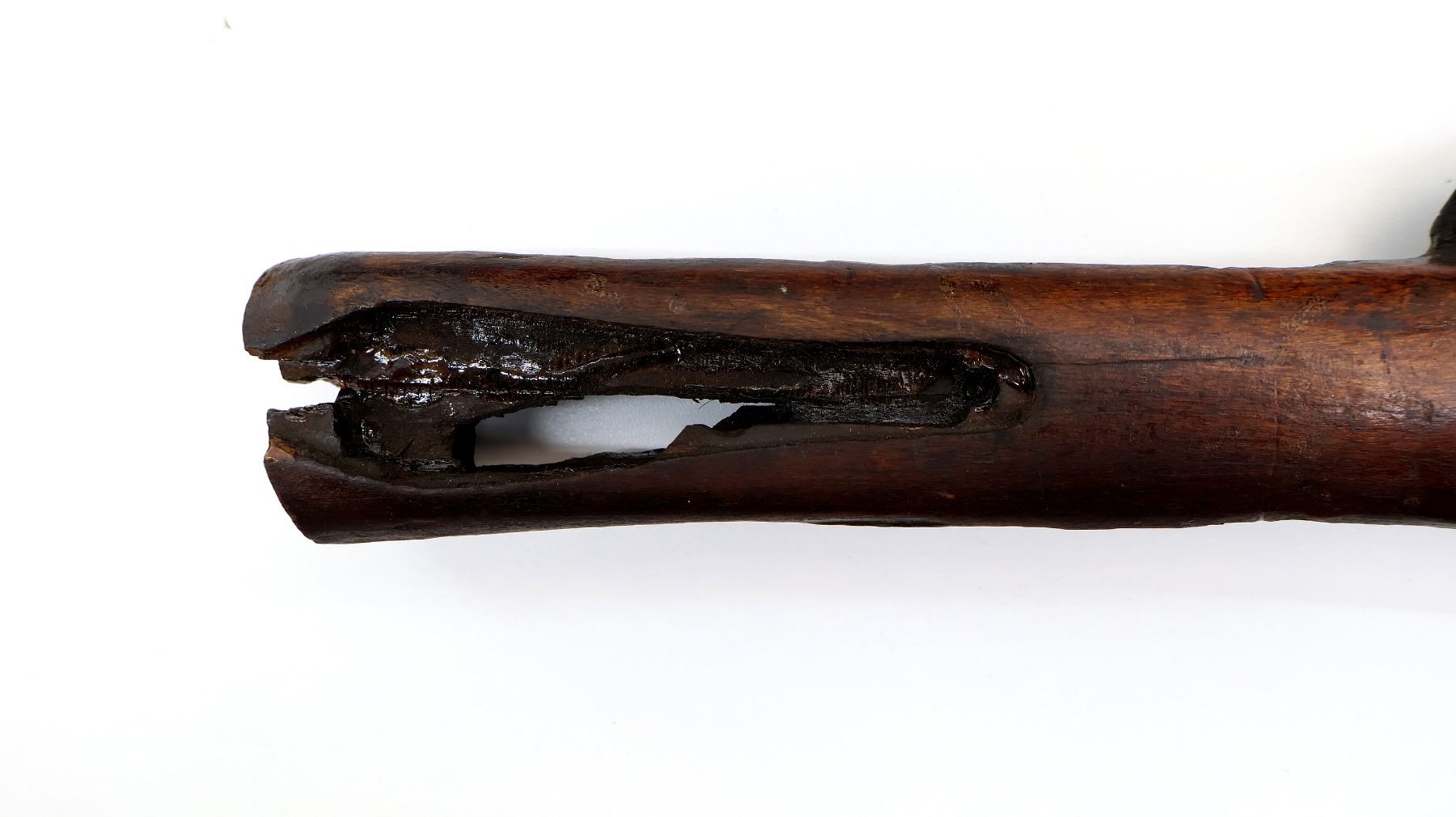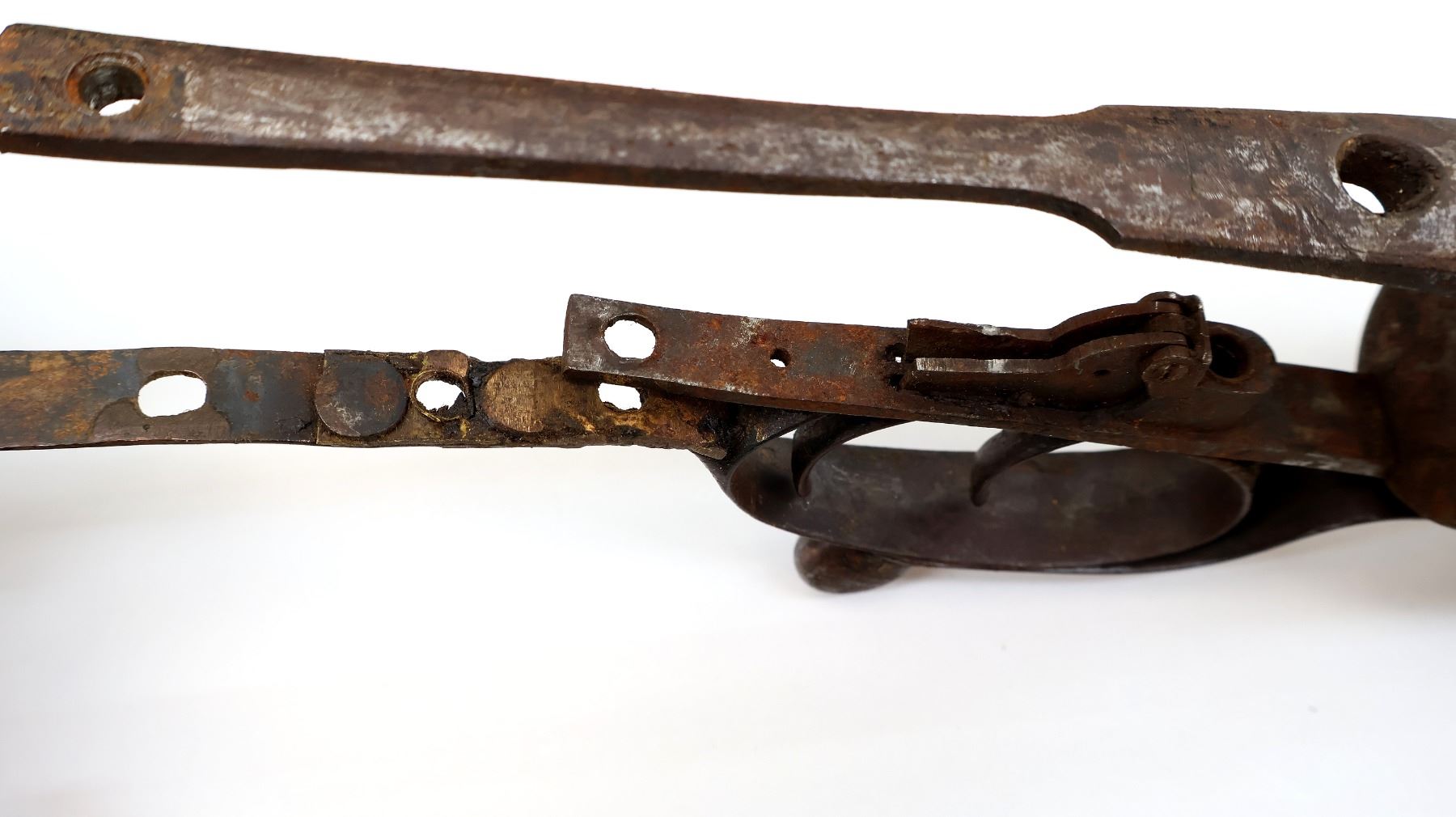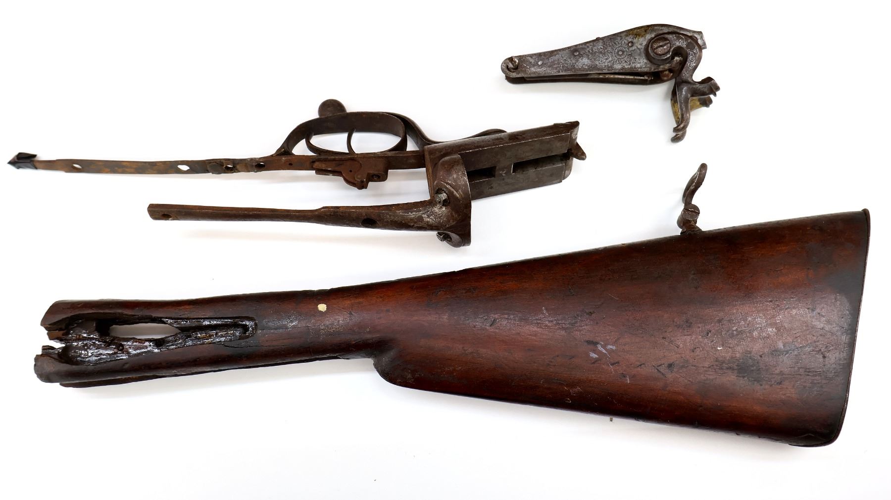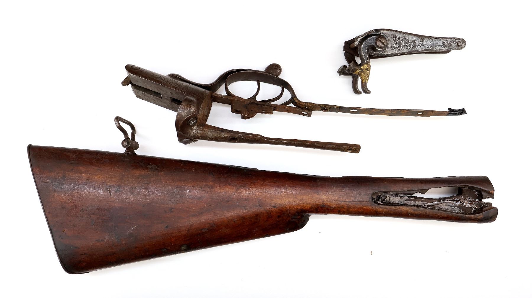 Main Description: Has engraved receiver with firing pins, triggers, underlever and repaired trigger guard. Not installed by included: Engraved back action locks with spur hammers, right side has been repaired, appear complete. One piece wood butt stock only, chipped, cracked and repaired with epoxy, smooth steel butt plate, sling swivel. No other parts or stocks are included.