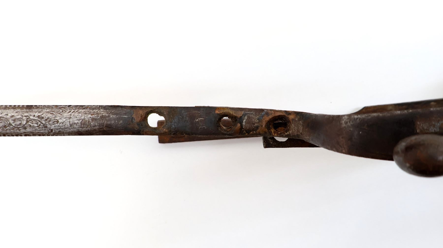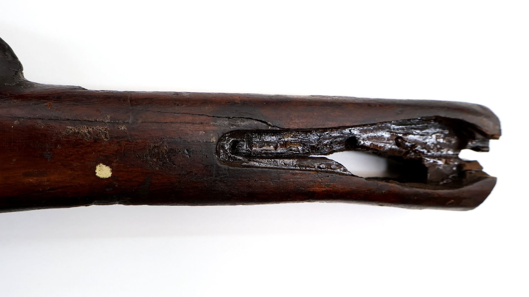 Wear: Metal finish turning brown with pitting, rust, scratches, handling marks and wear. Stock shows marks, scratches and wear.