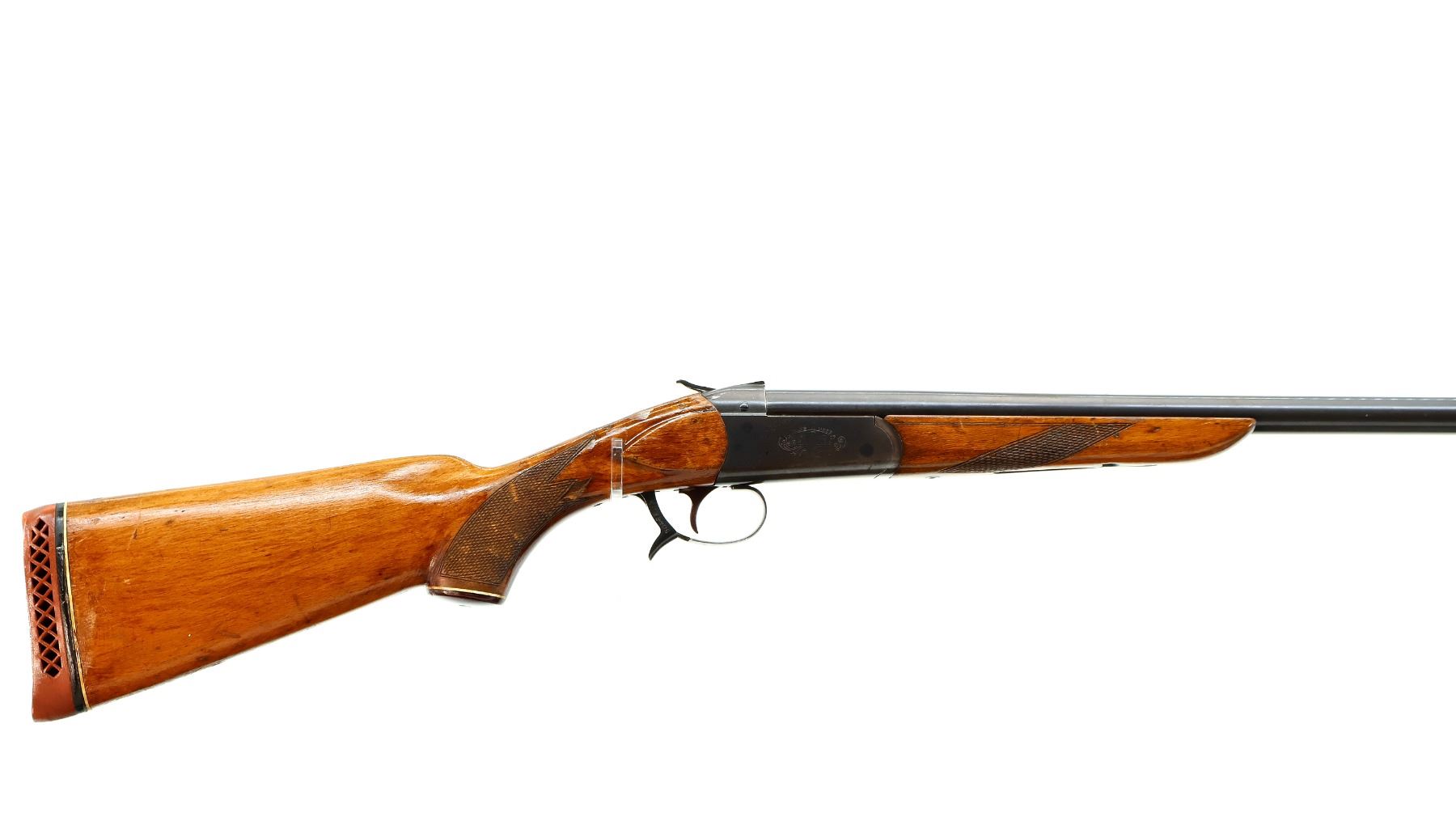 Main Description: Brass bead, blued finish, round barrel, grooved spur hammer, extractor, opening lever behind trigger guard. Two piece wood stocks, checkered forearm and pistol grip, butt stock is cracked behind trigger guard and receiver and is loose. Red vented rubber recoil pad, grip cap, missing butt swivel hole is present, has the front swivel stud.