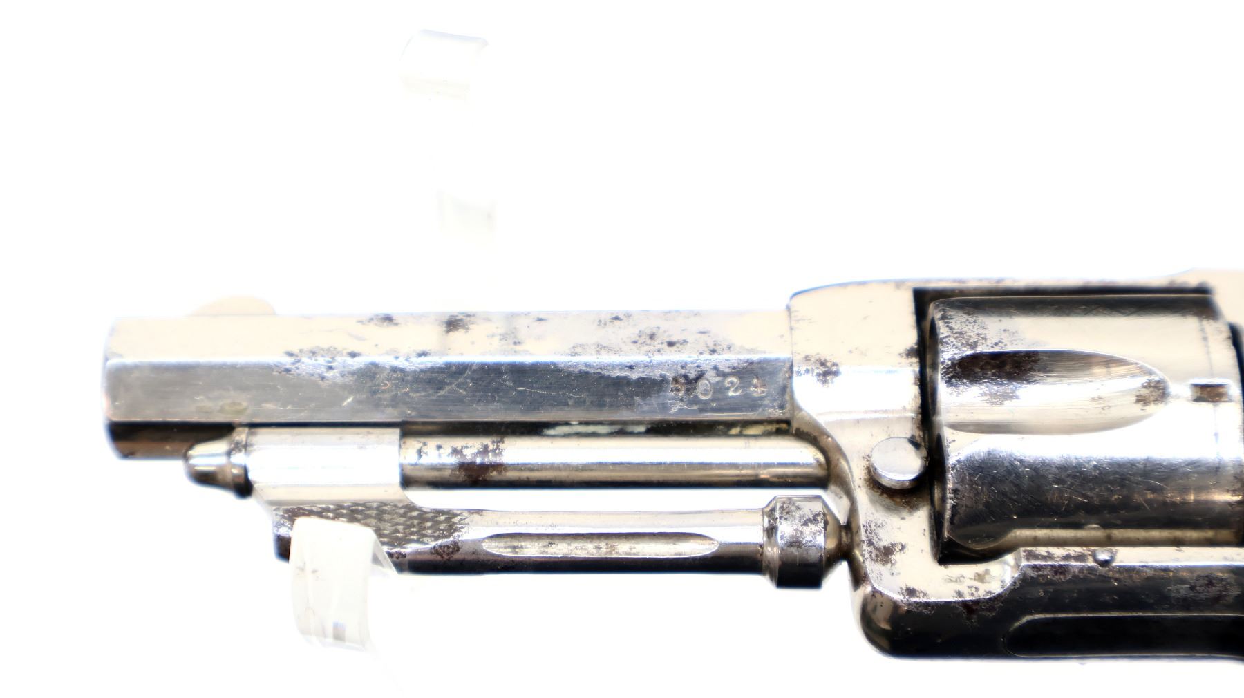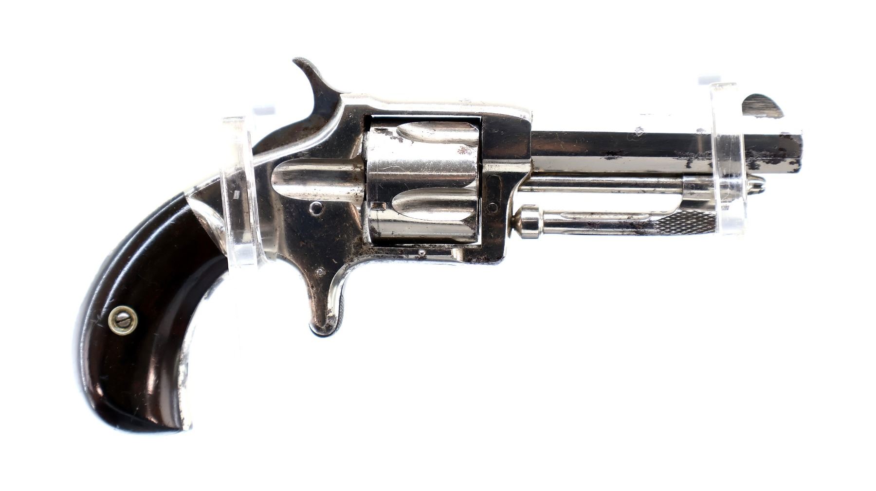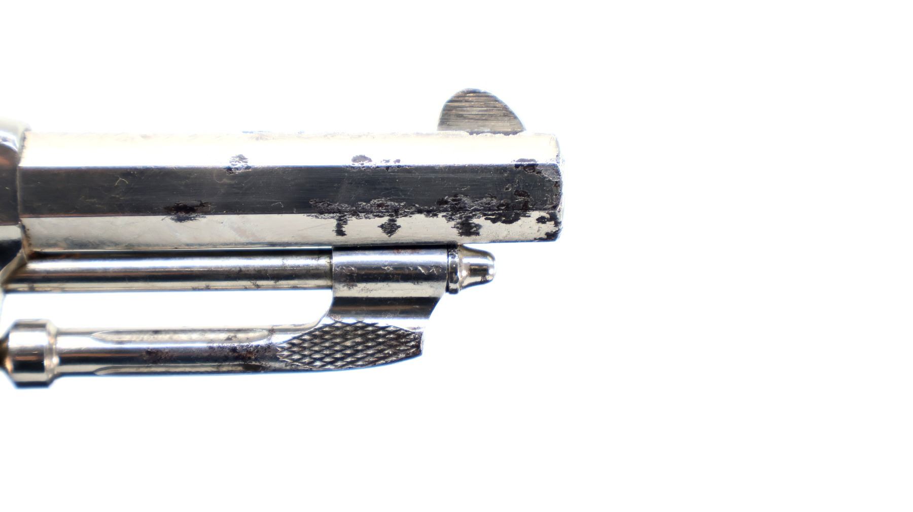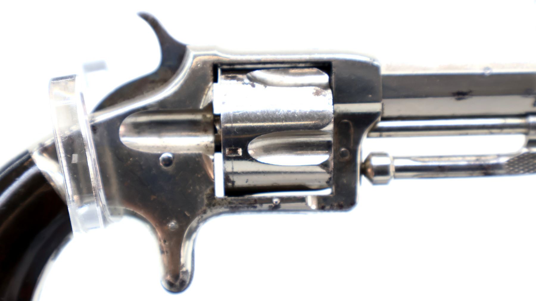 Main Description: Functions mechanically as designed. Blade front sight, fixed u notched rear sight, Nickel finish, octagon barrel, fluted cylinder, loading groove on right side of frame, checkered spur hammer and trigger, ejector rod under barrel.