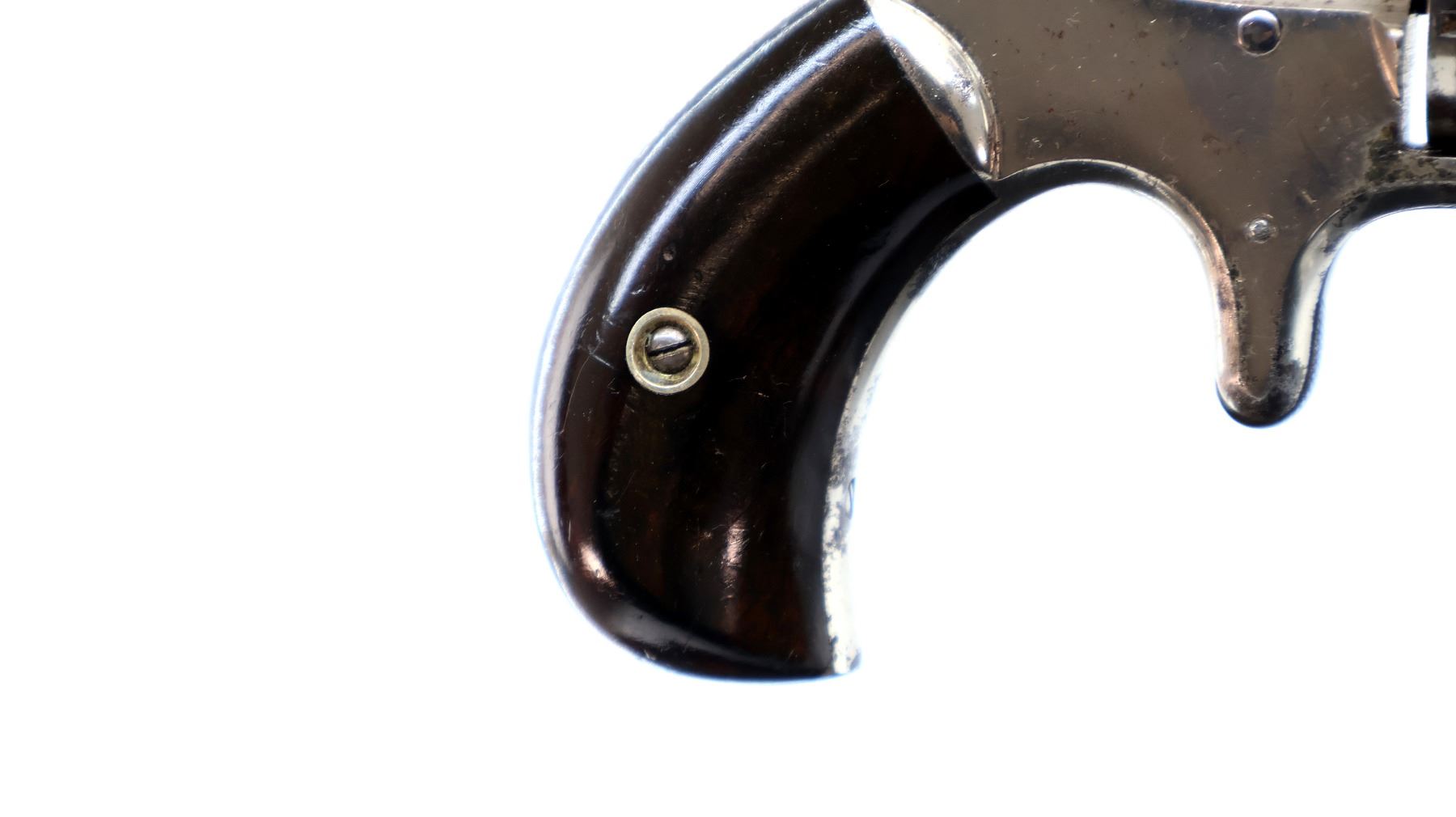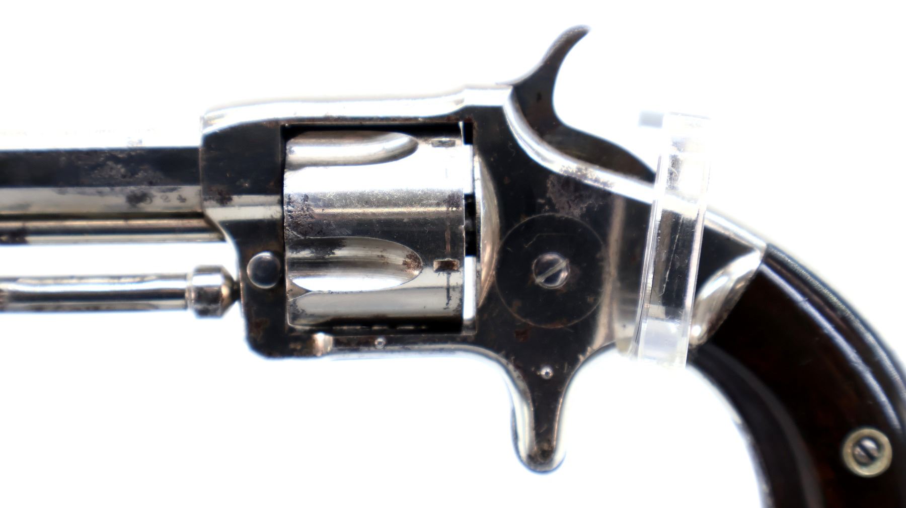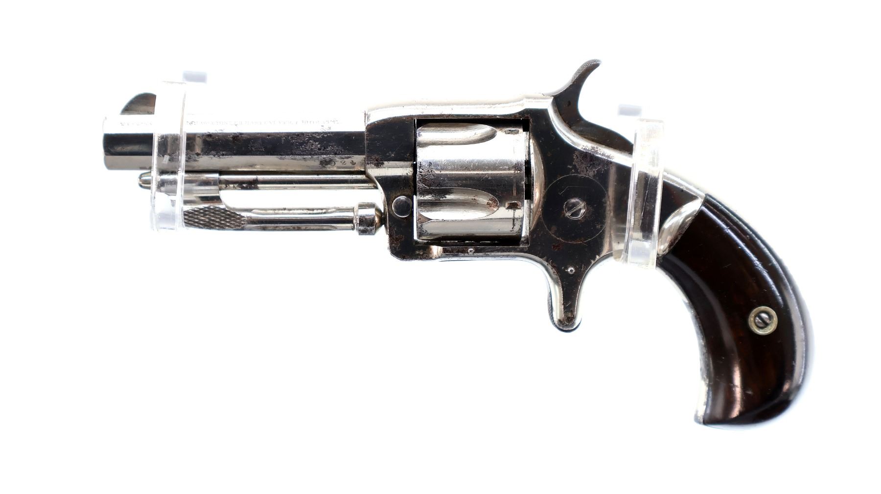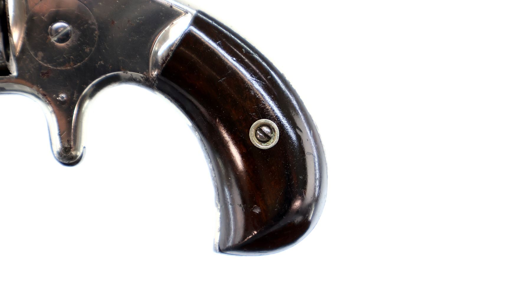 Main Description: Functions mechanically as designed. Blade front sight, fixed u notched rear sight, Nickel finish, octagon barrel, fluted cylinder, loading groove on right side of frame, checkered spur hammer and trigger, ejector rod under barrel.