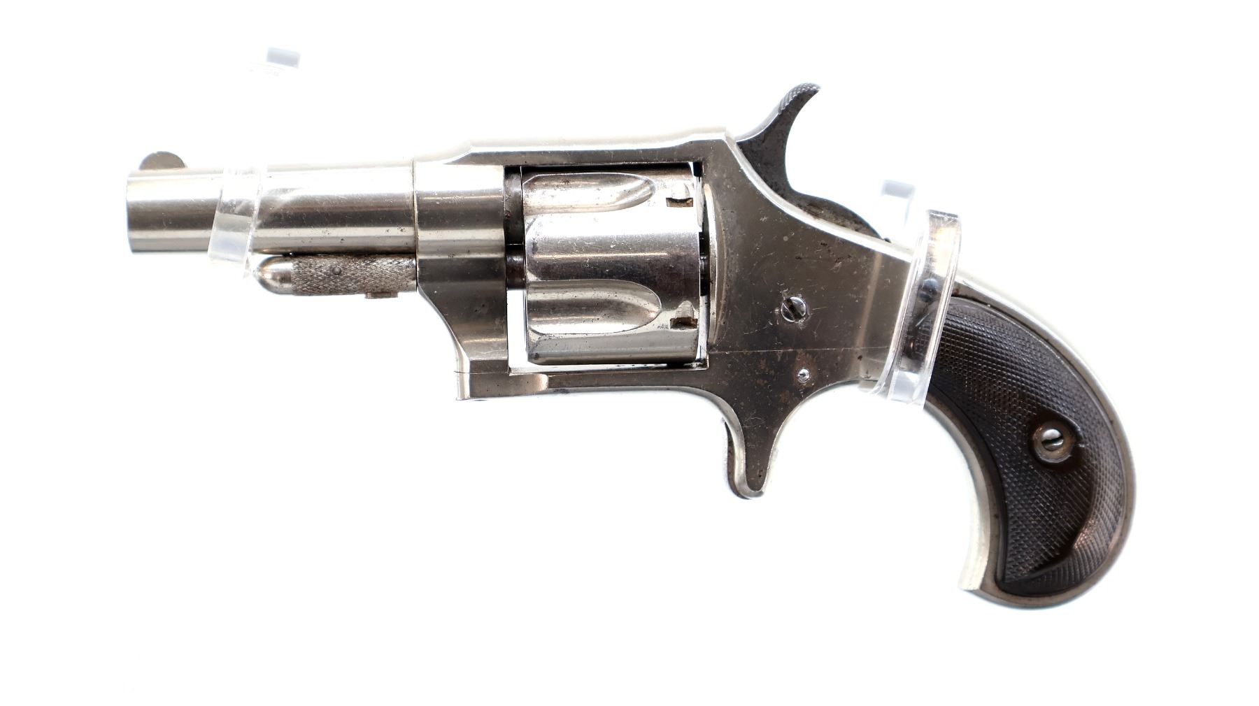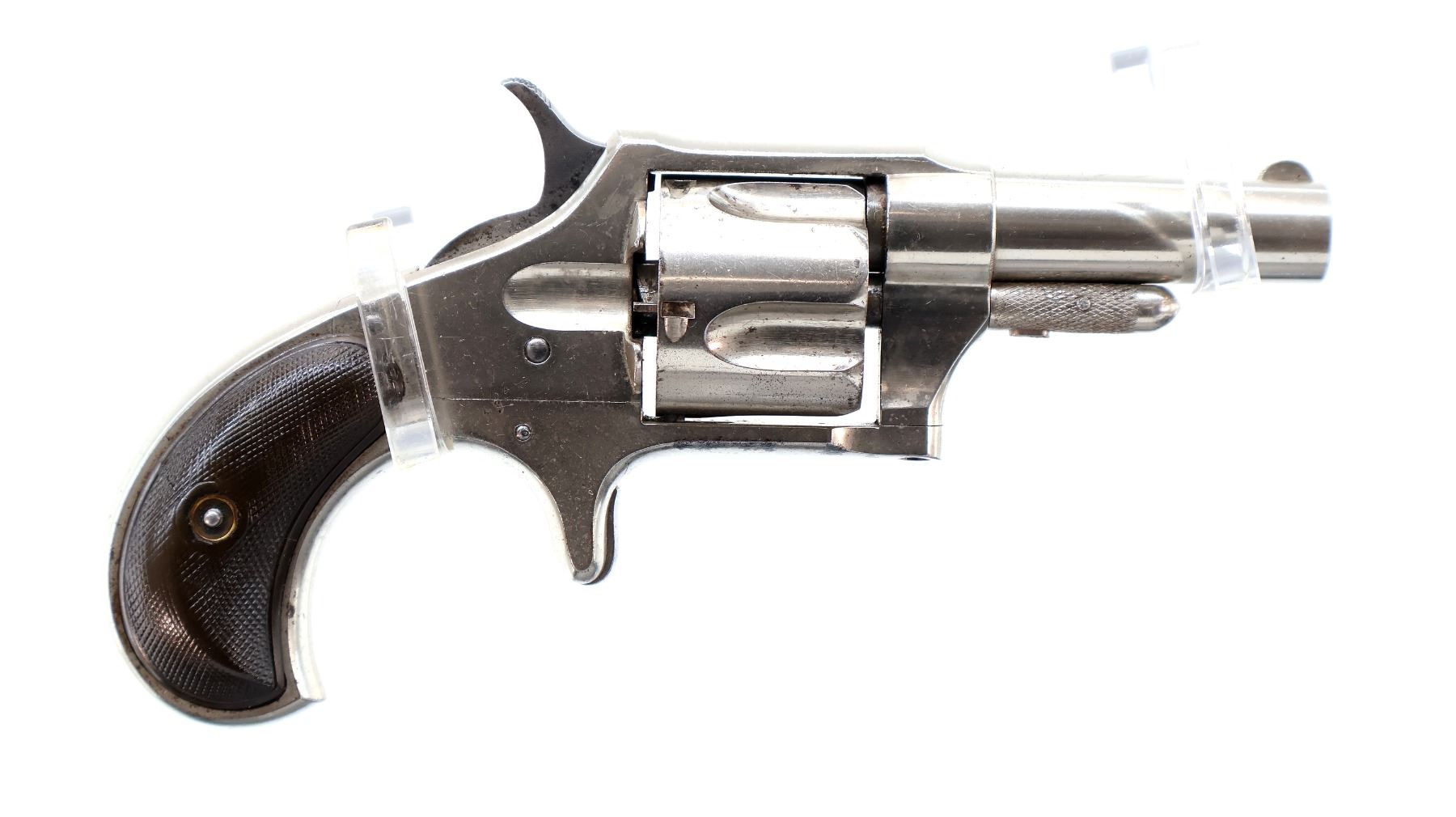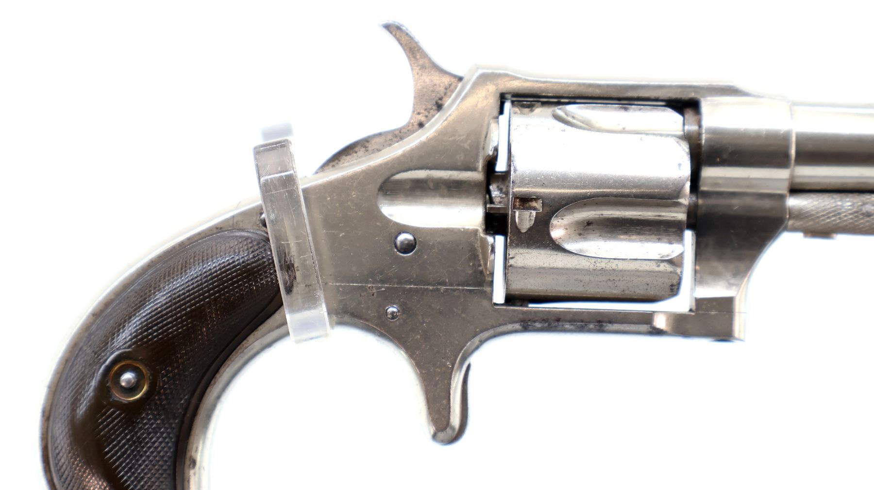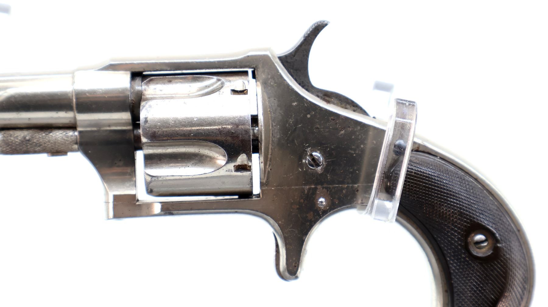 Main Description: Functions mechanically as designed. Blade front sight, fixed u notched rear sight, Nickel finish, round barrel, fluted cylinder, checkered spur hammer and smooth trigger. Two piece checkered brown polymer grips cracked on both sides, checkered cylinder pin.