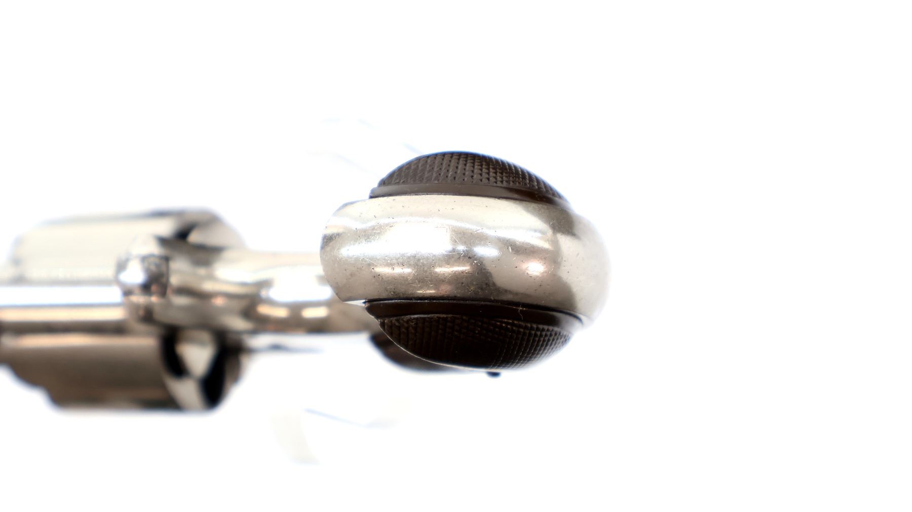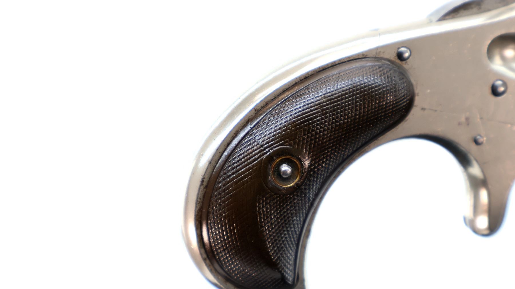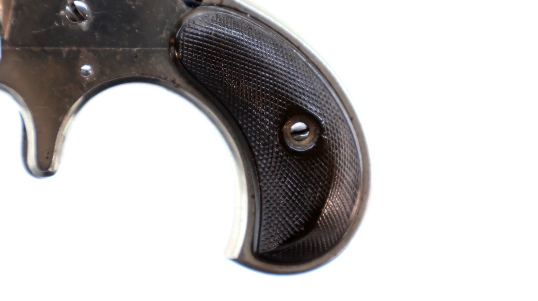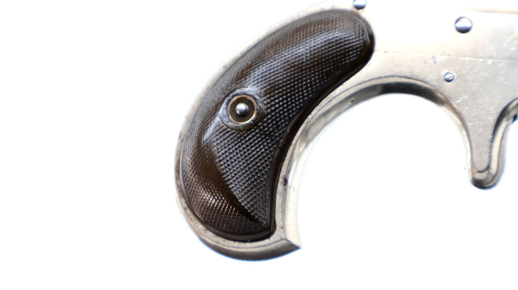 Main Description: Functions mechanically as designed. Blade front sight, fixed u notched rear sight, Nickel finish, round barrel, fluted cylinder, checkered spur hammer and smooth trigger. Two piece checkered brown polymer grips cracked on both sides, checkered cylinder pin.