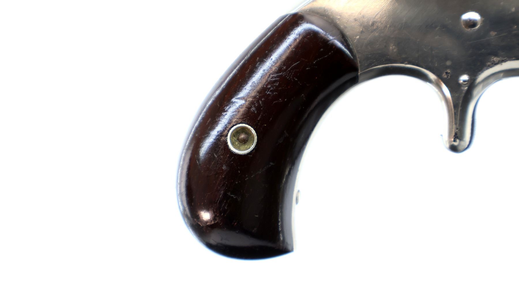Main Description: Functions mechanically as designed. Blade front sight, fixed u notched rear sight, Nickel finish, round barrel with raised rib, fluted cylinder, checkered spur hammer and trigger. Two piece smooth wood grips, ejector rod under barrel