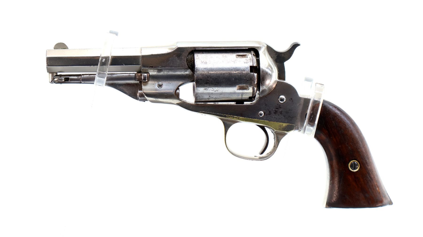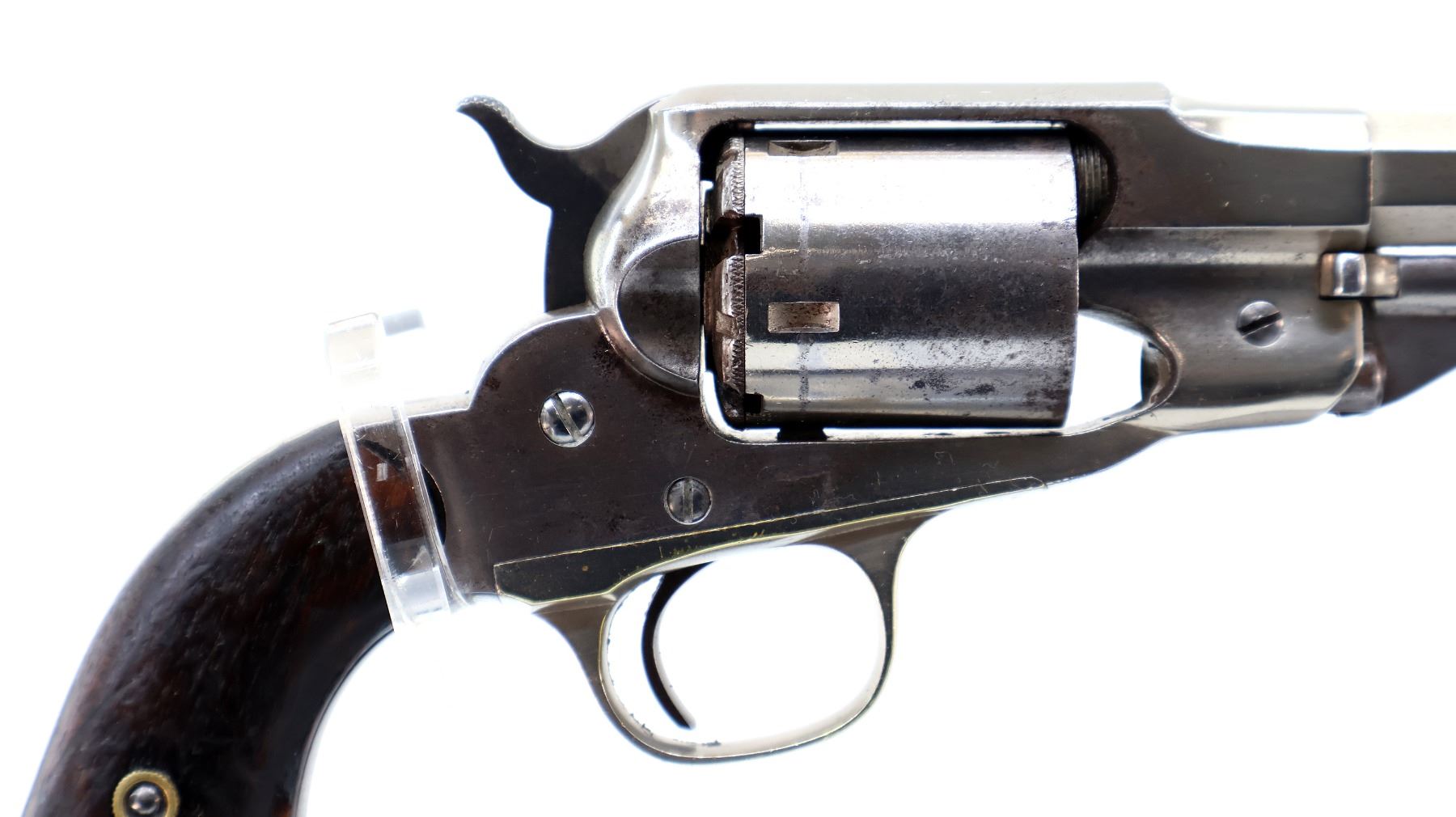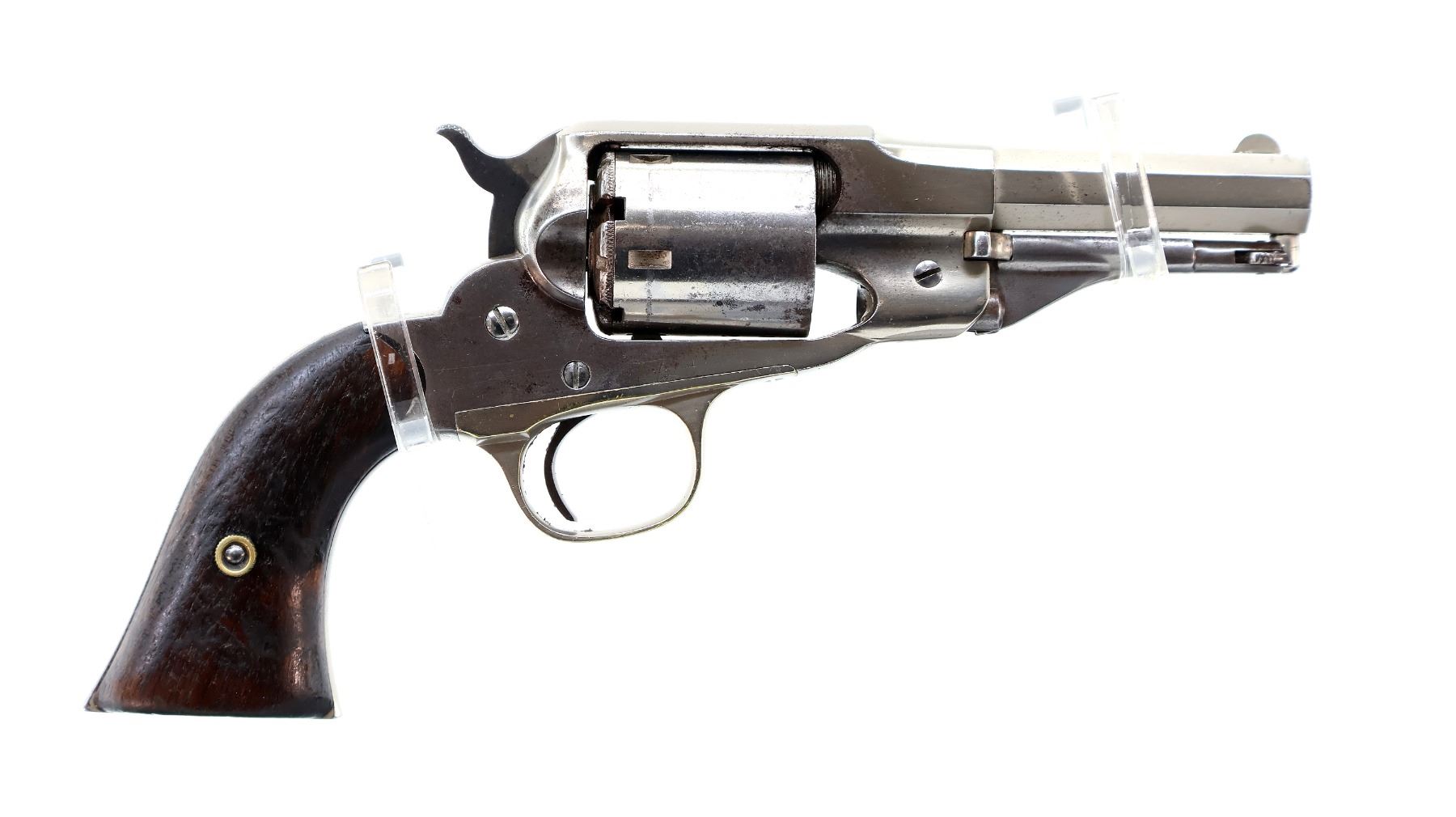 Main Description: Functions mechanically as designed. Blade front sight fixed u notched rear sight, Nickel finish, octagon barrel, smooth two piece cylinder, checkered spur hammer and smooth trigger, brass trigger guard. Two piece smooth wood grips, folding lever under barrel.