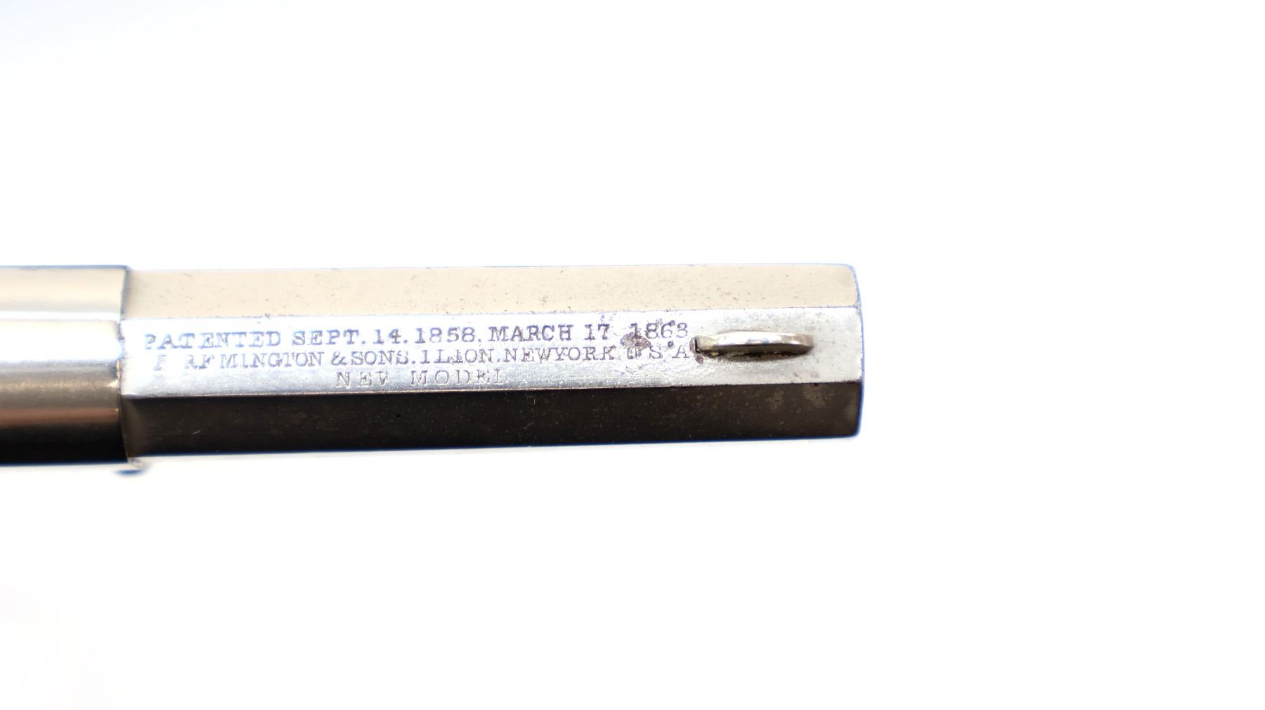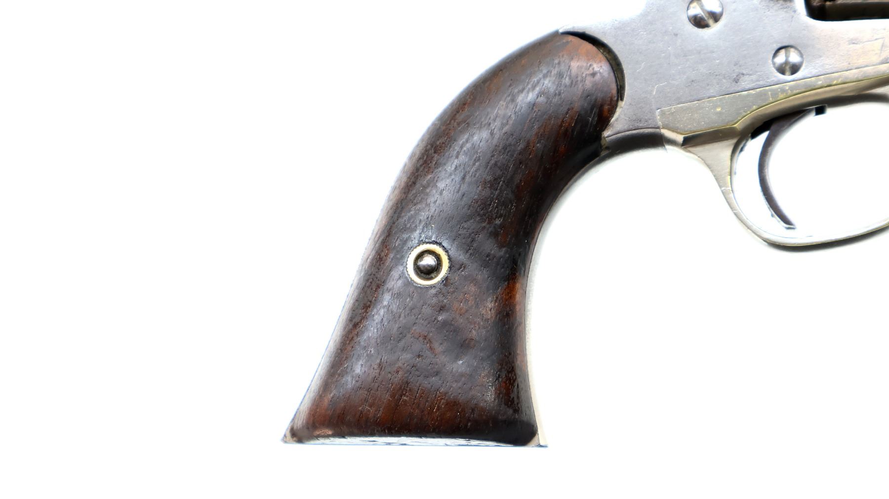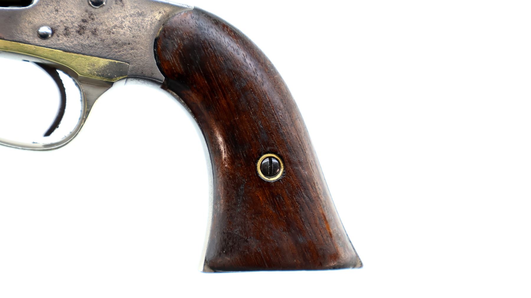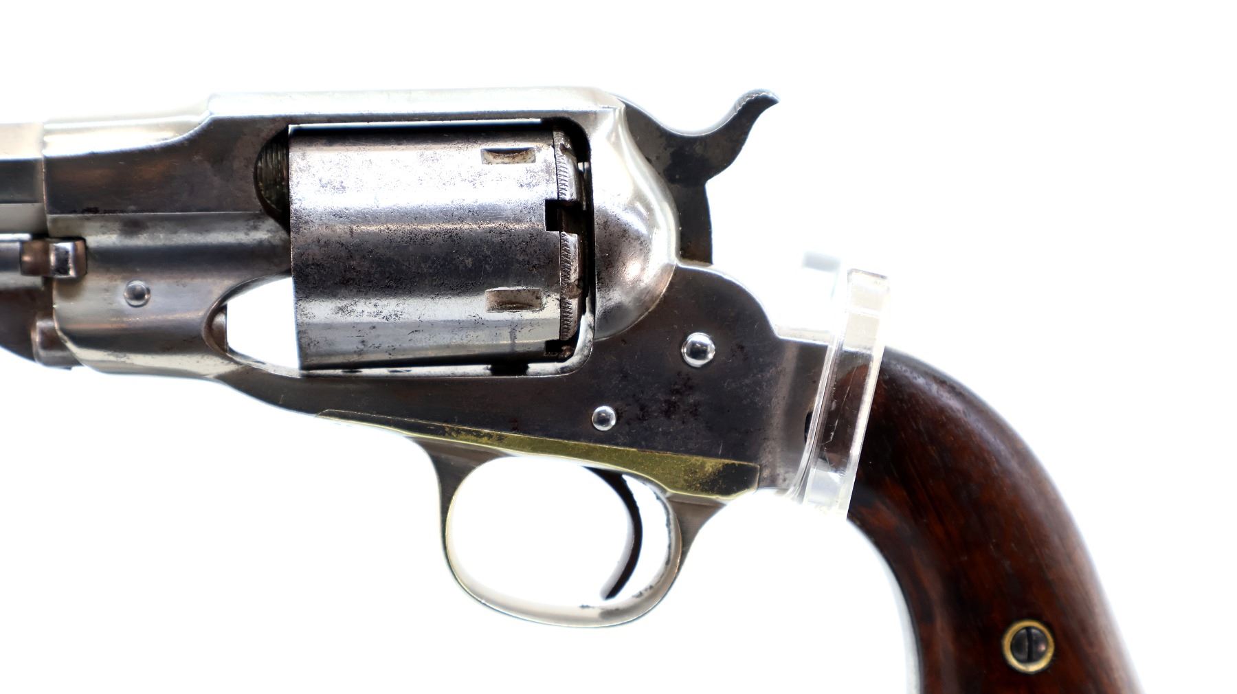 Main Description: Functions mechanically as designed. Blade front sight fixed u notched rear sight, Nickel finish, octagon barrel, smooth two piece cylinder, checkered spur hammer and smooth trigger, brass trigger guard. Two piece smooth wood grips, folding lever under barrel.