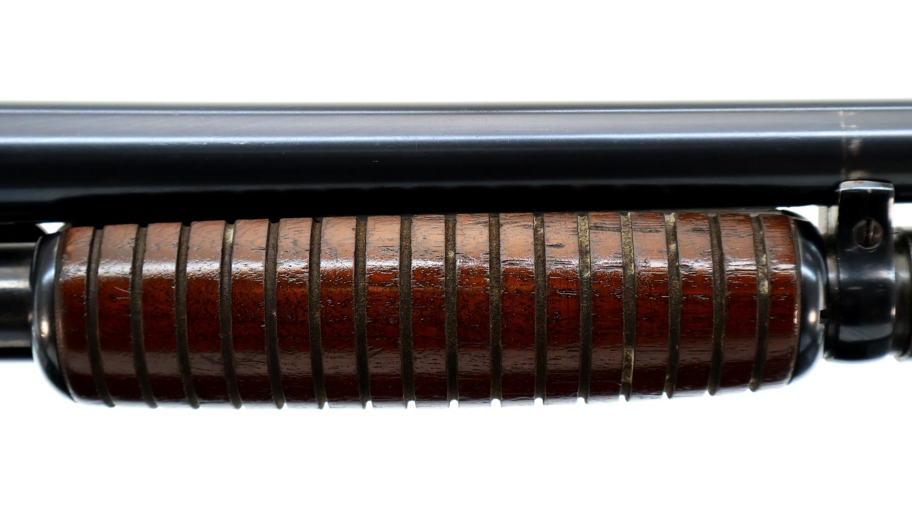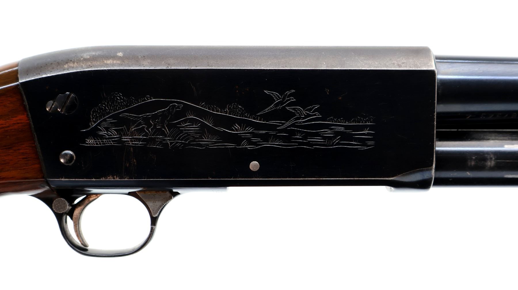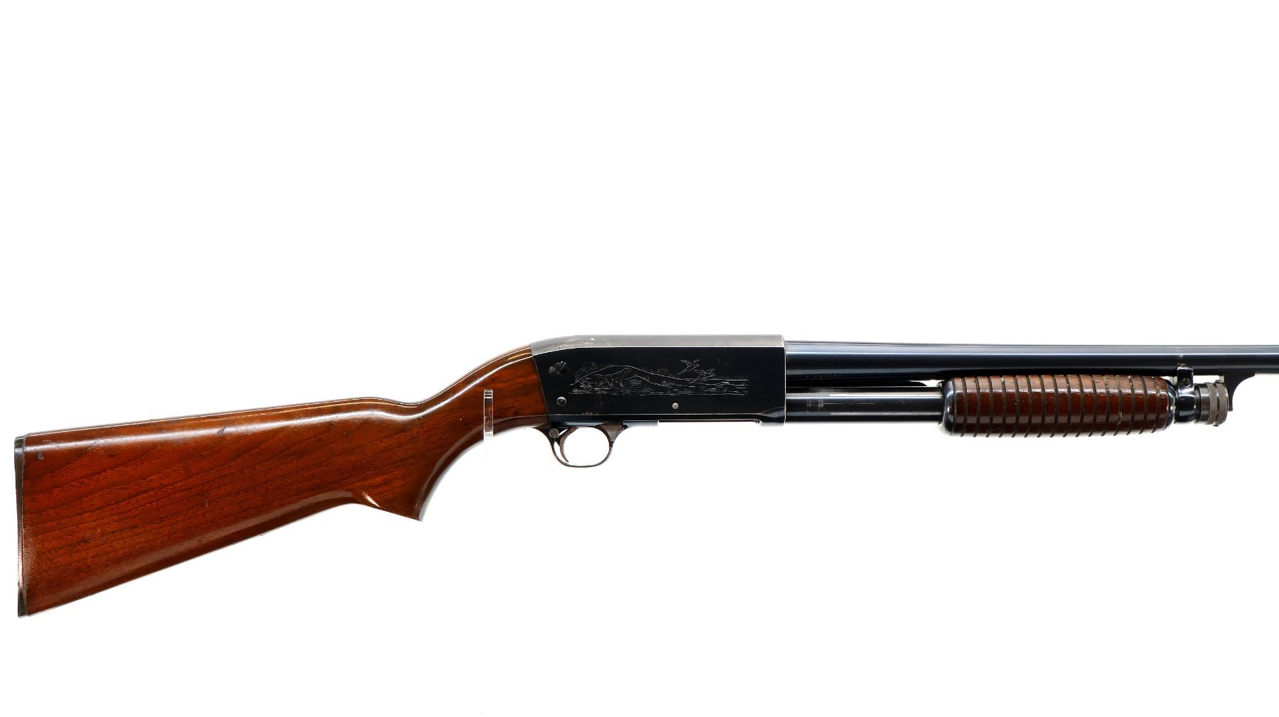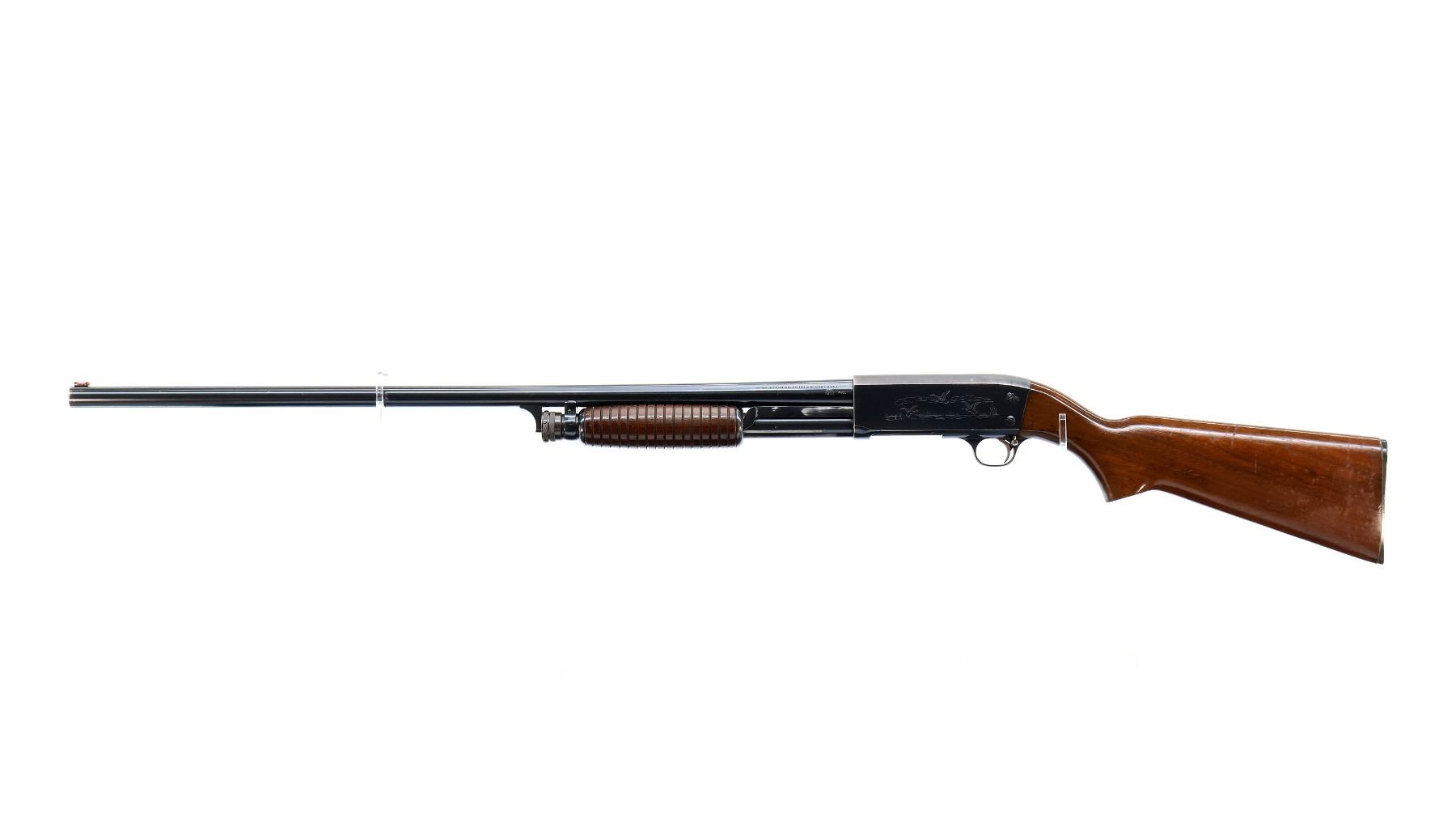 Main Description: Red fiber optic front bead, blued finish, round barrel, engraved receiver. Two piece wood stocks, grooved forearm, pistol grip cracked behind trigger guard, grooved black polymer butt plate