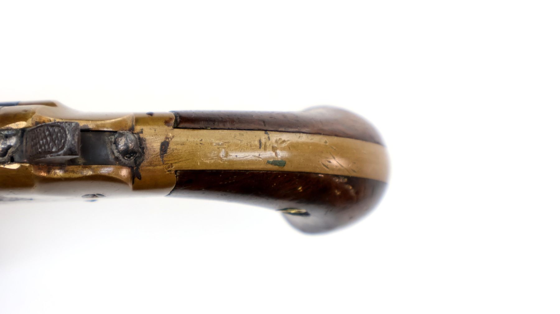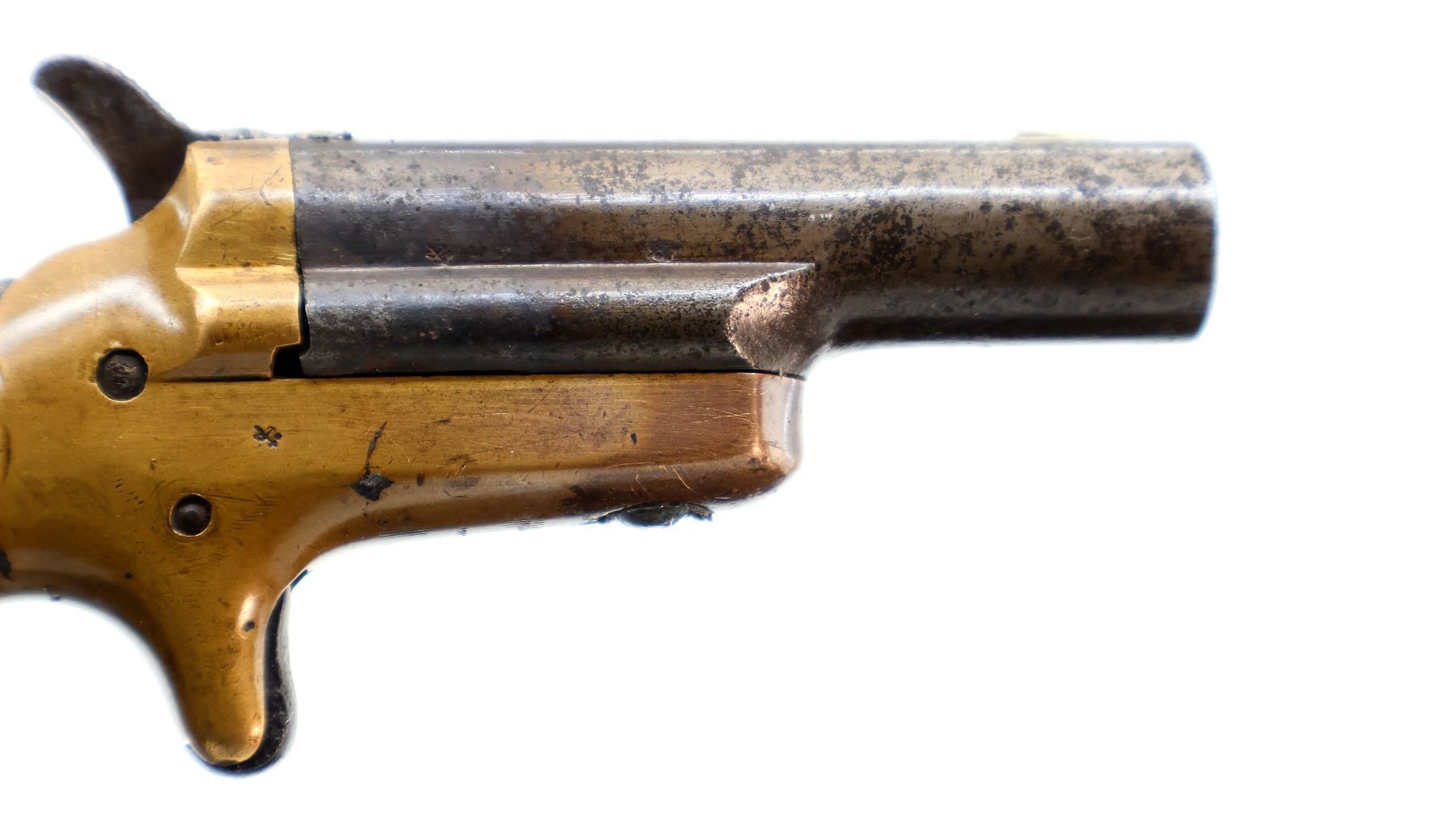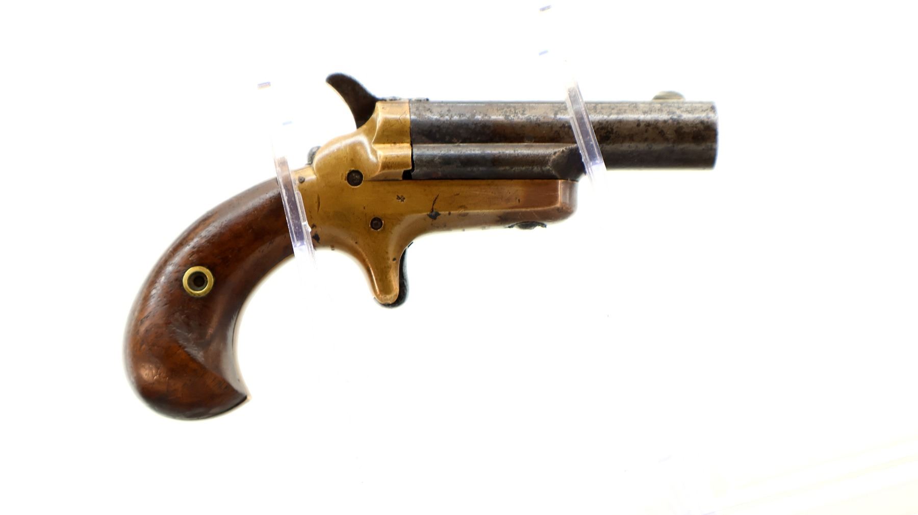 Main Description: This deactivation has three visible welds, action does not function, cannot be disassembled. Blade front sight, round barrel, checkered spur hammers and smooth trigger, brass frame. Two piece smooth wood grips.