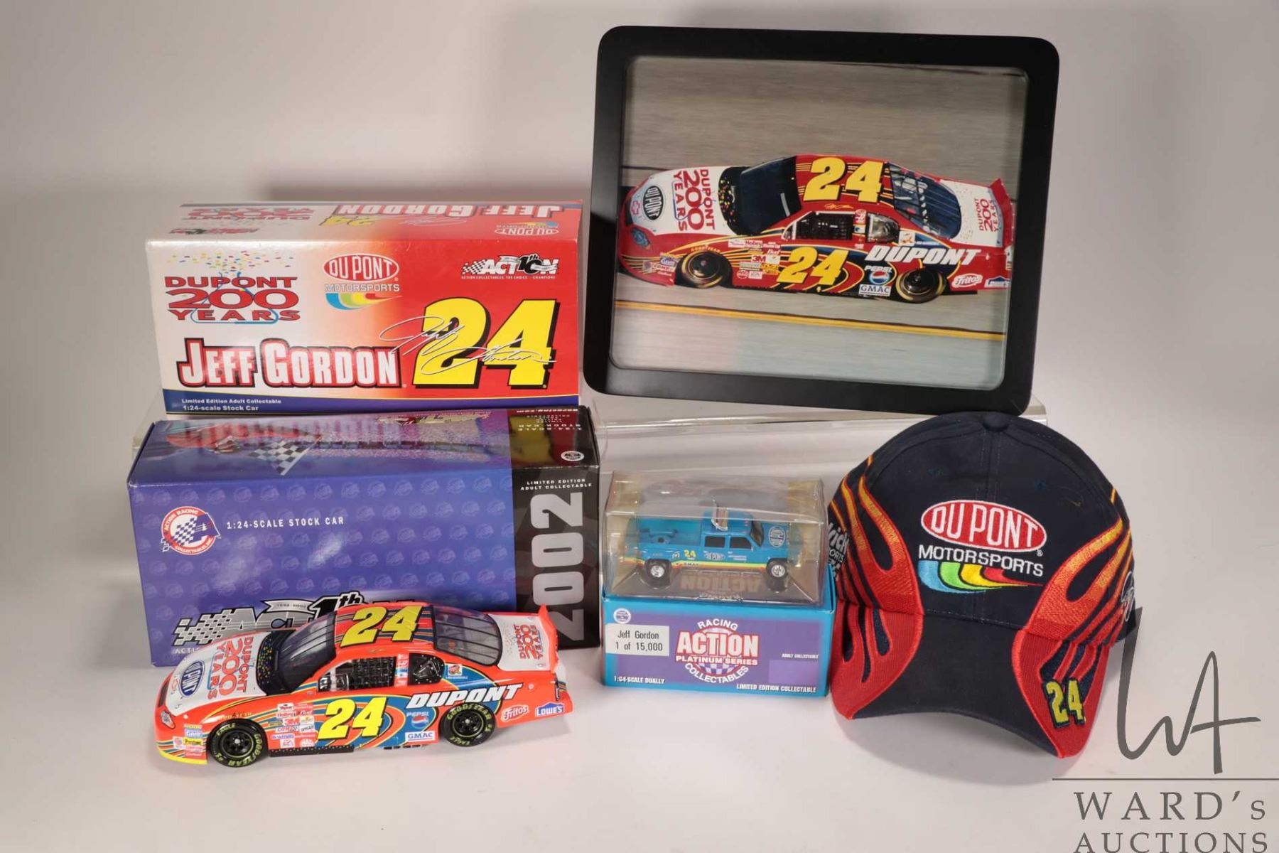 Jeff Gordon limited edition #24 Du-Pont 200th Anniversary Celebration 2002 Monte CArlo, one of 78,180 in 1: 24 th scale, Jeff Gordon 1: 64 scale Dually, one o f 15,000, Du Pont Motorsports hat and a framed colour 9" X 11" photograph