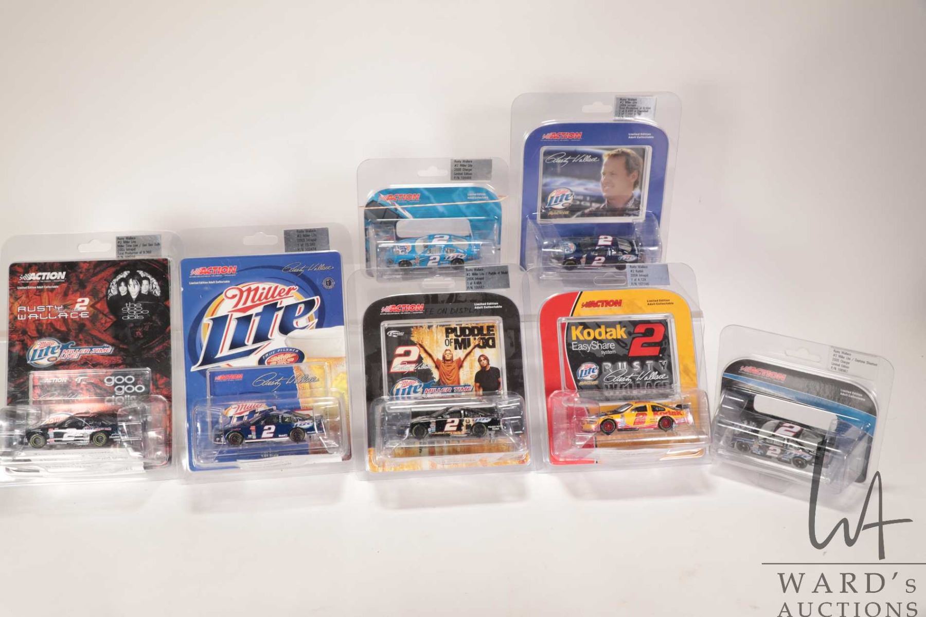 Seven 1: 64 scale Rusty Wallace Action die-cast collectible cars with assorted themes including rock bands, Kodak and Miller Lite etc.